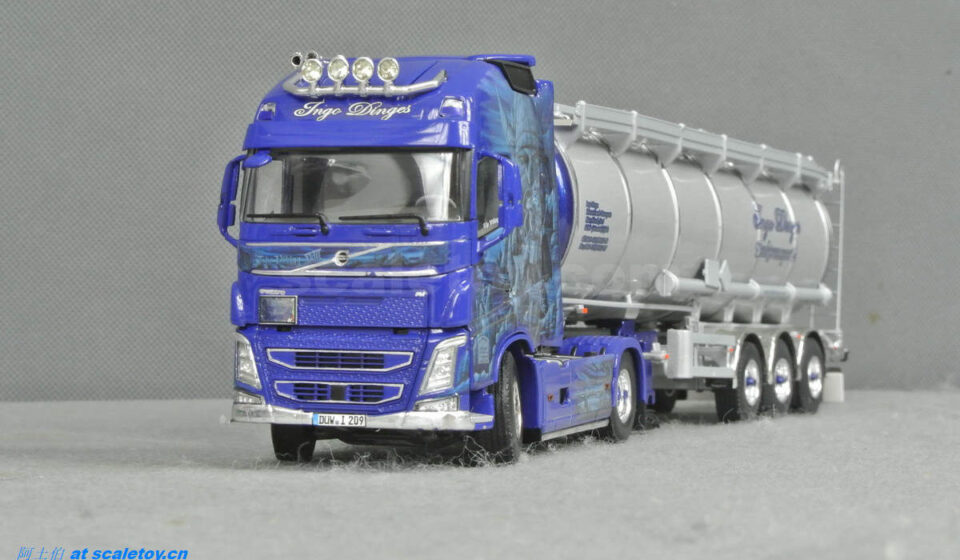 首先是一台沃尔沃FH4两轴拖头挂三轴槽罐车模型,由WSI出品,编号01-1551,模型比例1/50。车牌号德国DüWI 209,涂装为The Viking XVIII。