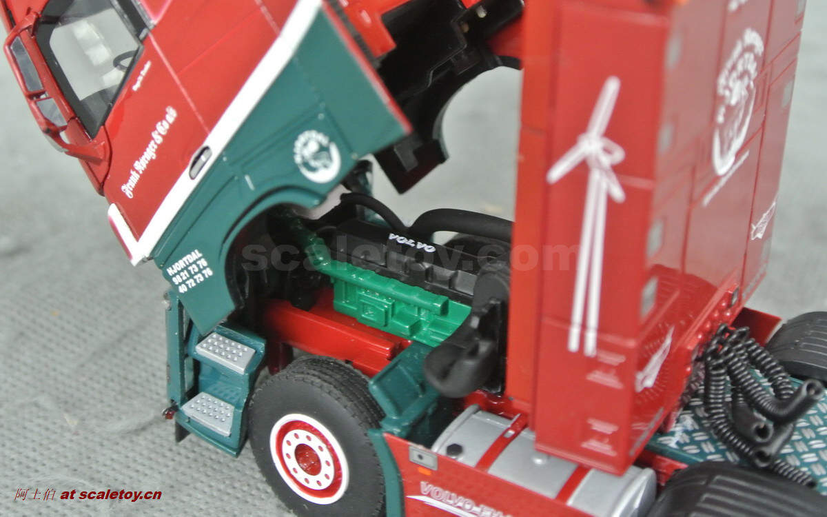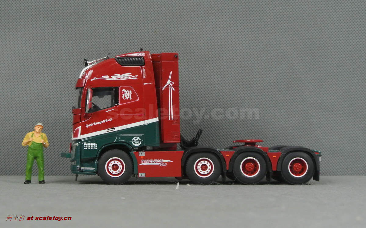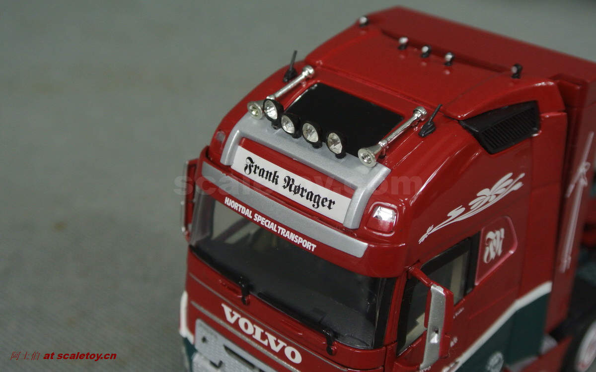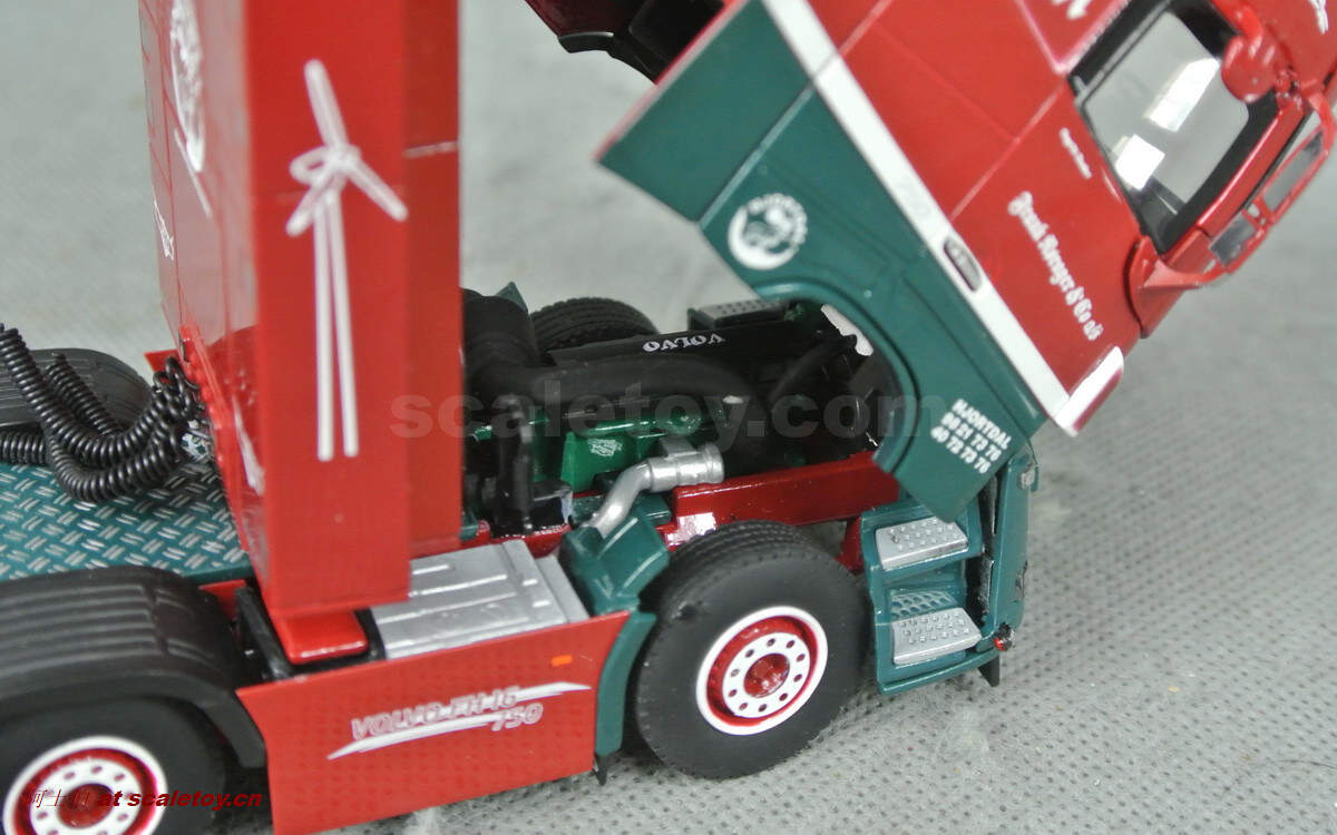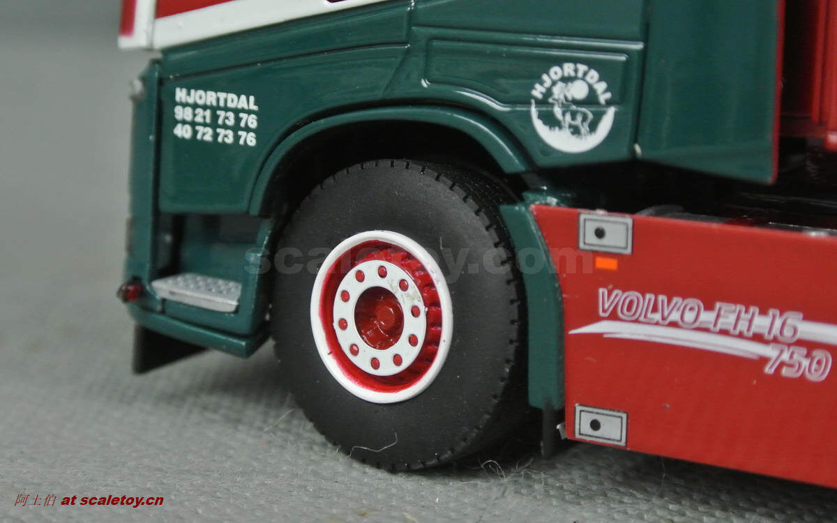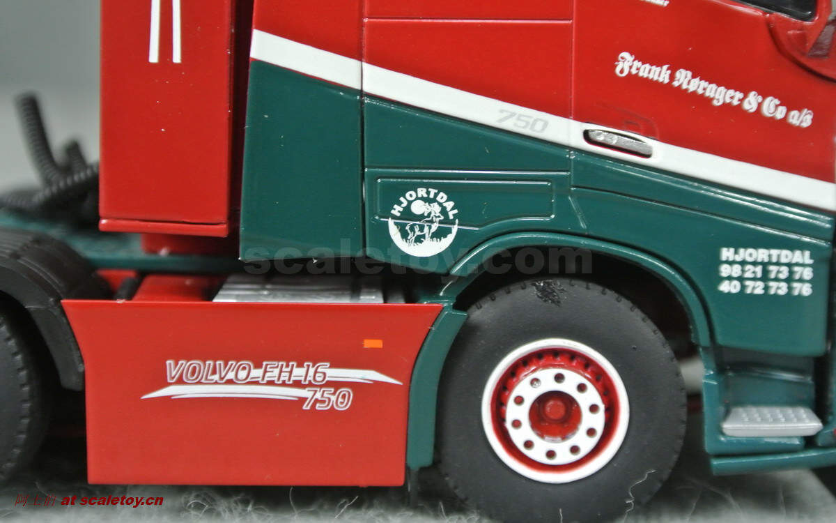 驾驶室侧面的各种字样和logo都有不错展现;拖头型号为VOLVO FH 16 750马力,够劲