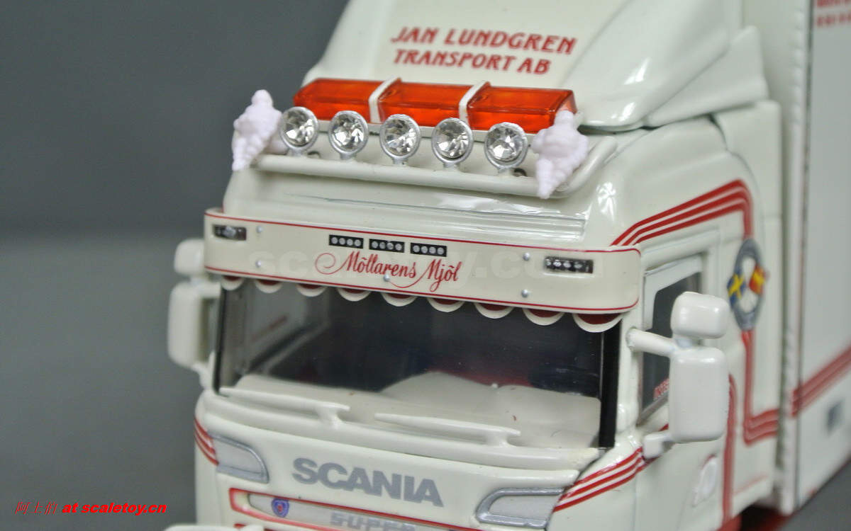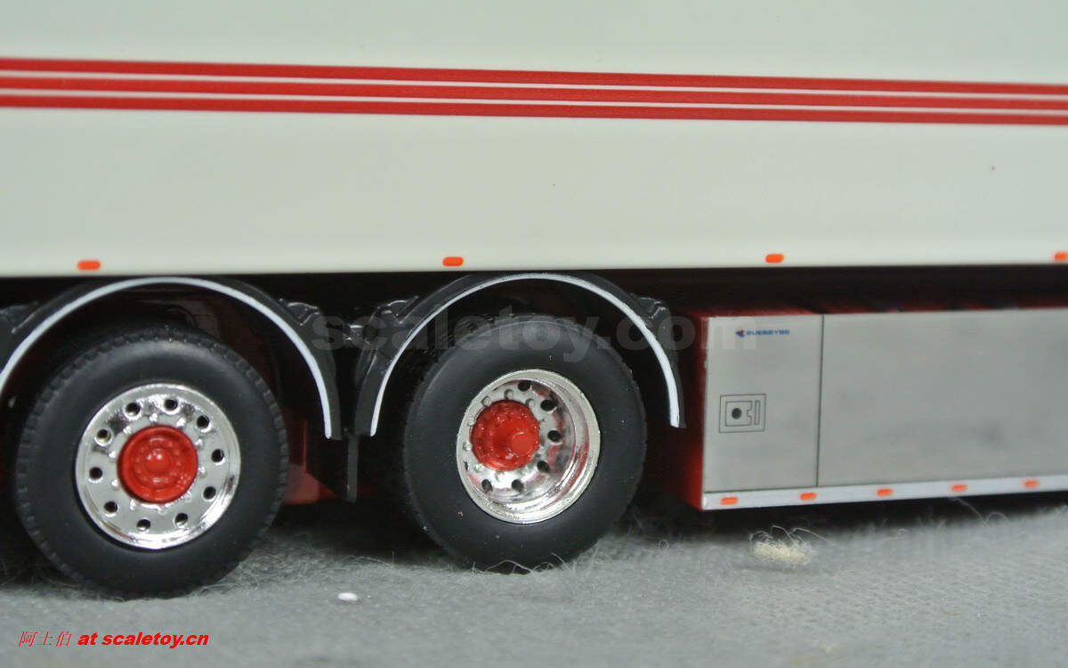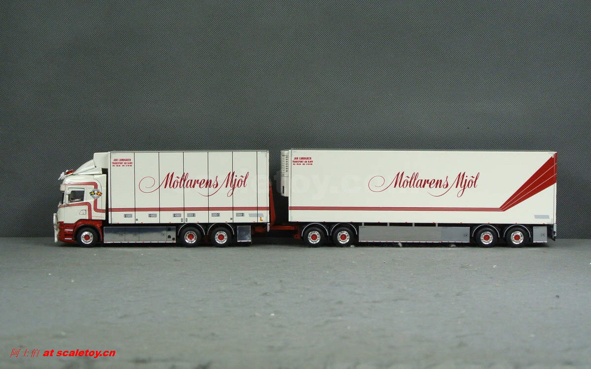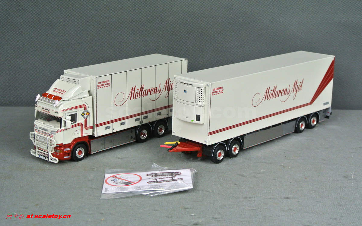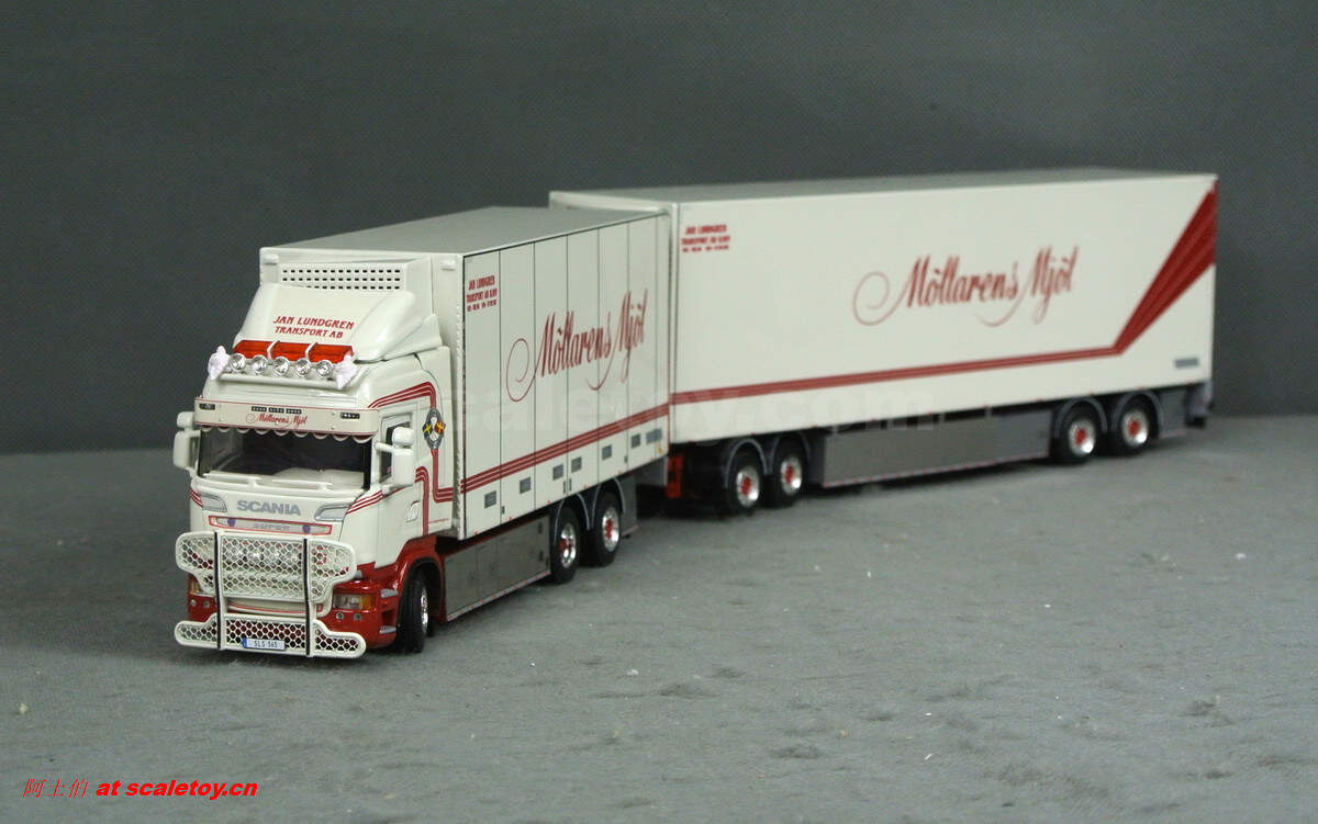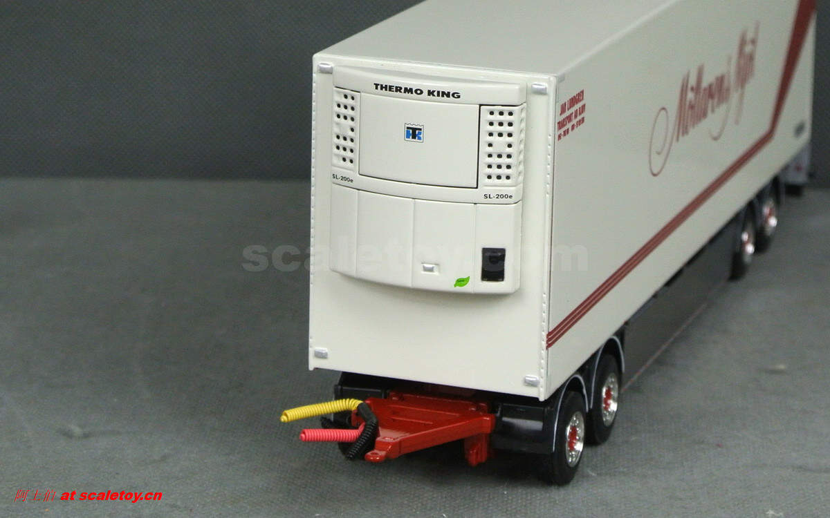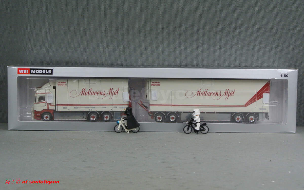 WSI推出了这家公司涂装的一款车辆模型,前车为一台SCANIA STREAMLINE HIGHLINE 6×2,后车为四轴冷藏挂车。模型编号01-2229,比例1/50。