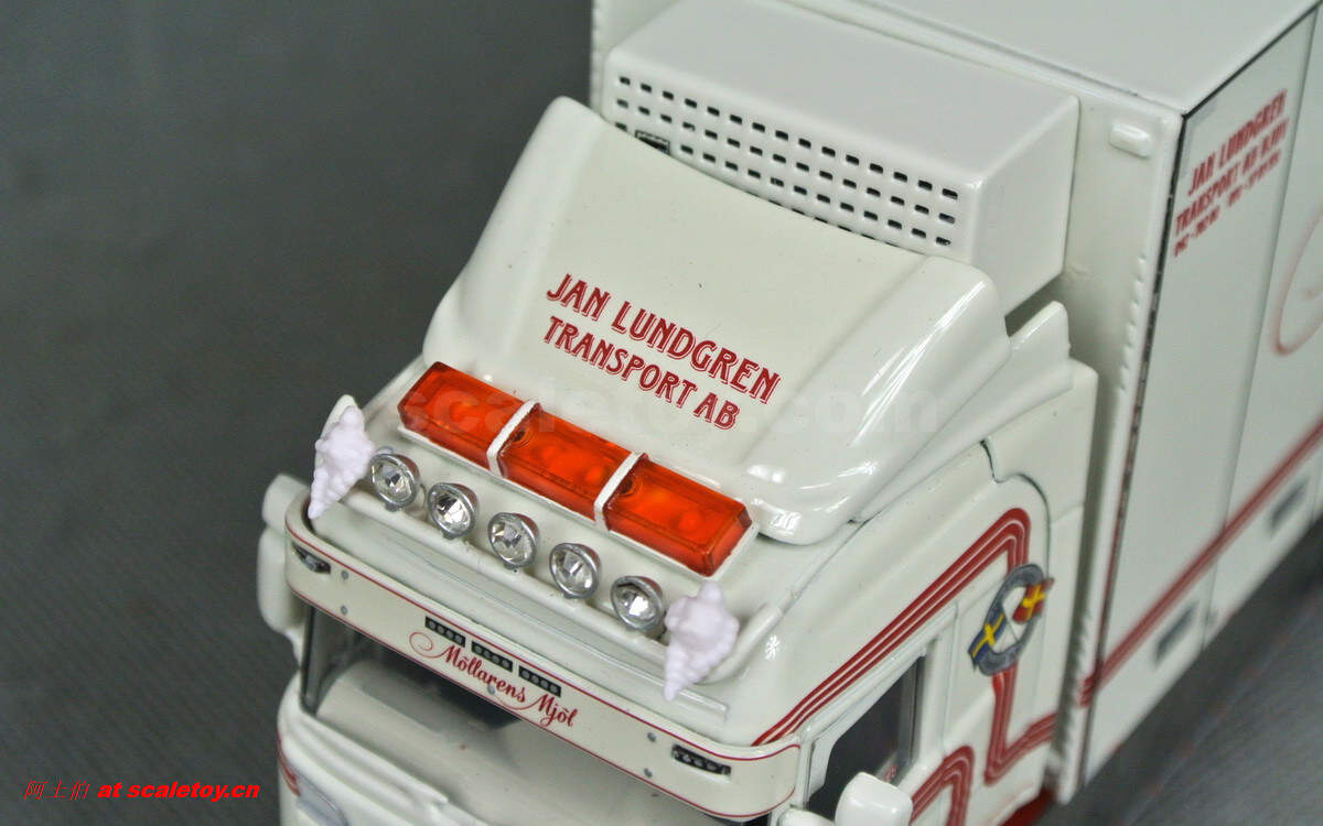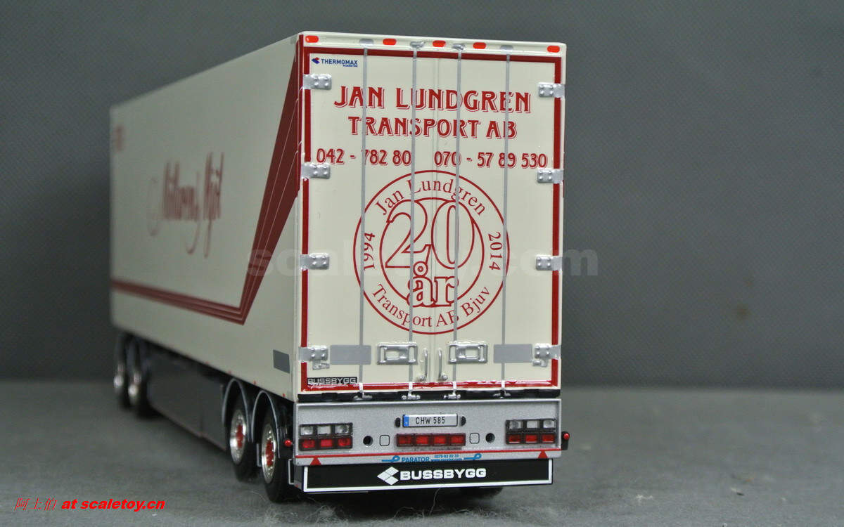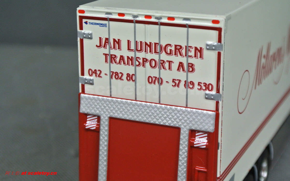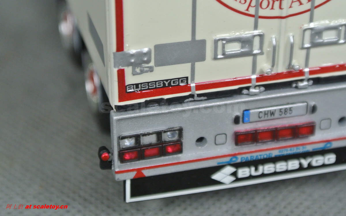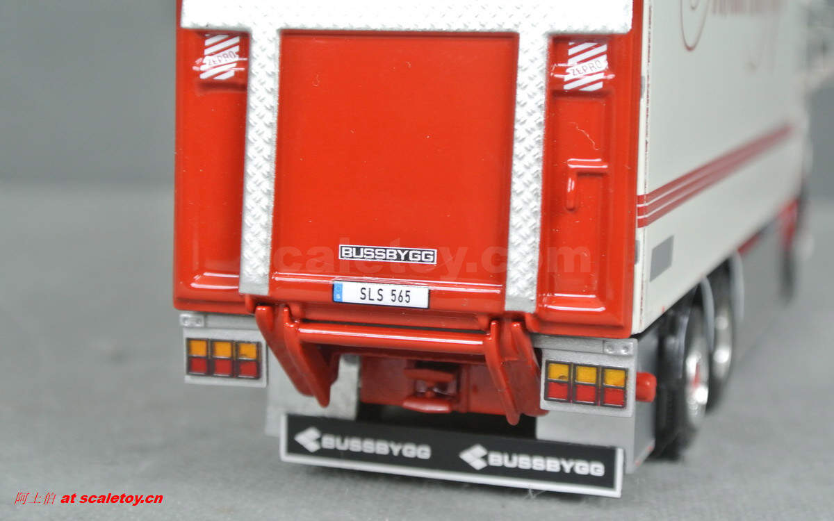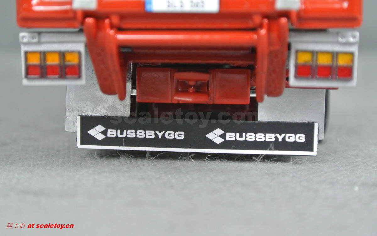 尾部门上是公司名称和联络方式。翻板结构不能运作。尾灯车牌等细节都有表现。挡泥板上的BUSSBYGG是一家挪威公司,专门制作卡车的厢体。
