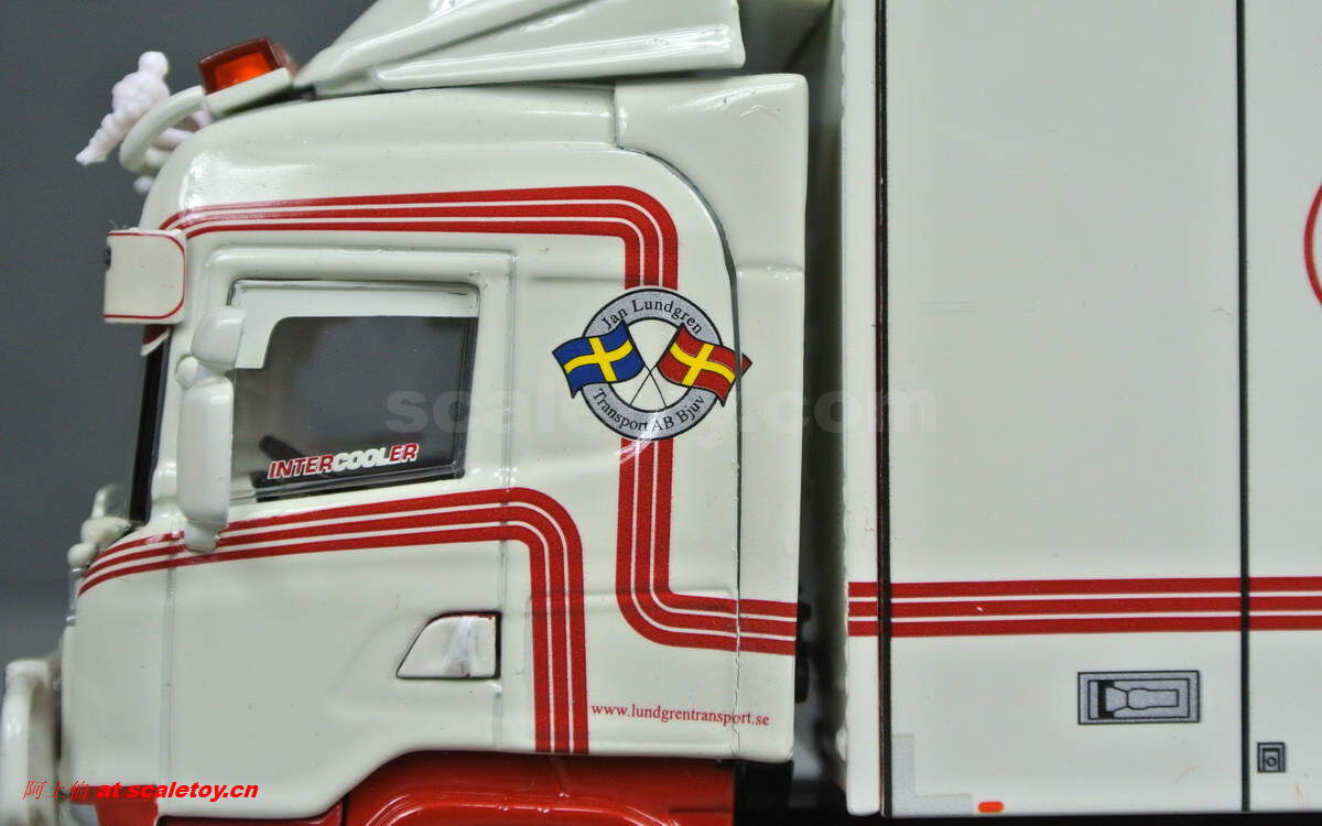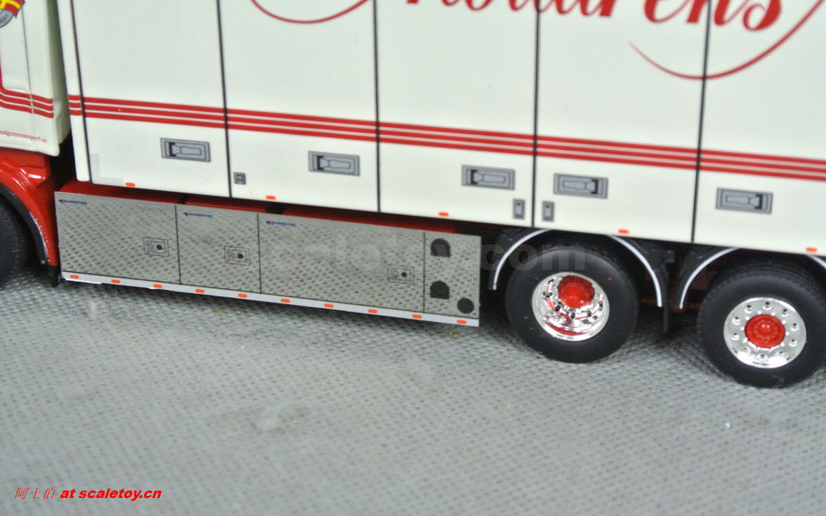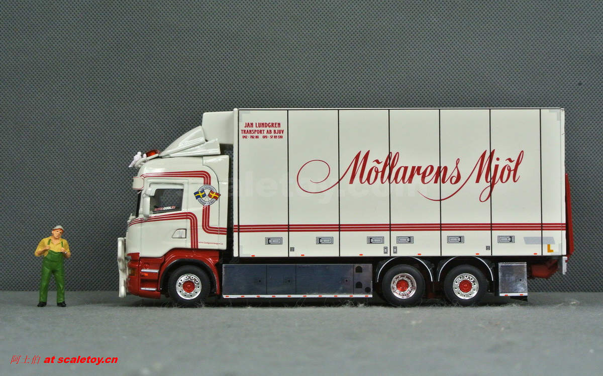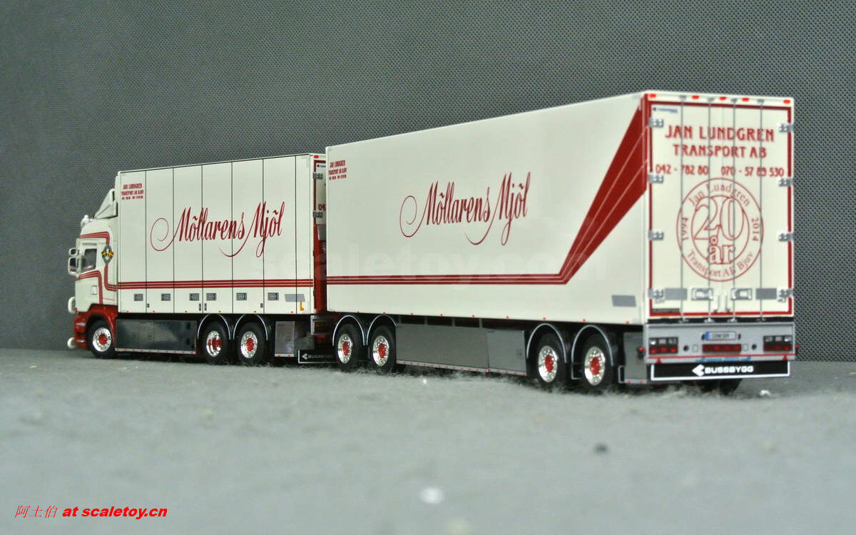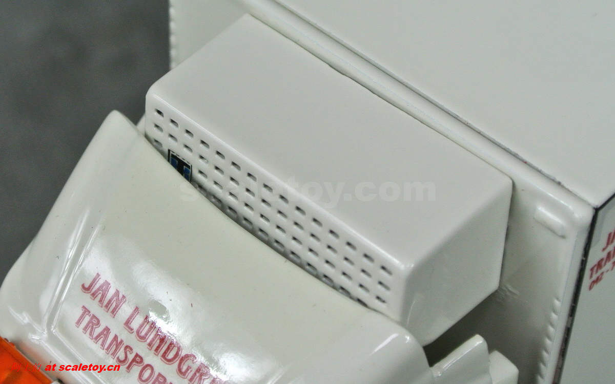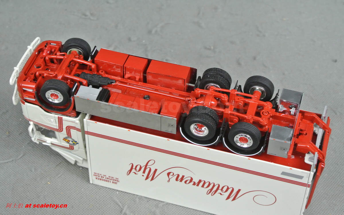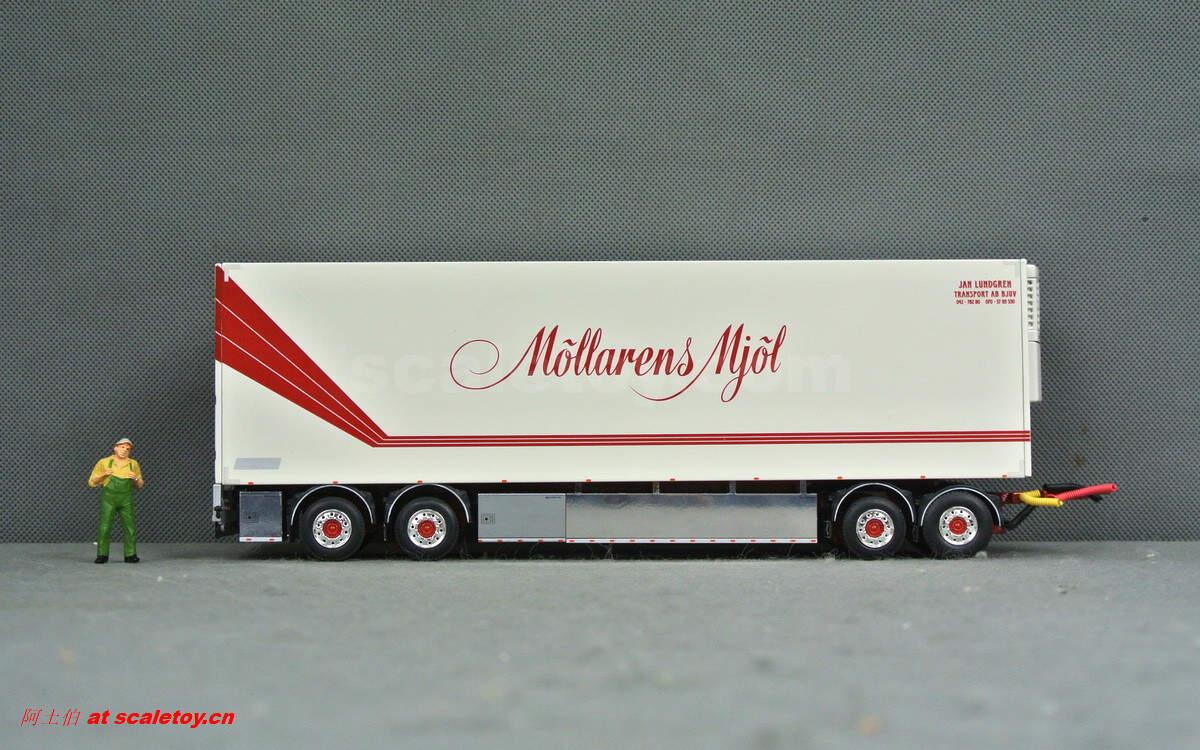 尾部门上是公司名称和联络方式。翻板结构不能运作。尾灯车牌等细节都有表现。挡泥板上的BUSSBYGG是一家挪威公司,专门制作卡车的厢体。