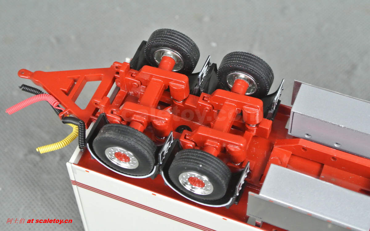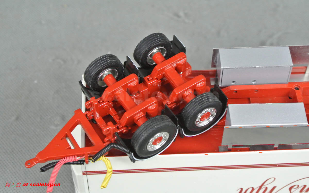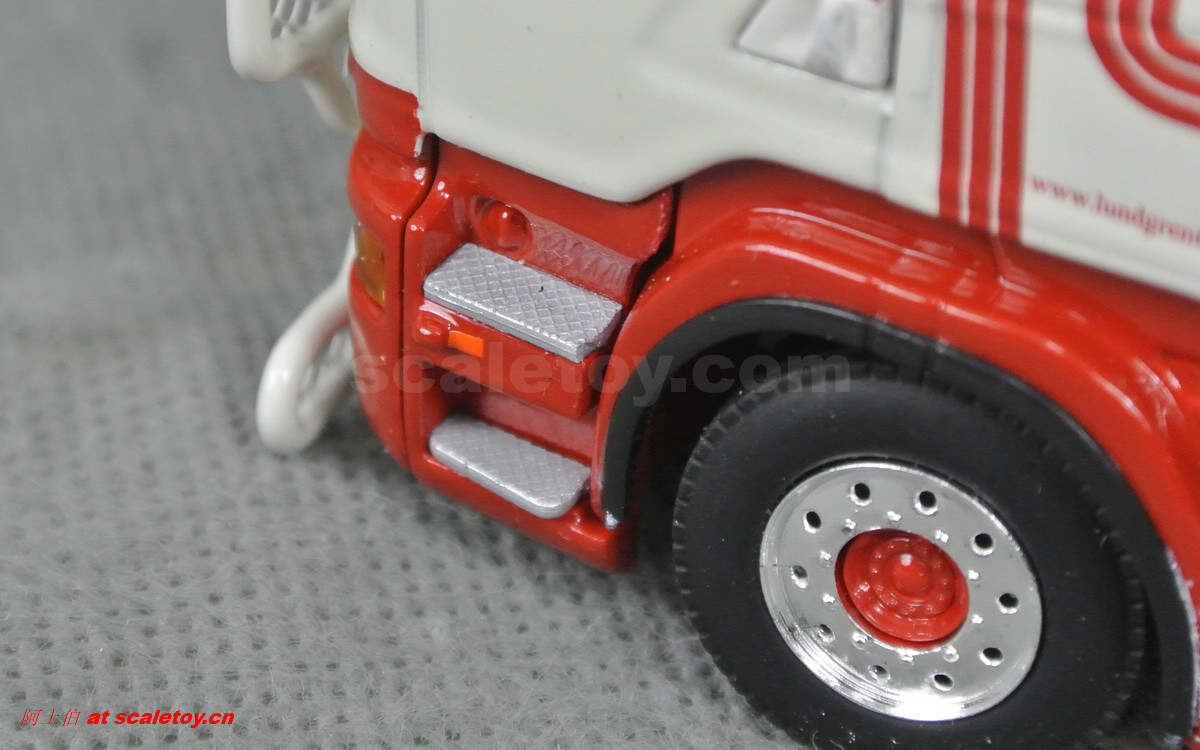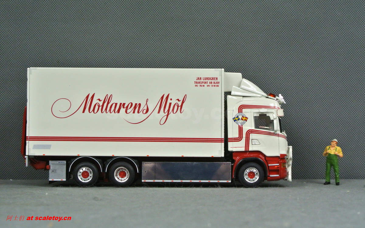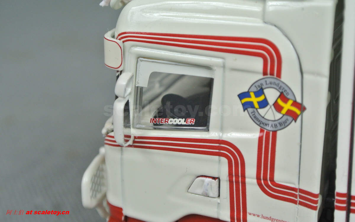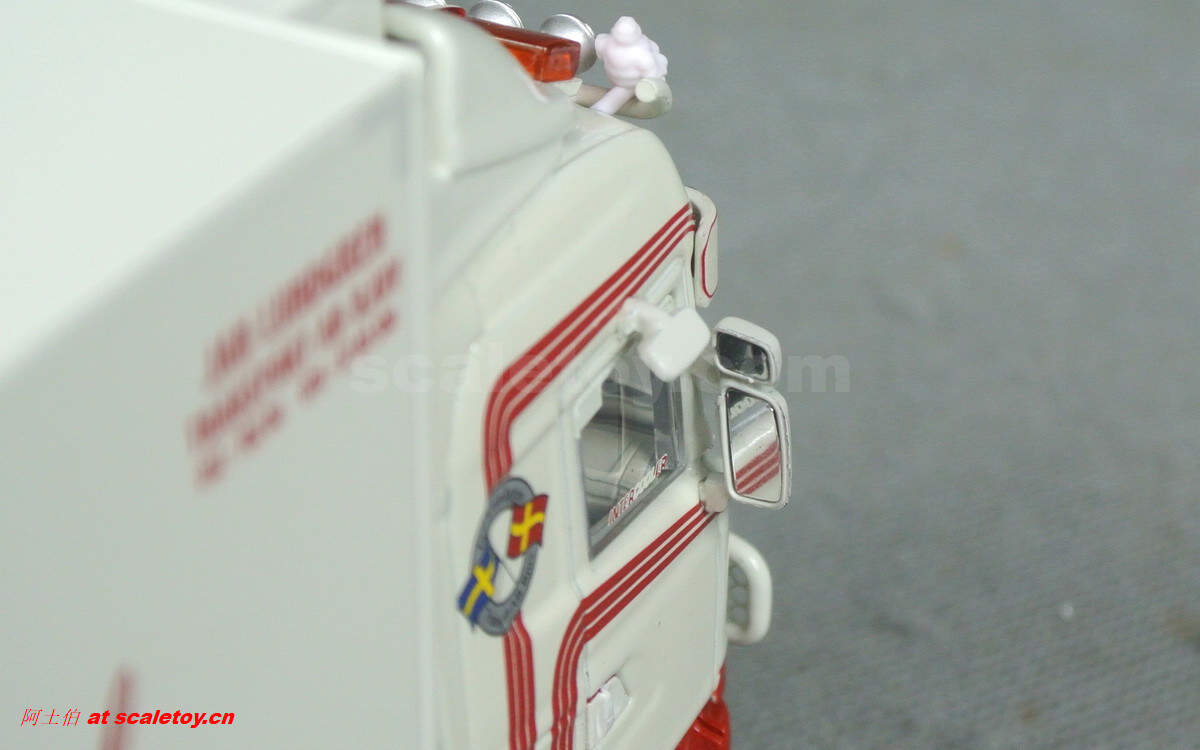 尾部门上是公司名称和联络方式。翻板结构不能运作。尾灯车牌等细节都有表现。挡泥板上的BUSSBYGG是一家挪威公司,专门制作卡车的厢体。