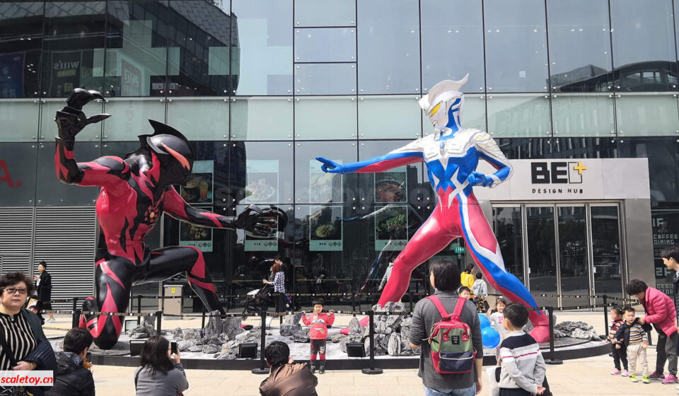 还在商场外就能看到两位正邪奥特曼正在PK: