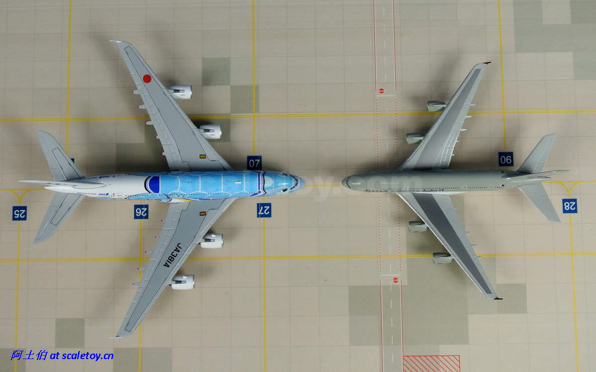 按照A380的尺寸,长度72.72米,翼展79.75米;如果是1/400比例则是大约20厘米的翼展;如果是1/500比例则是大约16厘米的翼展。还是有比较明显的大小差异的。直观的感受一下不同比例的飞机尺寸,右侧出镜比较的是HERPA出品的卡塔尔航空涂装A380模型,比例1/500。
