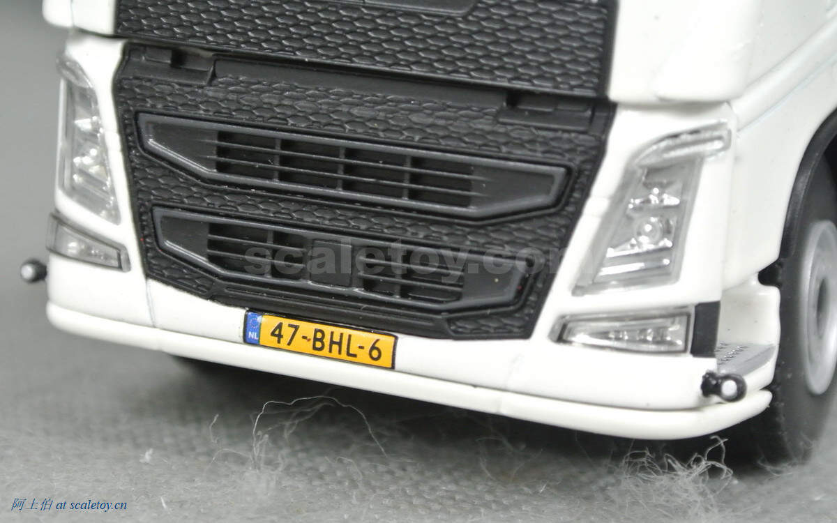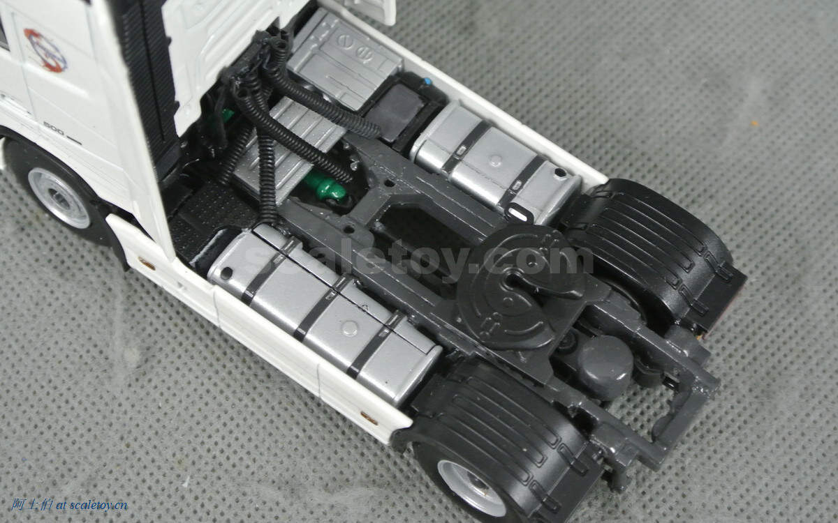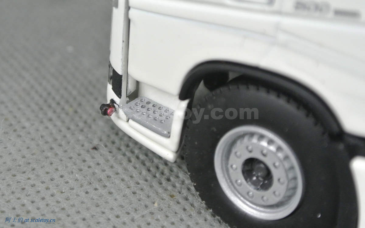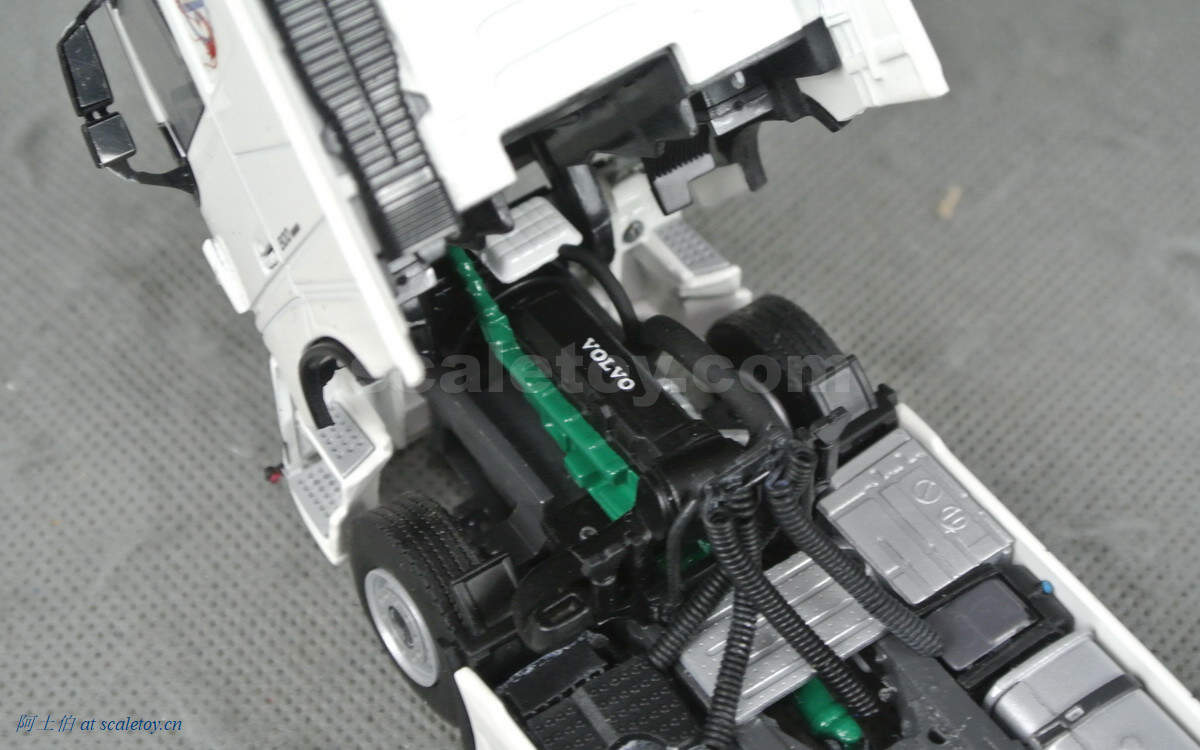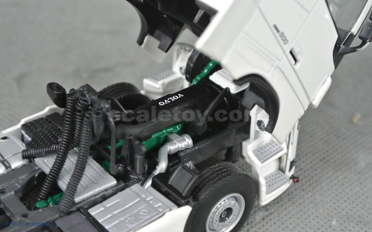 掀开车头,露出VOLVO的发动机。并且看到驾驶室攀登踏板是有第二级的;在驾驶室正常位置看不到,实际也是需要打开车门才会露出。