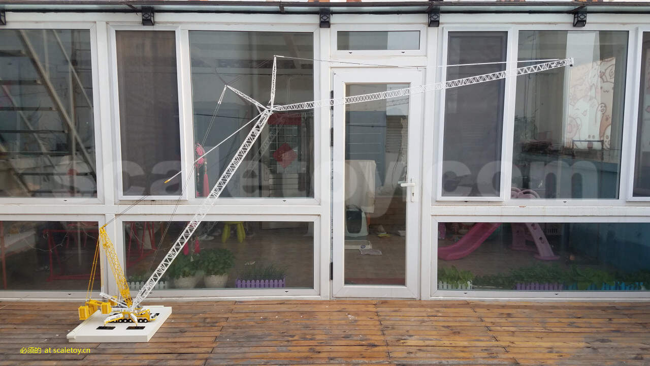 还是电钻驱动卷扬拉起,按实际200M工况,我本想升到模型四米位置,我在站在阳光房上拍一张,无奈当天风太大,吹的桁架来回摆动,1750上车跟着转,总要去扶一扶车