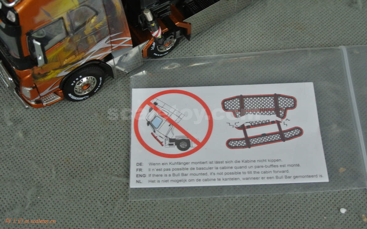附带了Fassi随车吊的组装说明,以及前方牛栏严禁翻起驾驶室的警告卡片。