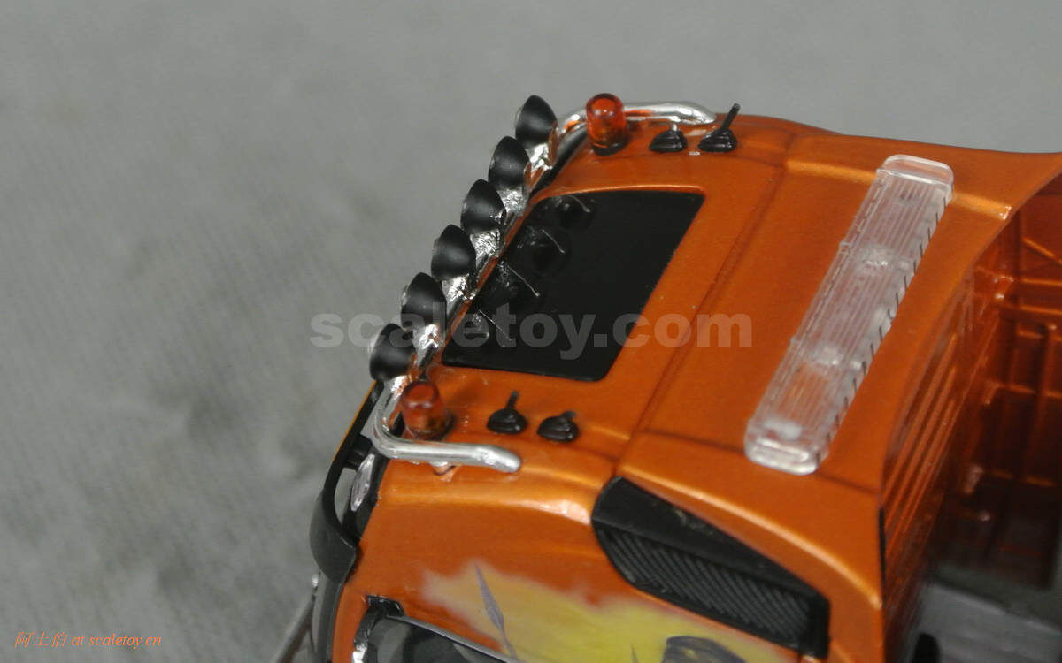 车顶,密布的附件,大天窗,四个小天线,警示灯,警示灯条,加装的头灯带,等等细节。