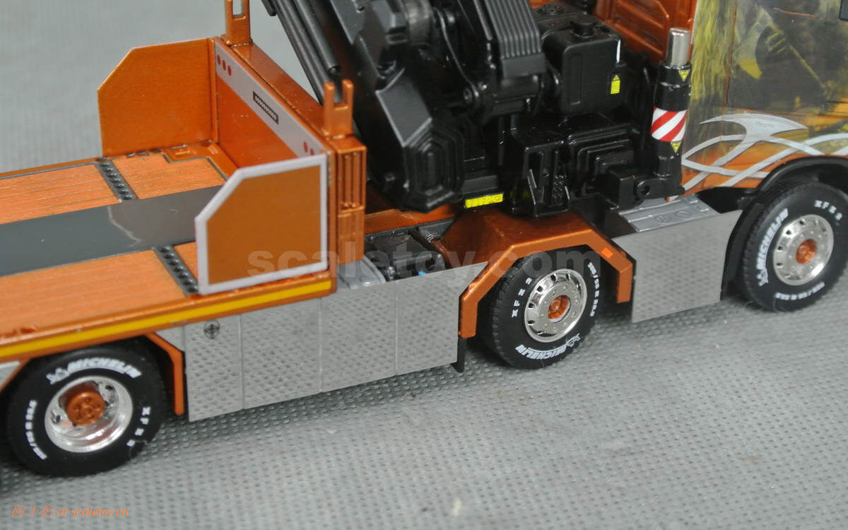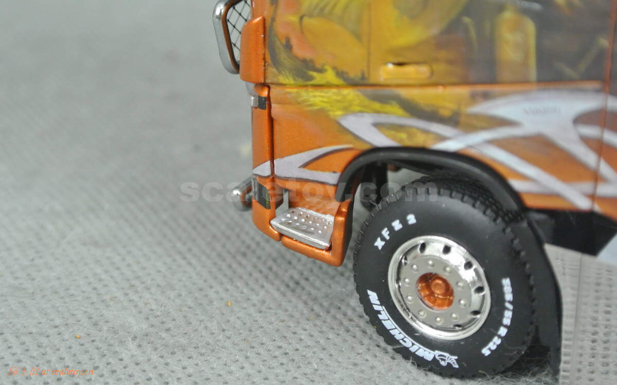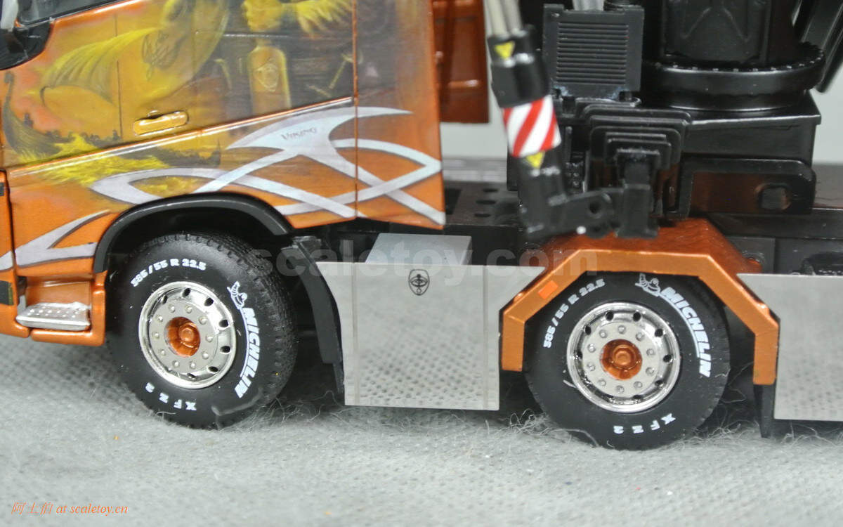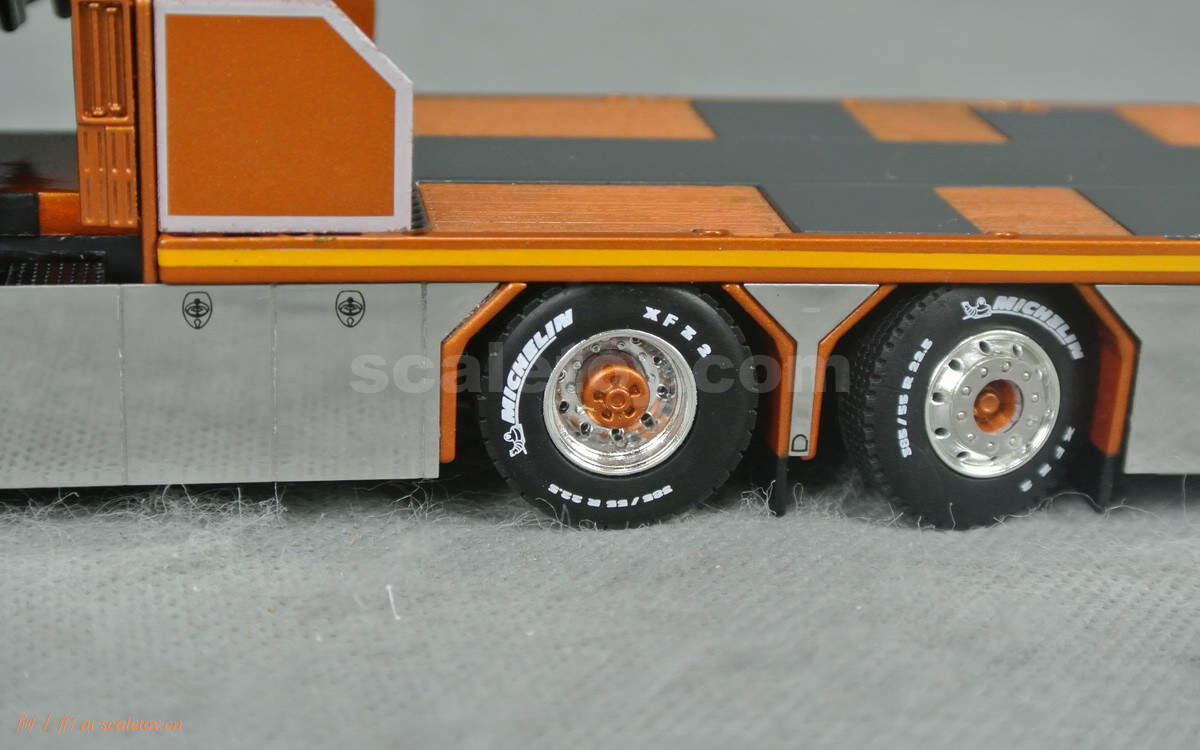 前后轮胎轮毂,细节清晰,轮胎有米其林花纹字样,多数侧面为电镀漆板围绕。