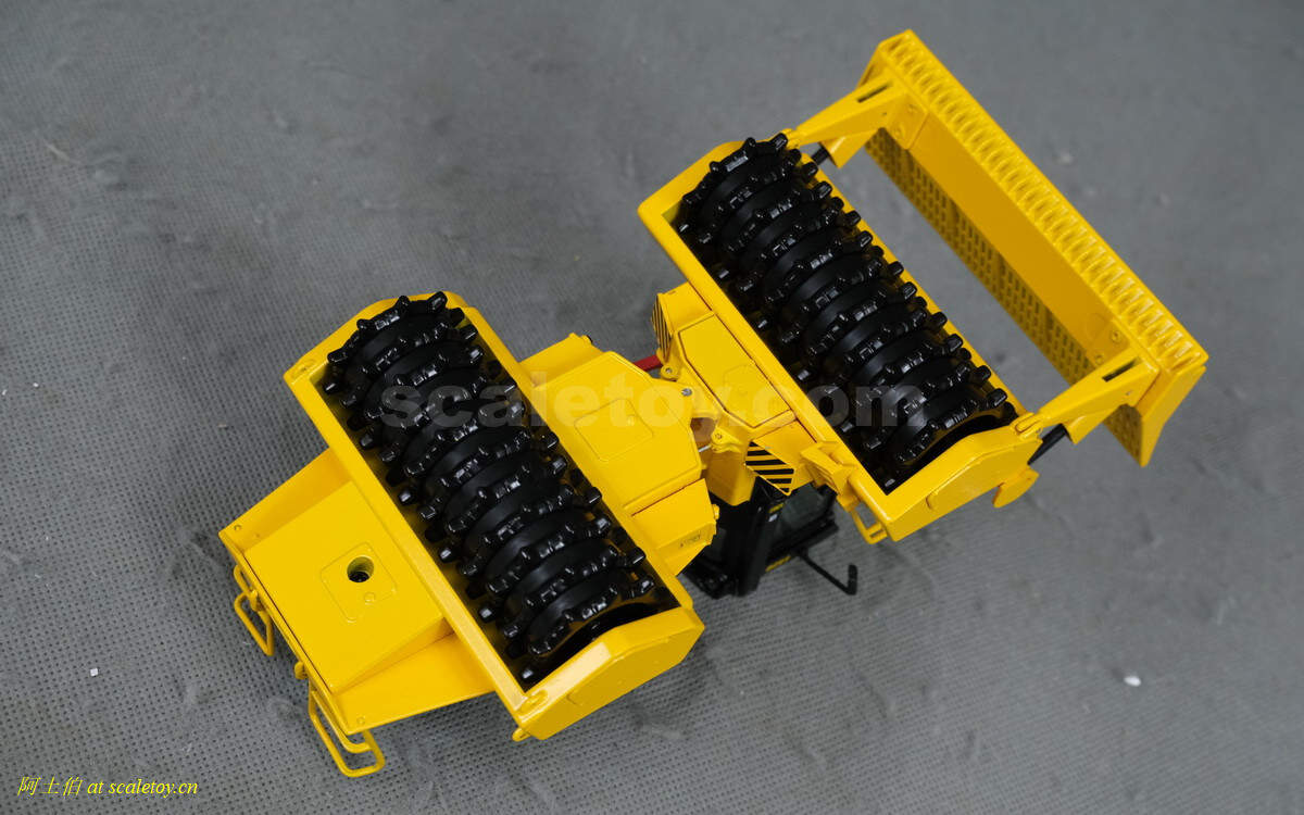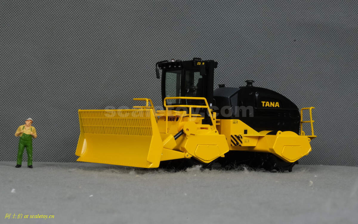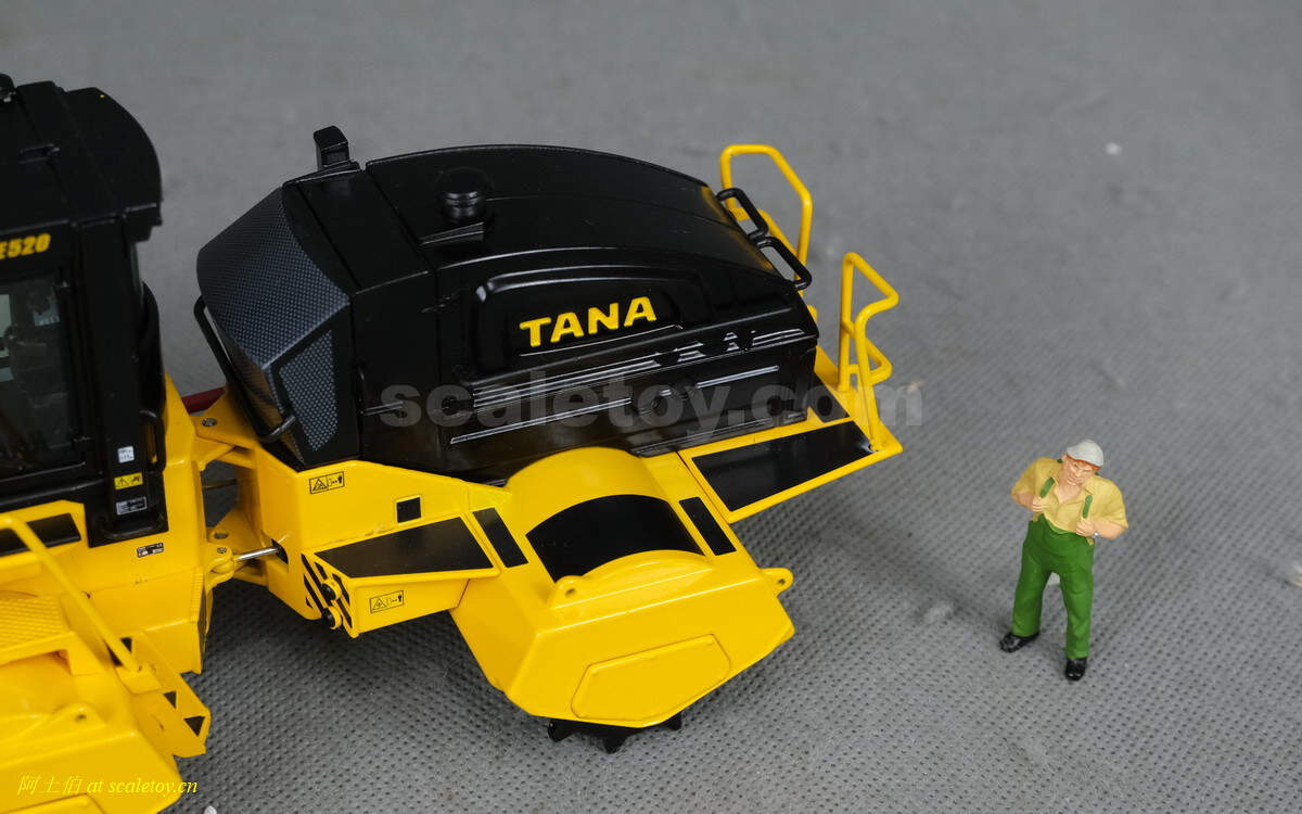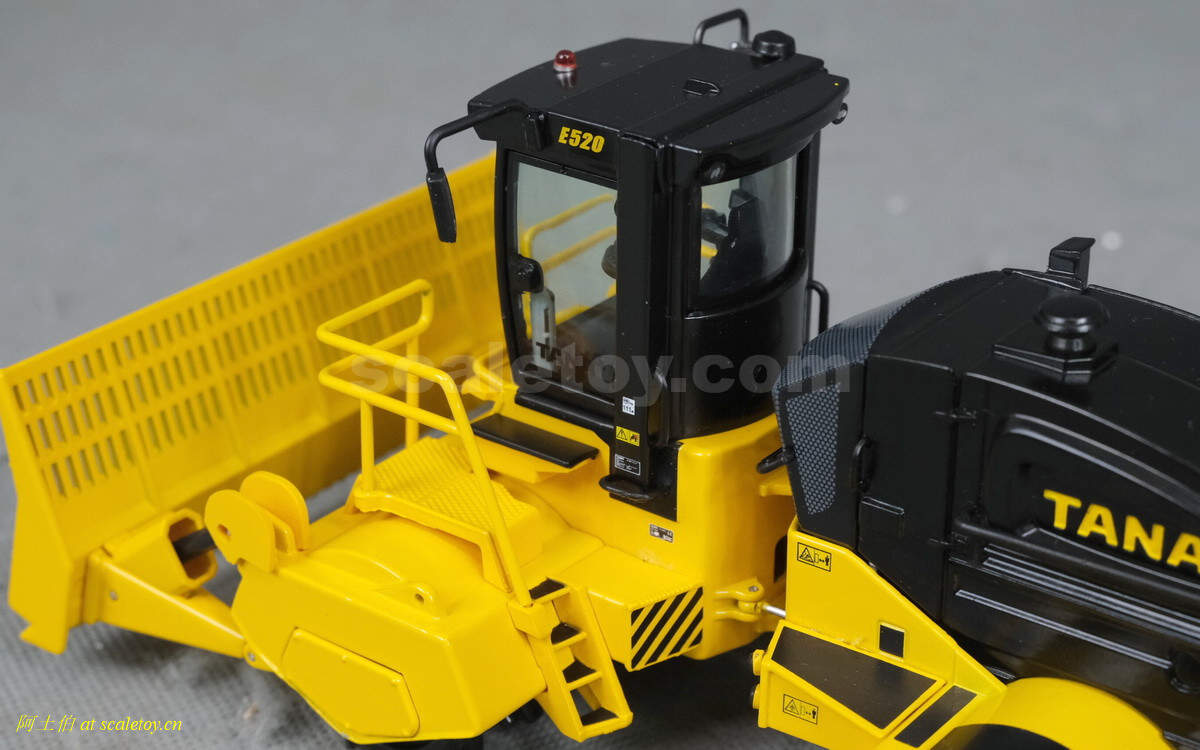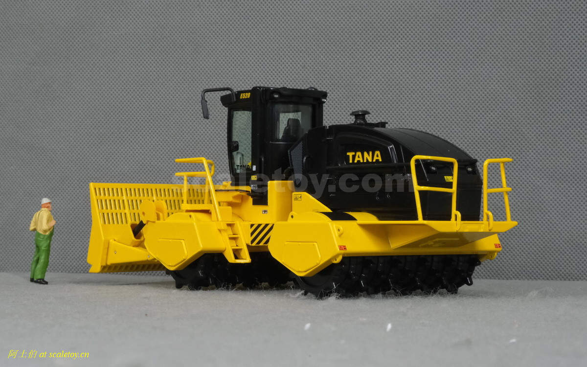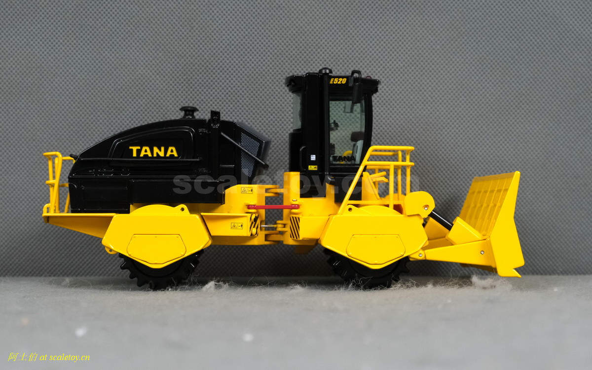 模型对应的是TANA E520型号,属于TANA产品线里面较大型的一款,自重52吨,长度9.23米,宽度5米,高度4.32米,最大压实强度255千牛。前面的推铲宽5米,高1.96米。两个压实滚轮宽3.8米,每个滚轮上面有110个20厘米高的压齿。工作时速5-7公里/小时。