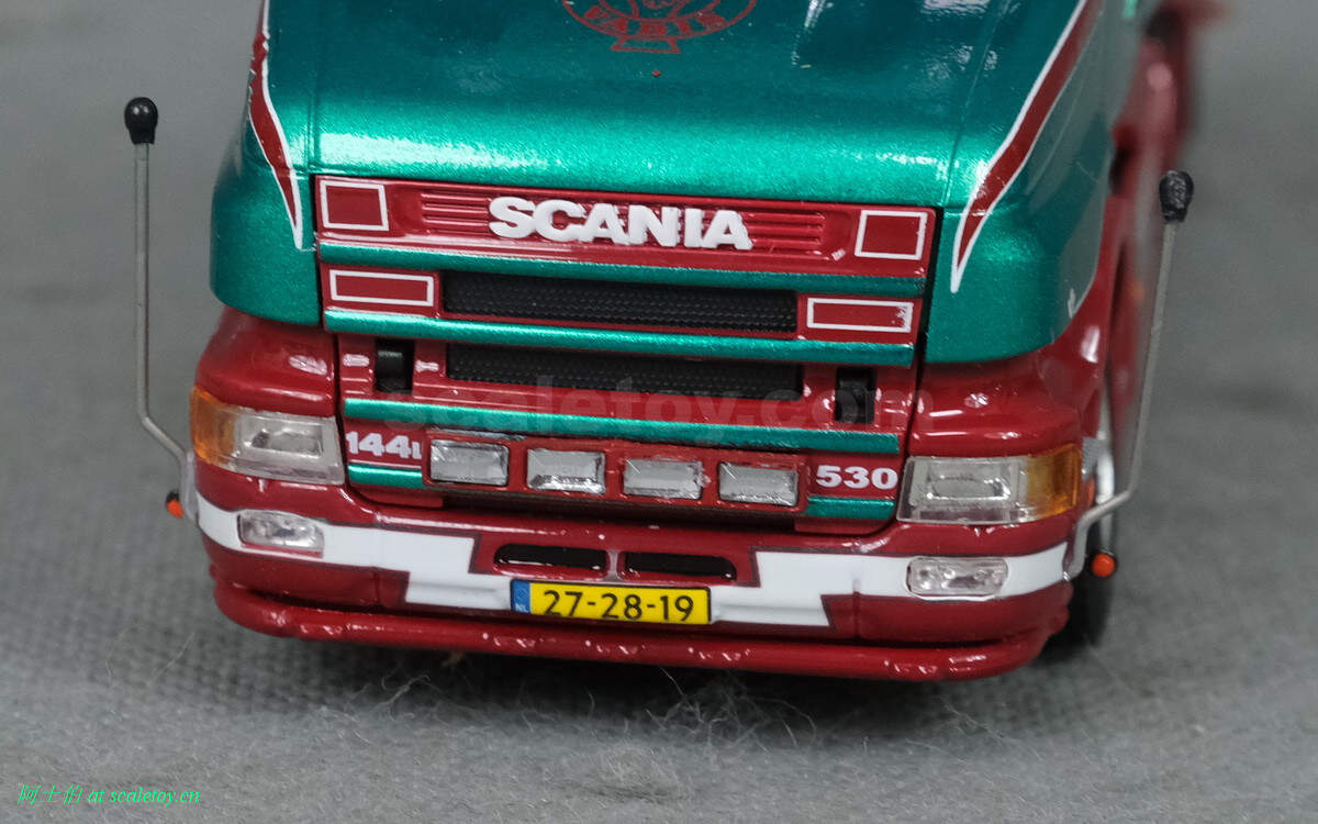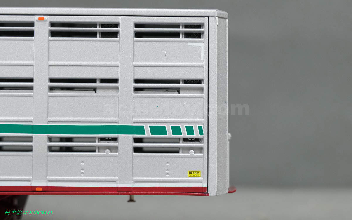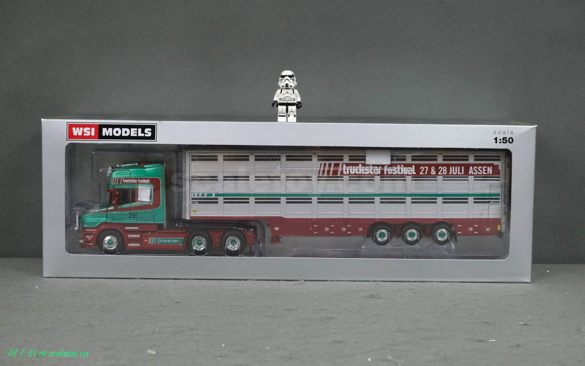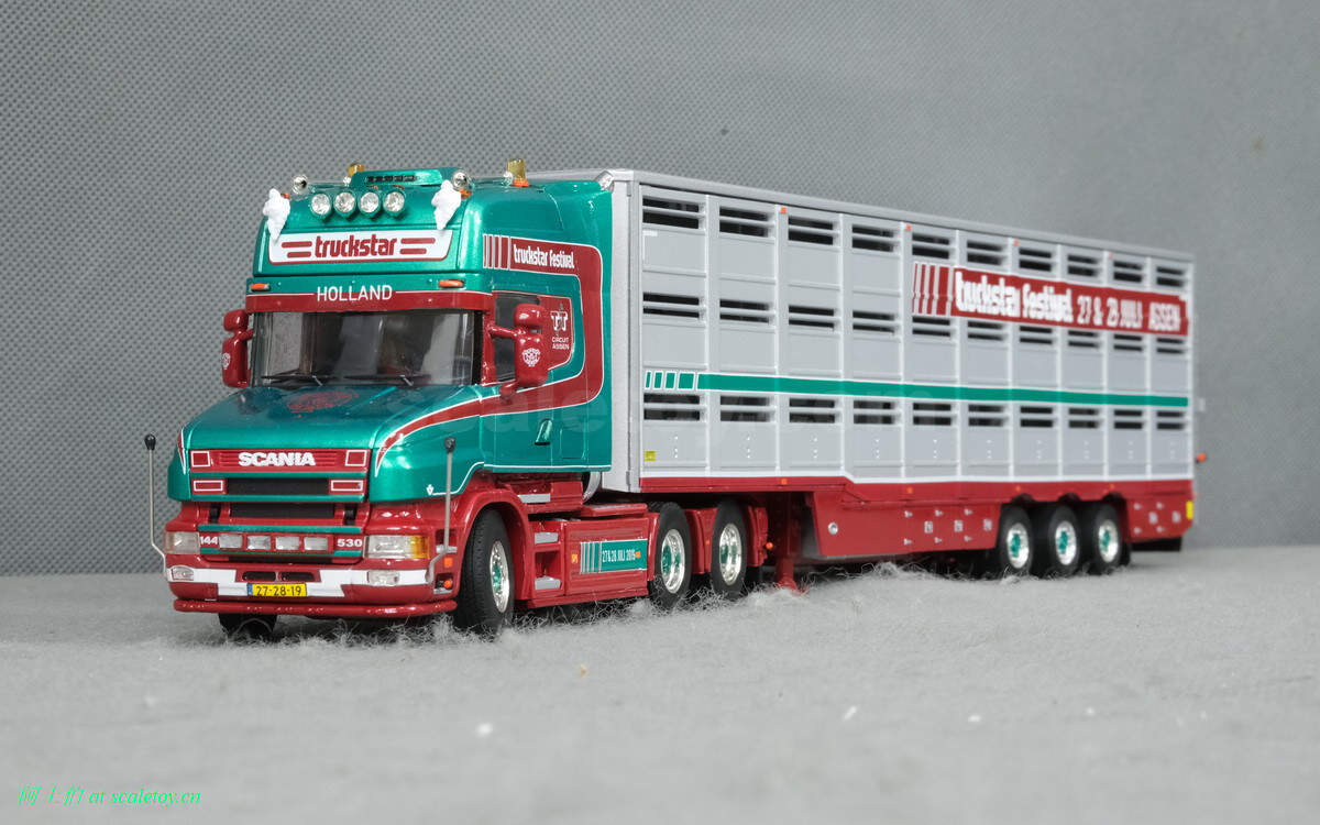 而本年WSI的展会模型则是一台斯堪尼亚4系列的鱼雷长头Topline 144-530,挂一台三轴的Berdex牲畜运输挂车。模型编号01-2881,比例1/50。