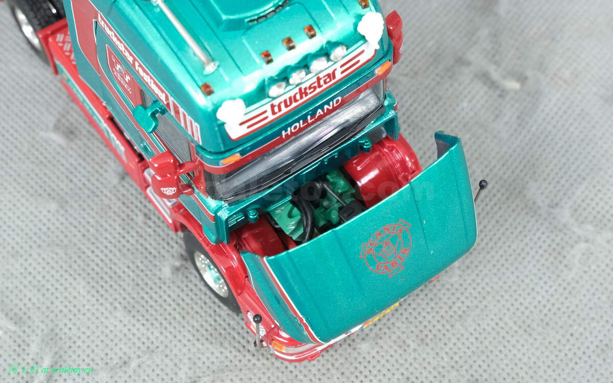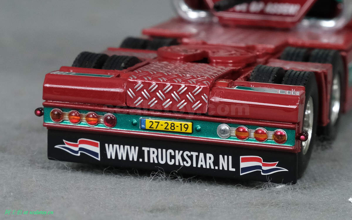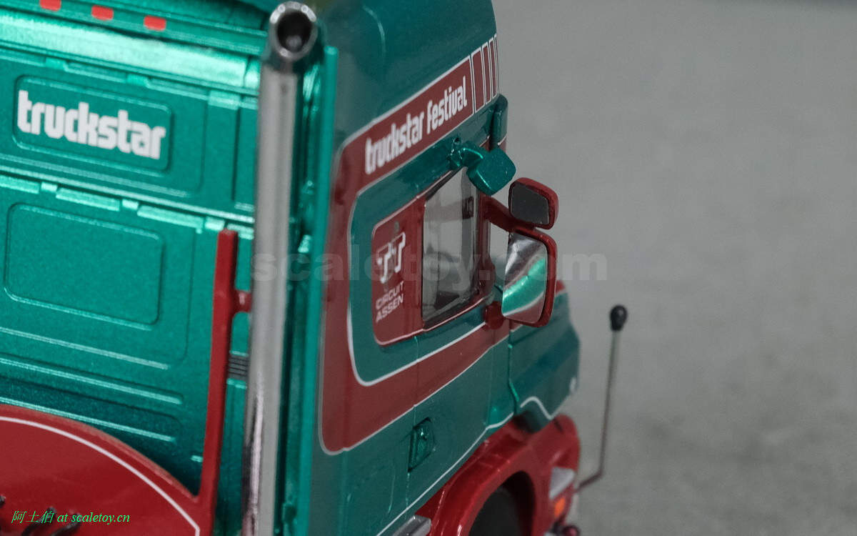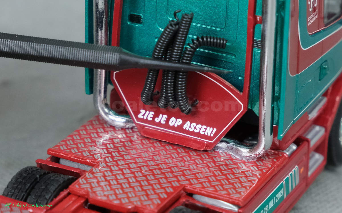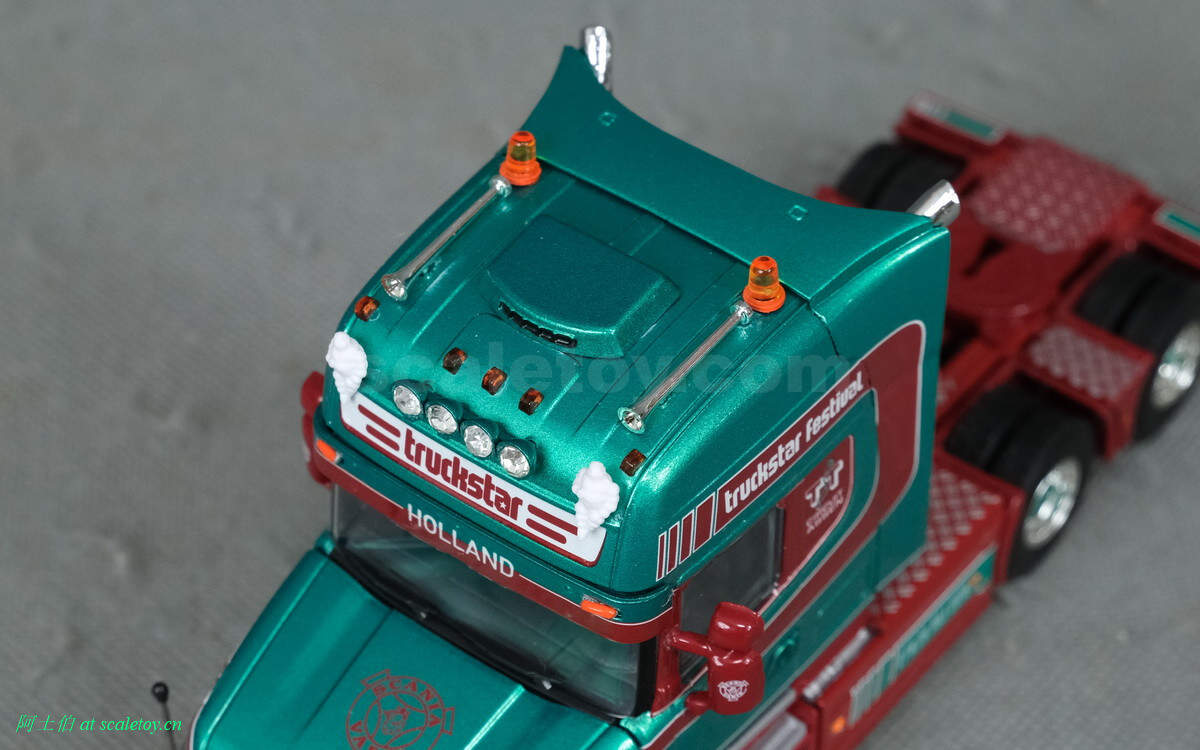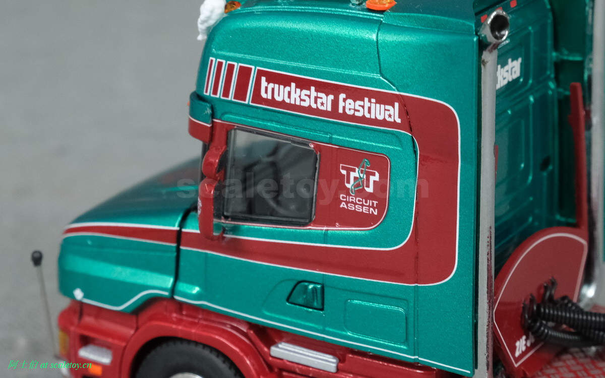 驾驶室背后,truckstar字样,双排气管比较酷的。连接线缆那个位置写的是荷兰语ZIE JE OP ASSEN,意思是“在ASSEN看到你”,就是希望大家光临车展关心卡车文化啦!