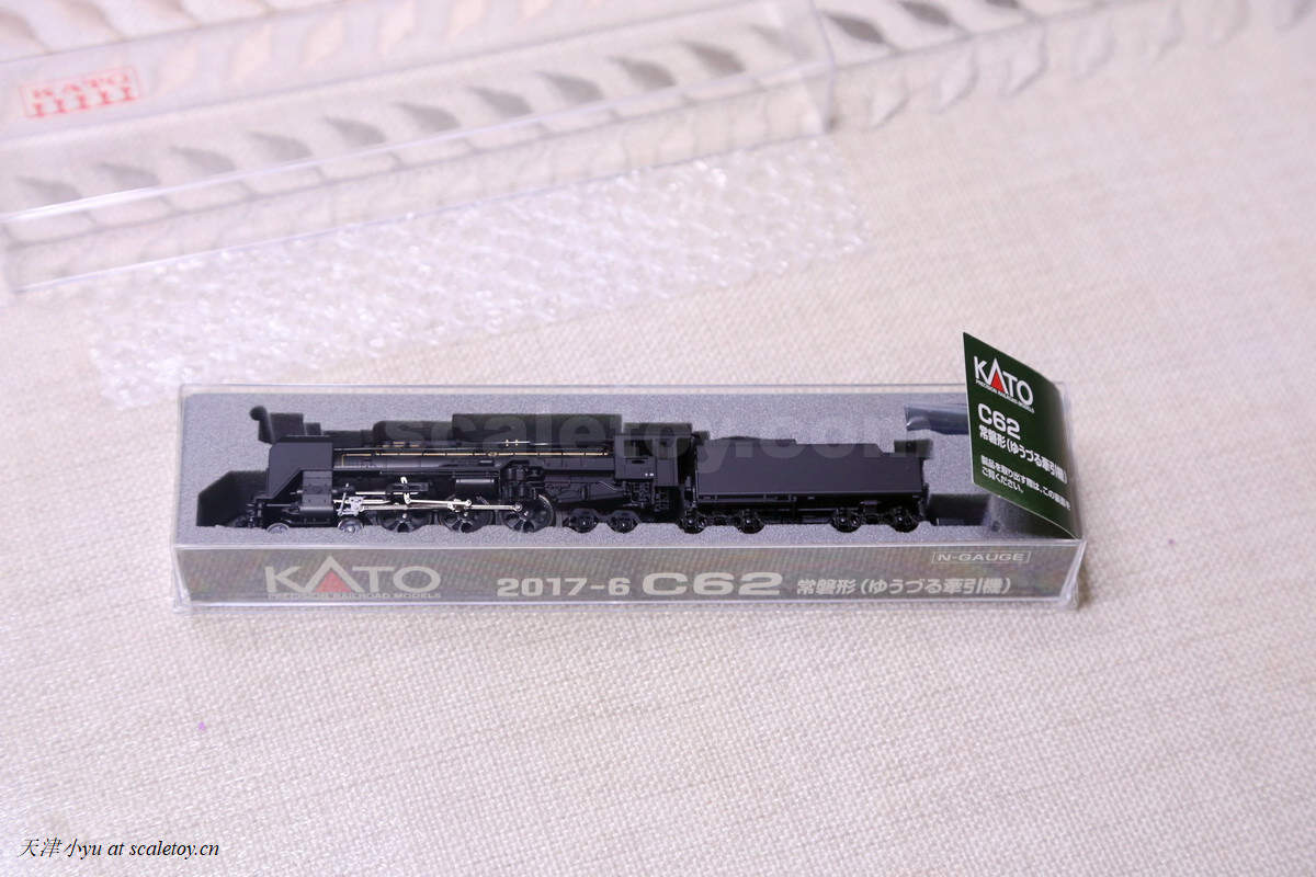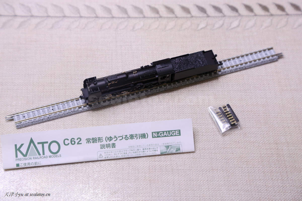 火车 train[KATO][N比例] C62 型蒸汽机车 山阳线型(吴线) 作者 天津小yu 2019年9月12日 1 分钟阅读 1 这次介绍一个日本蒸汽机车,网上找不到太多的实车图,介绍也是转自铁魂的,将就着看吧 这类模型的单品基本都是这种包装,透明塑料盒+硬质海绵 包括说明书和一些替换的配件 包括型号的铭牌、替换车钩和排障器 找了一节tomix的轨道,放上 这里要说一下,这些杆子都是联动的,想想这么小的模型能做的如此精致也是不太容易 标签: 1/160KATO