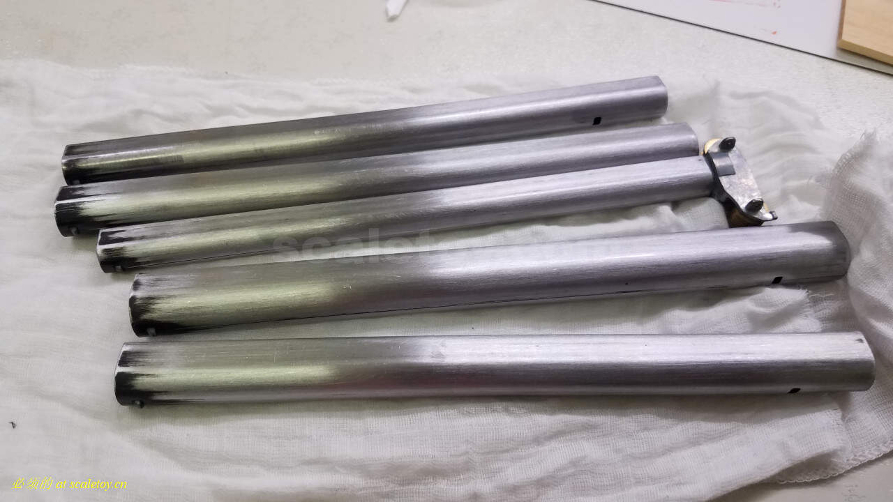 这几节杆费劲了,模型杆每节间隙很小,正常喷漆一动就会刮掉,雅高感觉用选用的材质像是冰箱表面那种,漆无法直接脱掉,手工砂纸打磨了几个小时,磨出来的效果,喷漆完毕我组装后刮漆严重,上了润滑油还都是锈油,杆是铁皮的