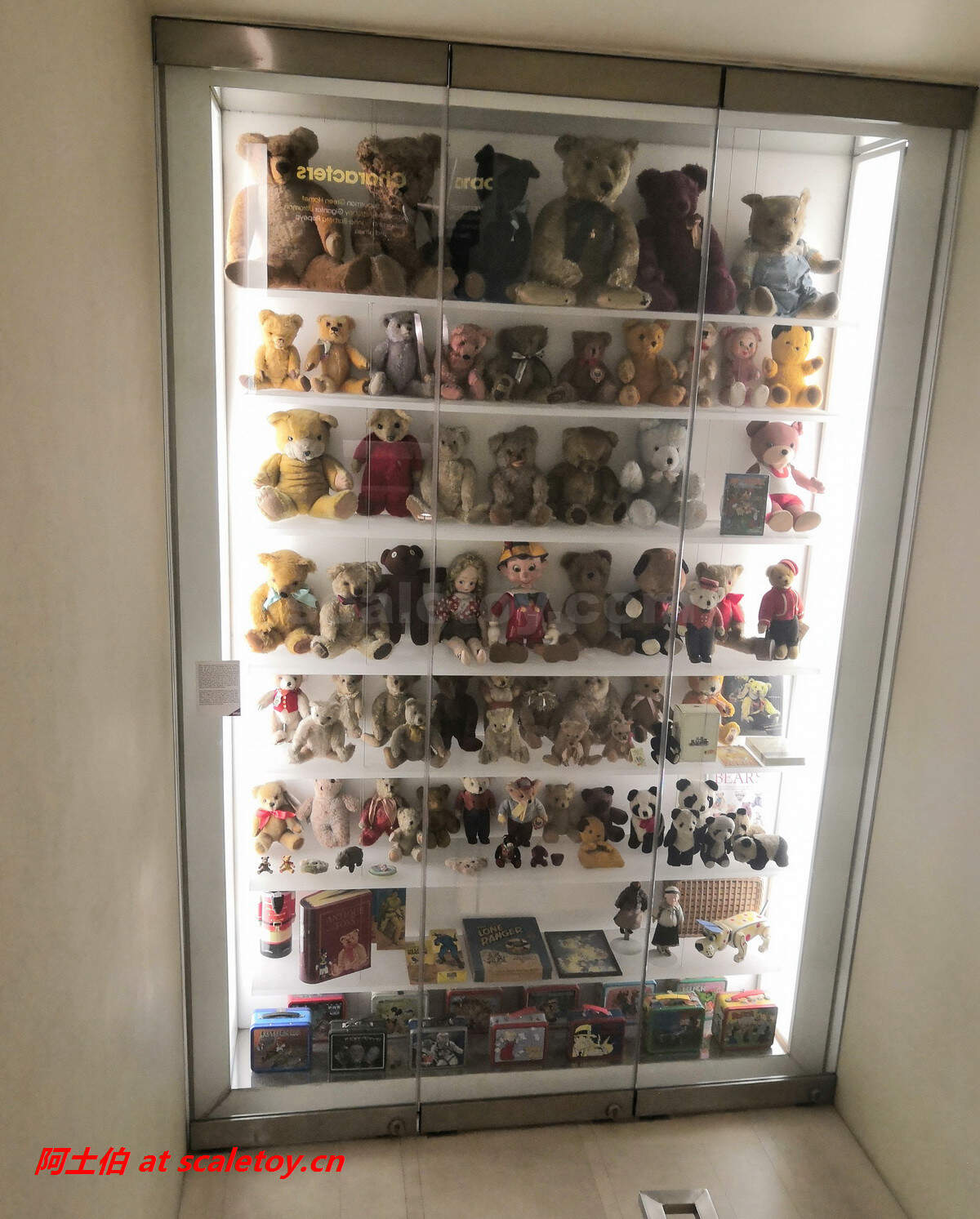 从四楼去三楼的半层展柜,主要是各色毛绒玩具熊