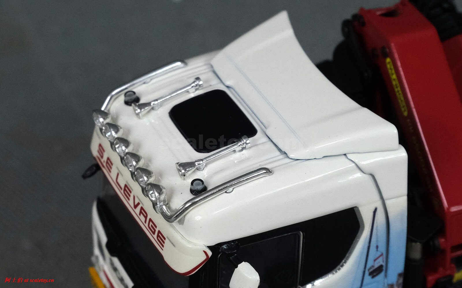 驾驶室顶部,天窗两侧,喇叭和白色警示灯,额头加装镀铬前头灯条