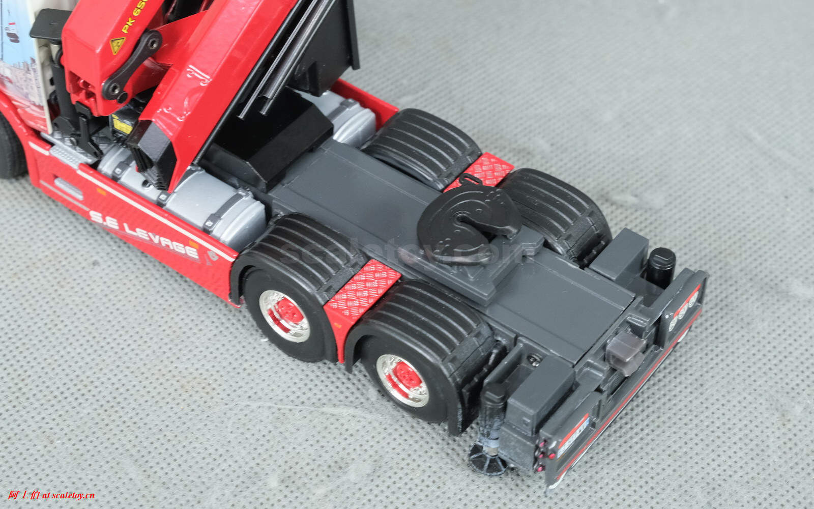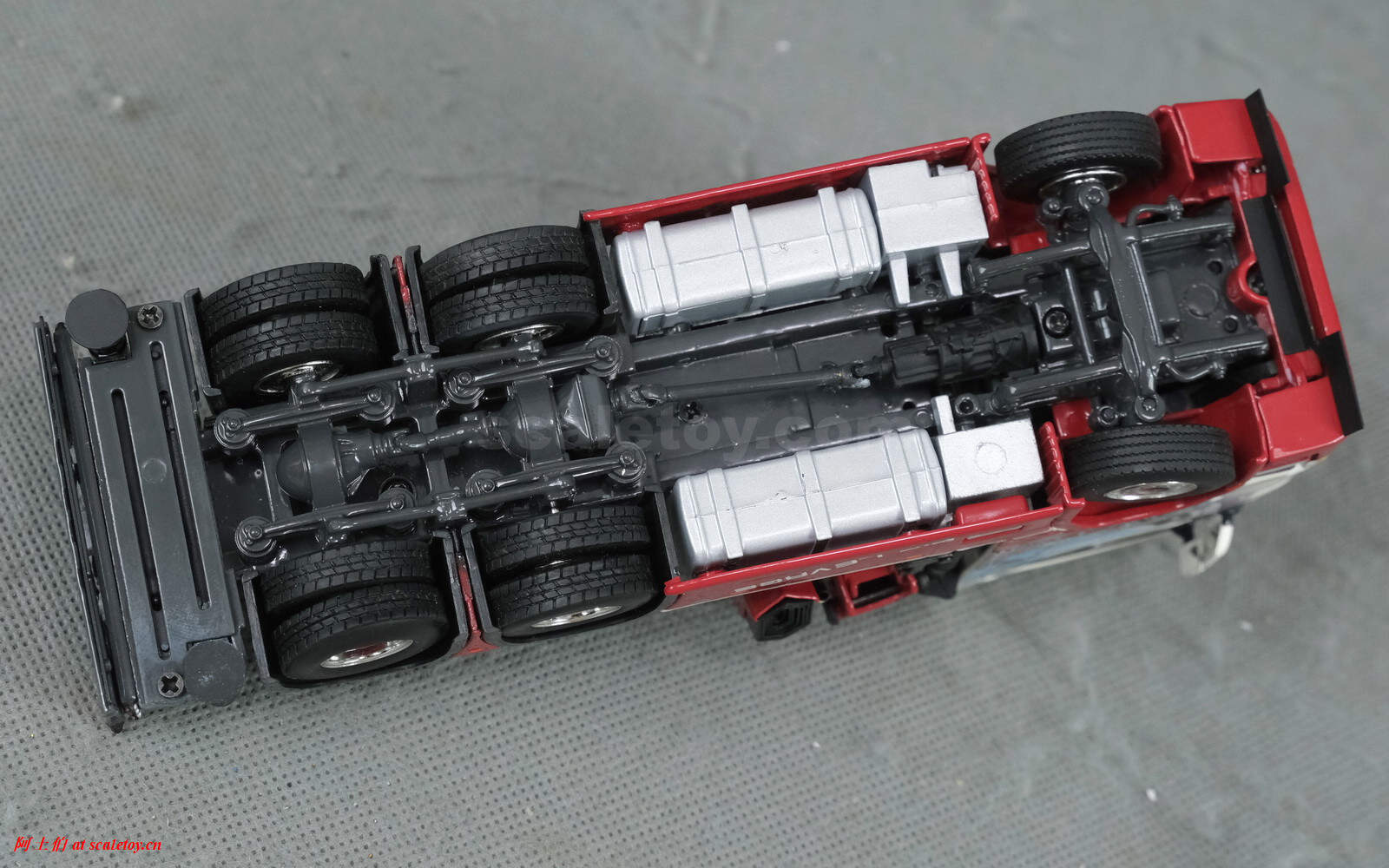 拖挂部位,第五轴,以及前部两侧的油箱等细节,后部有支腿结构