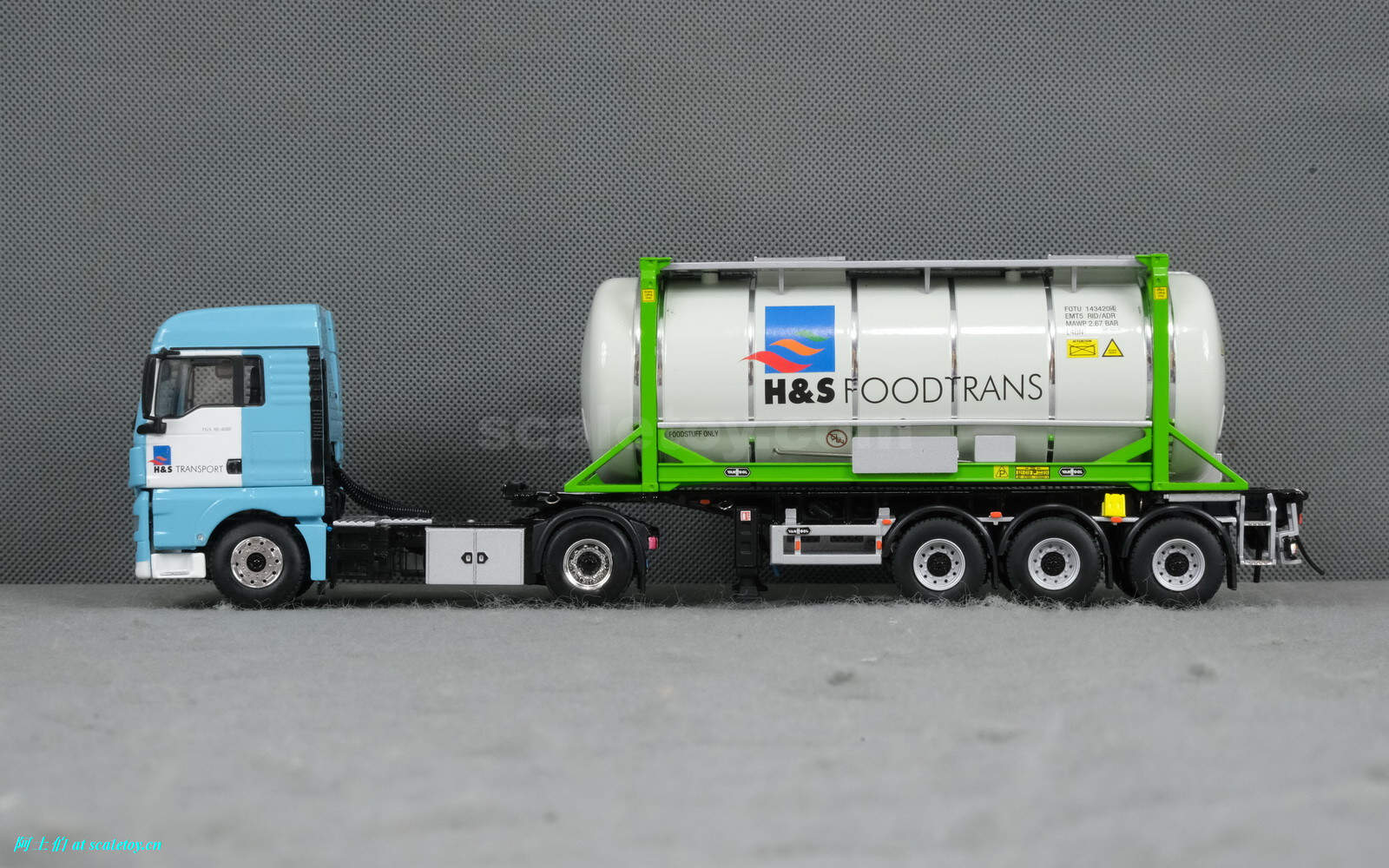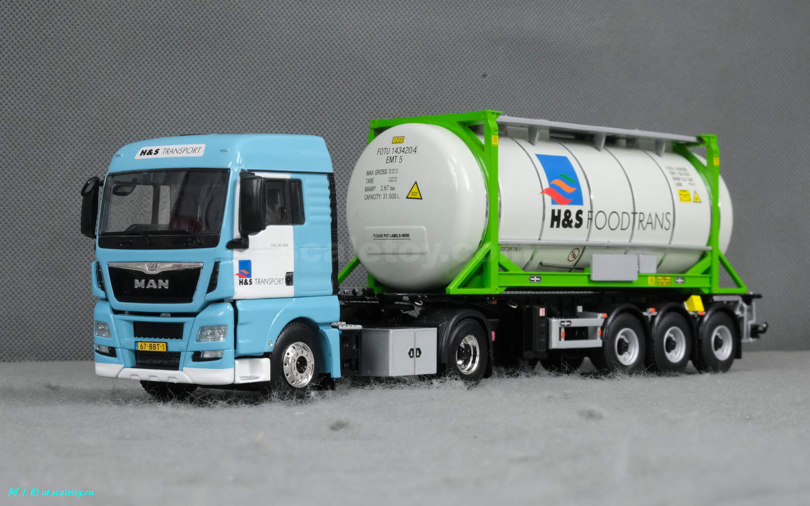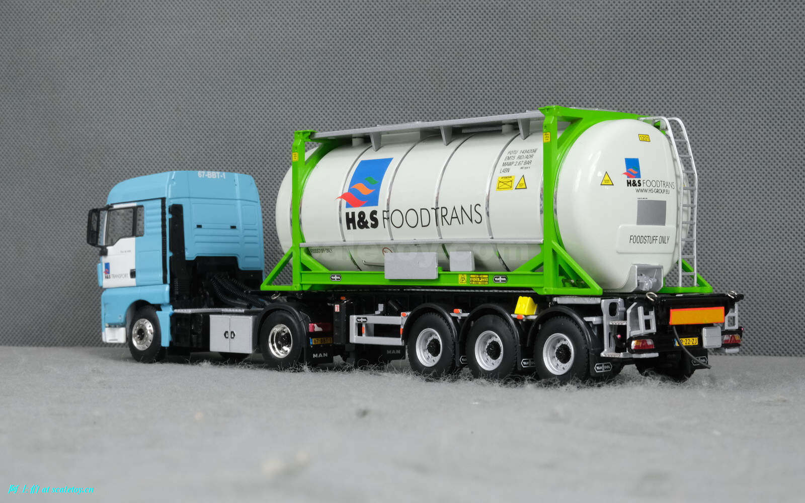 继续介绍H&S公司涂装的第三款模型。原型为MAN TGX XLX EURO 6拖头挂三轴集装箱托架,配一个20呎集装箱槽罐。以下为网上类似的相关图片,并非原车。