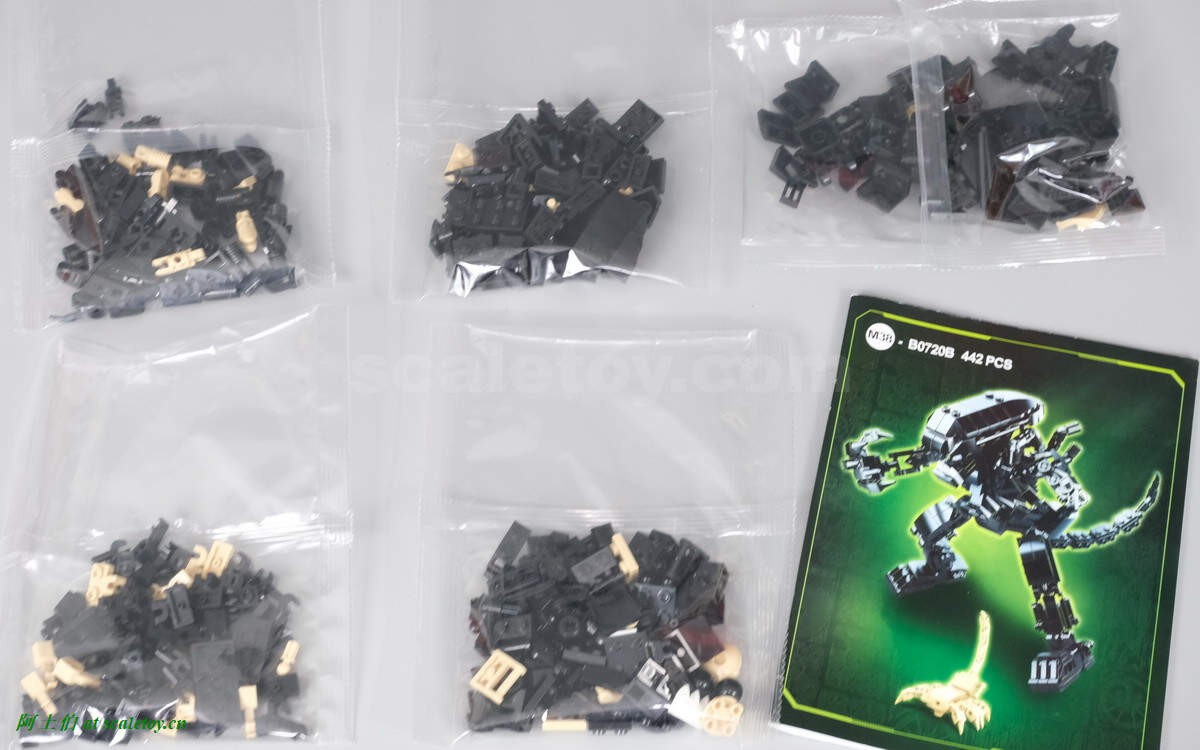 五包,未编号,无组装顺序,这个比较头疼,虽然四百多块积木不算特别多,但这款主体全部是黑色,找零件的时间还是比较麻烦的。