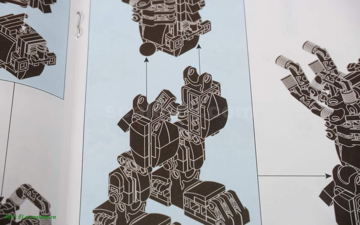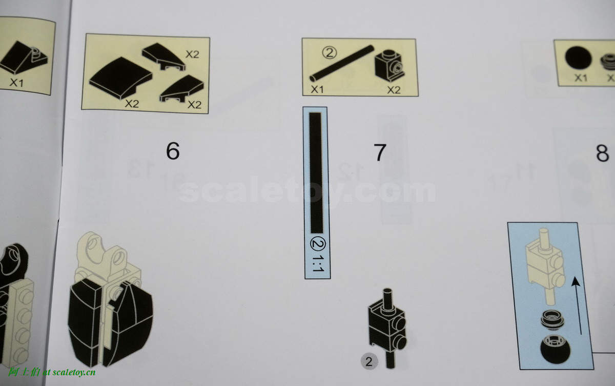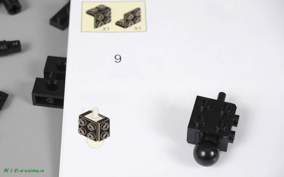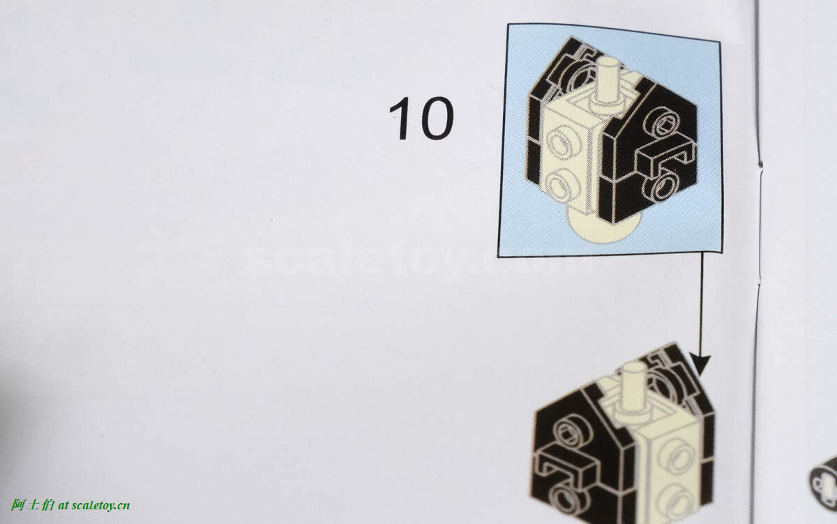 这是第一个BUG吧,从图中可见第9步组装后,第10步的蓝色示意图中,内部直角形状的零件的方向实际是相反的。