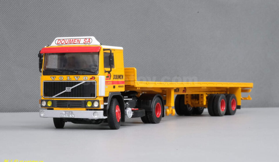 [WSI] VOLVO F12 4×2 with 2x flatbed trailer – DOUMEN 沃尔沃F12拖头挂平板挂车 法国DOUMEN涂装