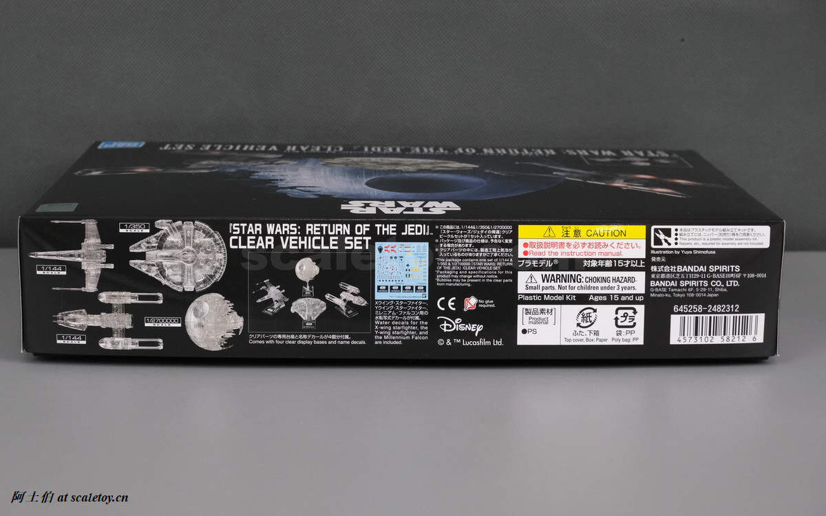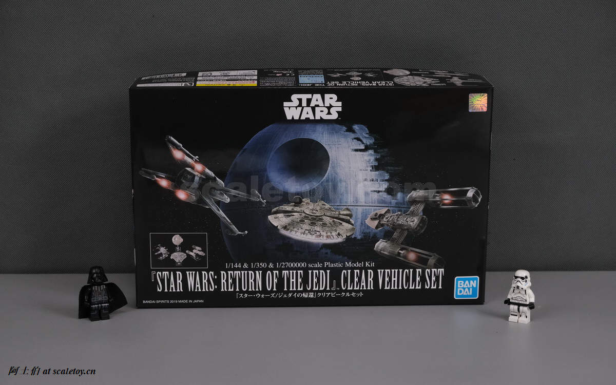 包装为黑盒,并标记了包含1/144,1/350,1/2700000三个比例。明明是一部虚拟科幻,场景道具都有真实尺度资料信息;于是周边玩具都可以像模像样的标记比例了。三架飞船向着建造中的死星飞去,未知历史扑面而来。