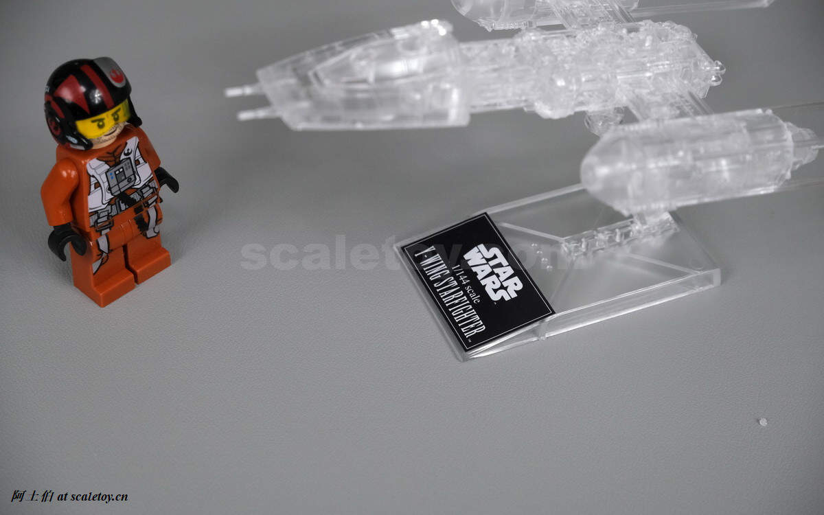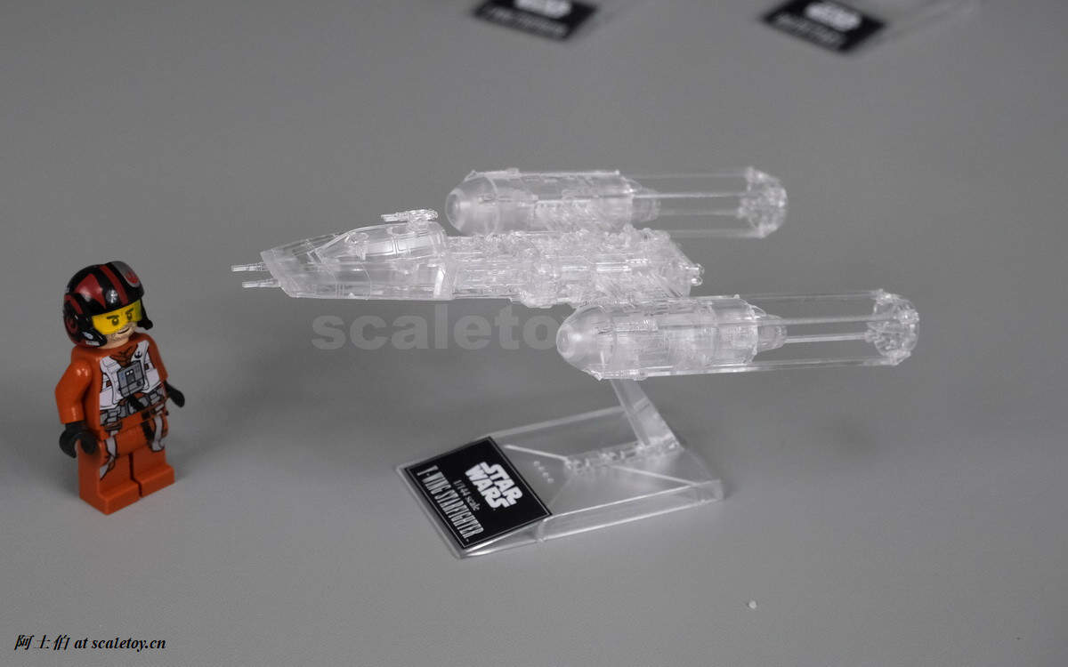 Y翼战机。两侧拖后的发动机结构是它的特色,很容易辨识。配一个飞行员吧。比例是1/144。