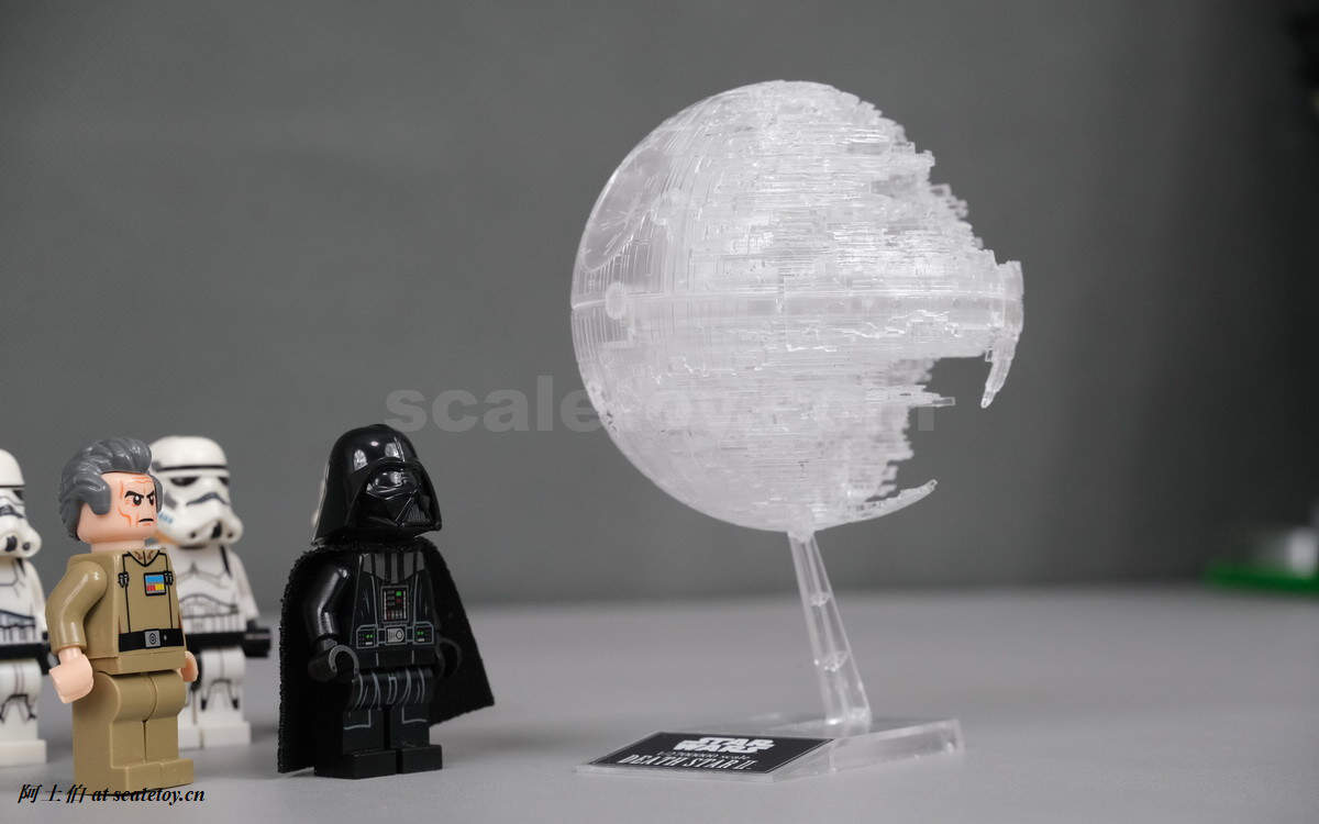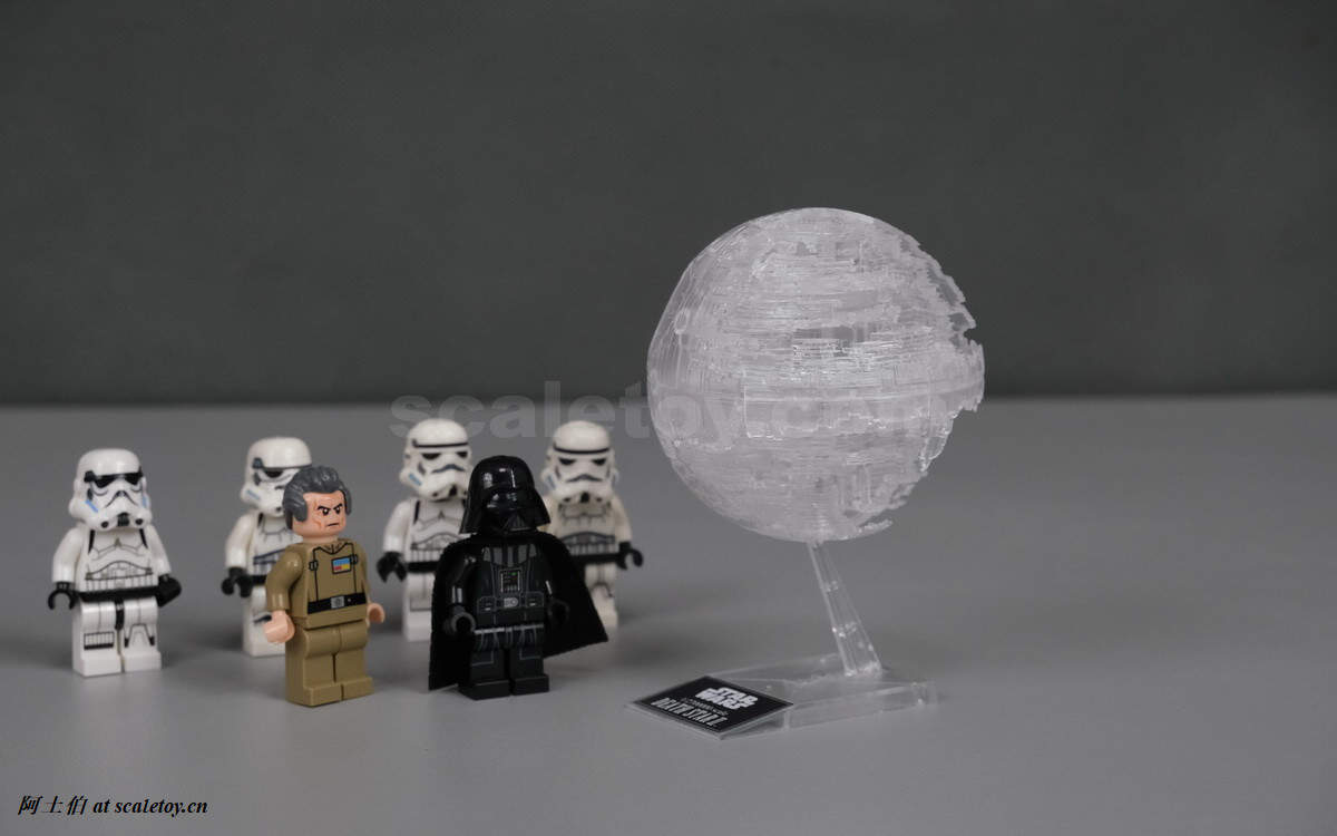 最后上场的是死星二代。黑武士,塔金,白兵,绝配了。还在建造中,因此显现出缺口和建筑露出。死星实在太巨大了,比例是1/2700000,270万分之一。。。死星二代的据称宽度是200公里,差不多。