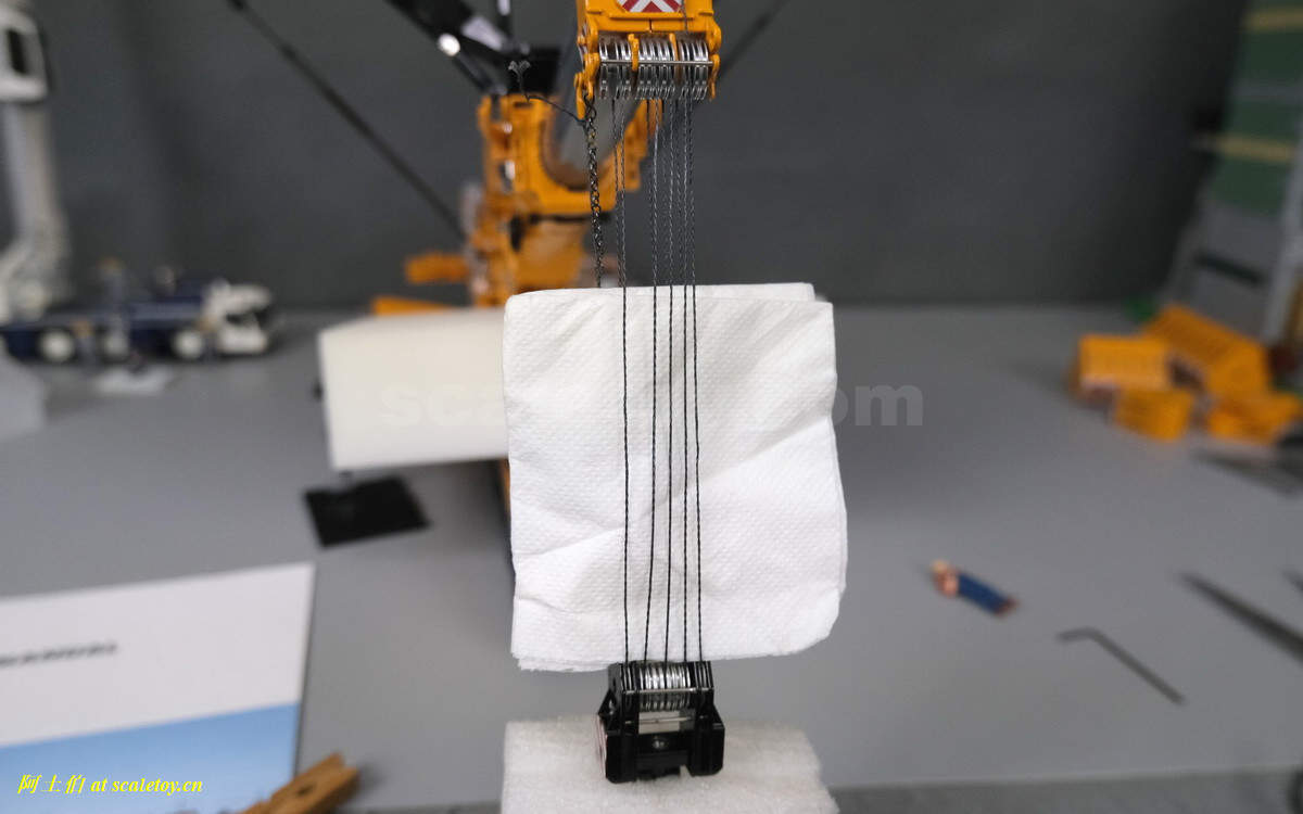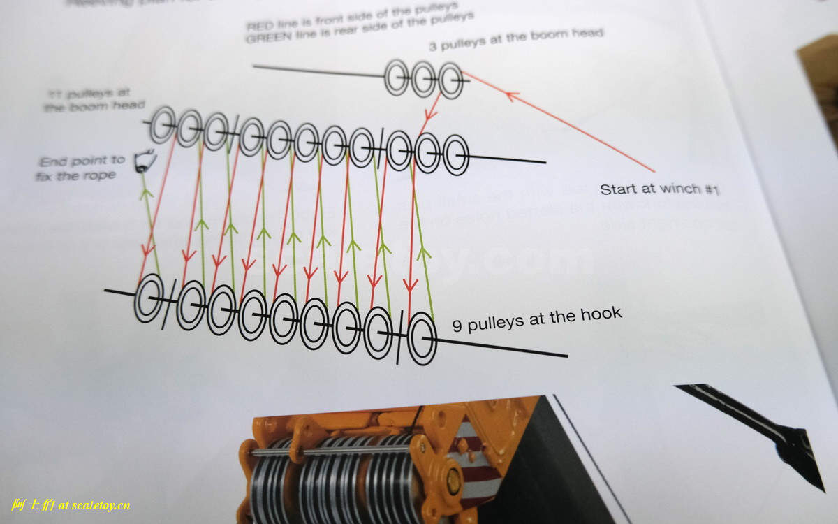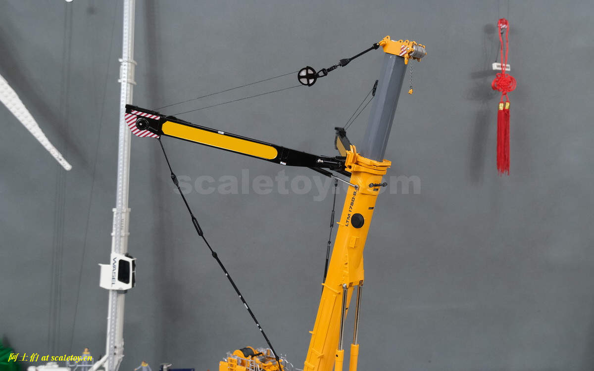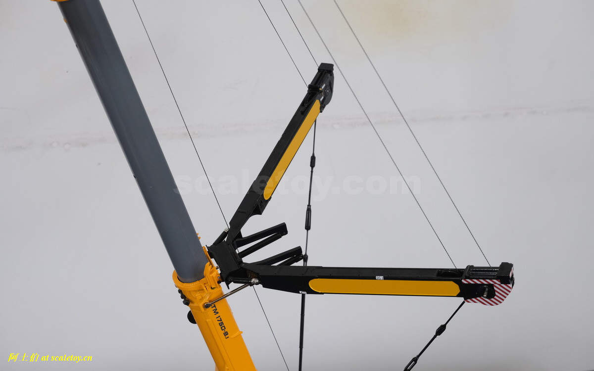 穿线过程略。这是最花时间最费时费事的环节,但这款LTM1750模型给我的感觉非常好,几个原因:1、WSI用的线非常有韧性,穿过孔隙很听话;2、这款线有一定的粗,不容易到处随意乱窜;3、臂头的滑轮和上方的金属杆、以及和臂头结构的距离都比较近,考虑到线算比较粗,就不容易跑位;4、臂头后方没有金属杆,方便了线从背后向前穿出;