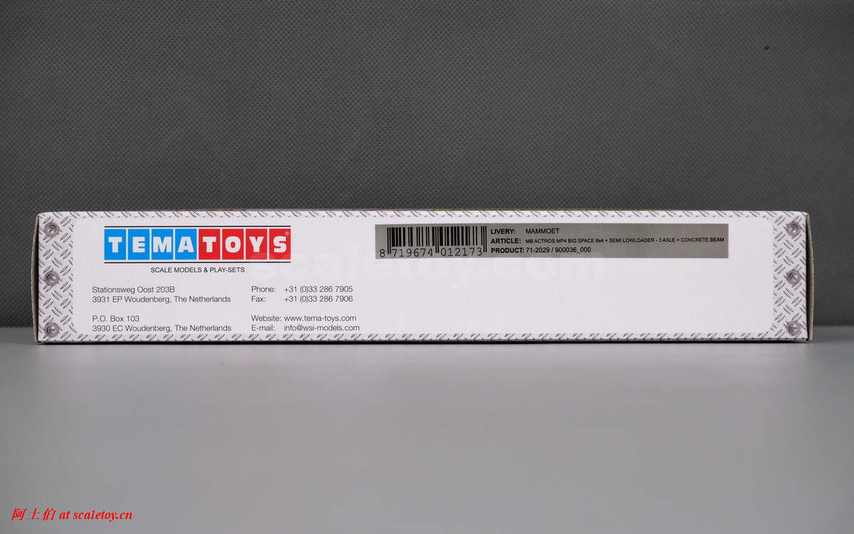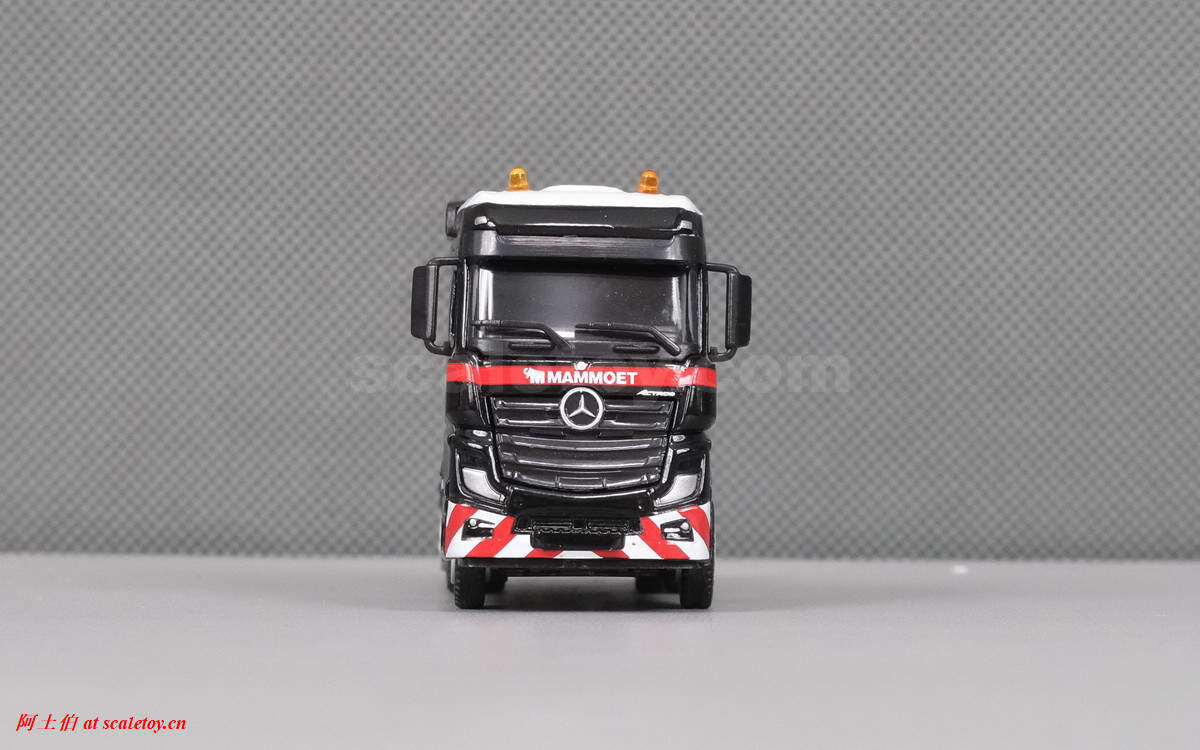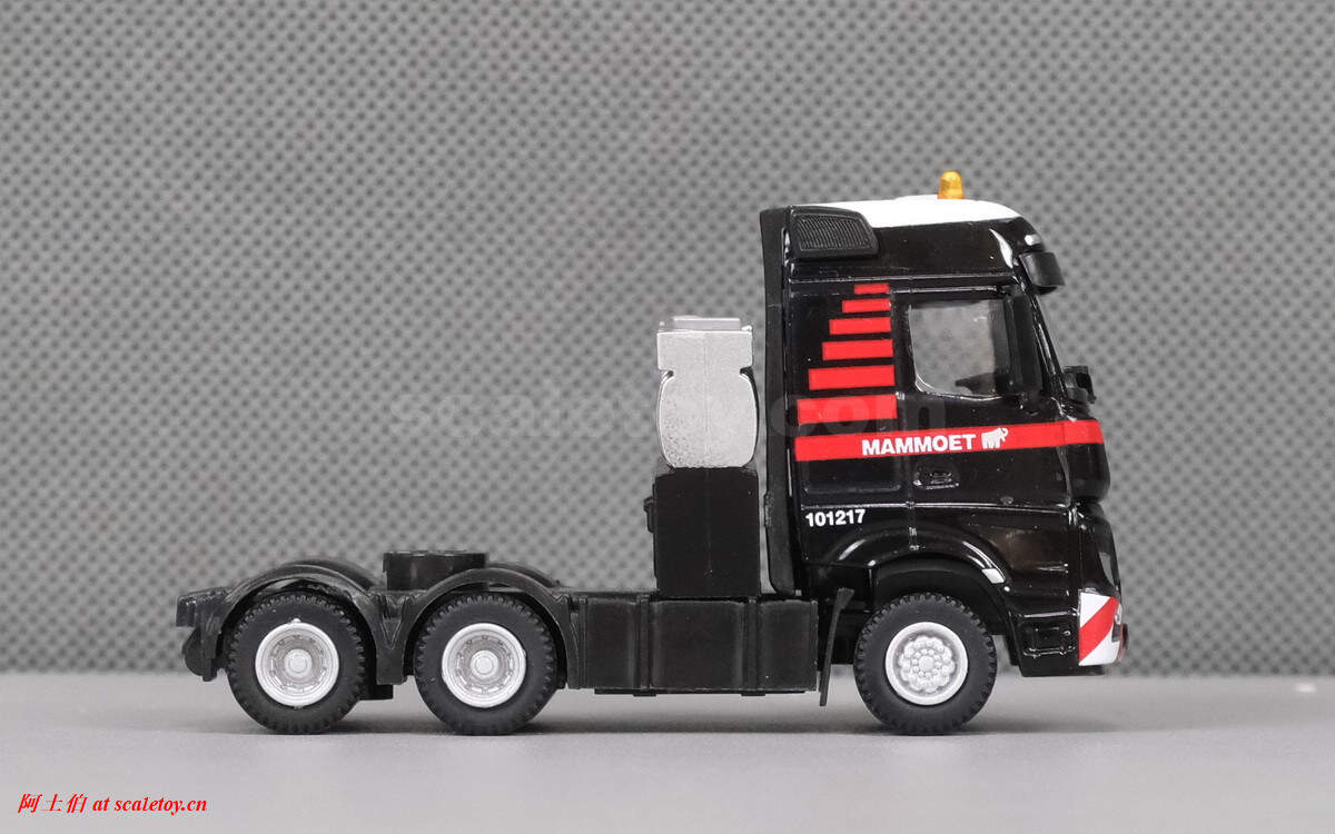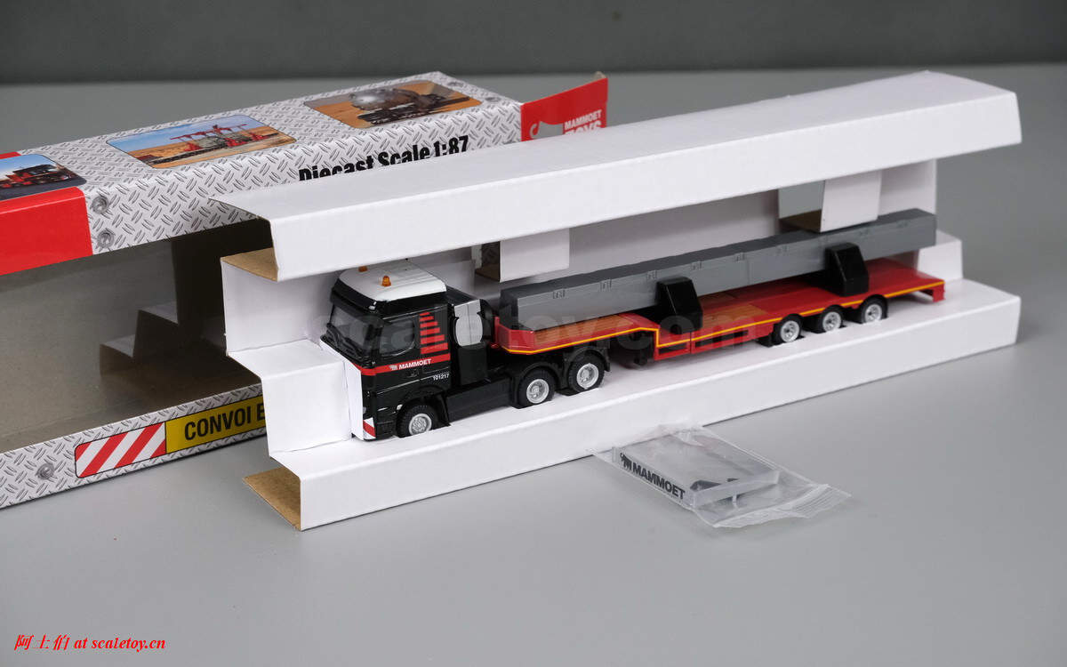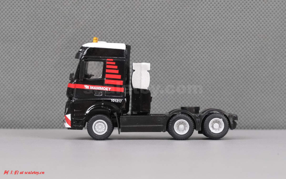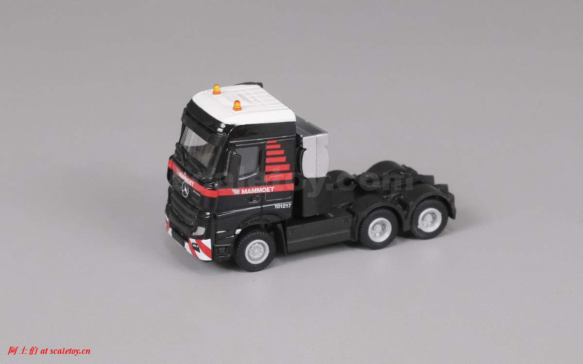 继续介绍MAMMOET的1/87产品。这是一台奔驰ACTROS MP4 BIG SPACE 6X4拖头,挂三轴半低板,运载一根水泥梁,模型编号为71-2029 / 900036。