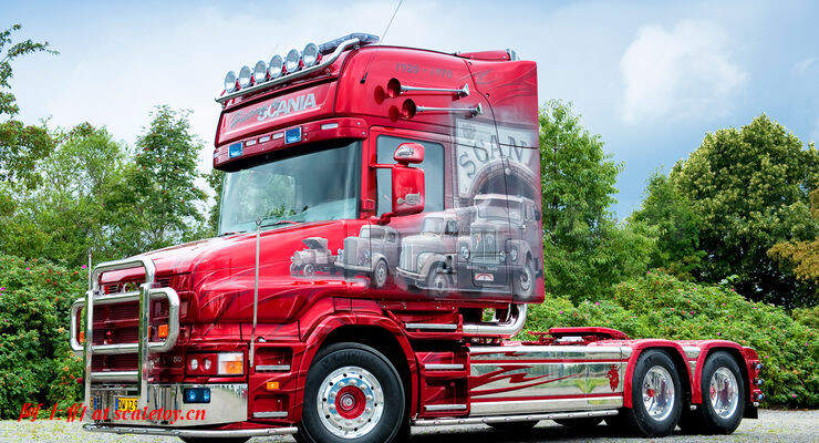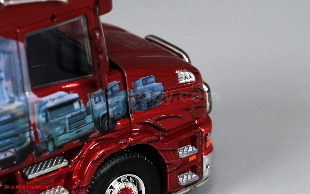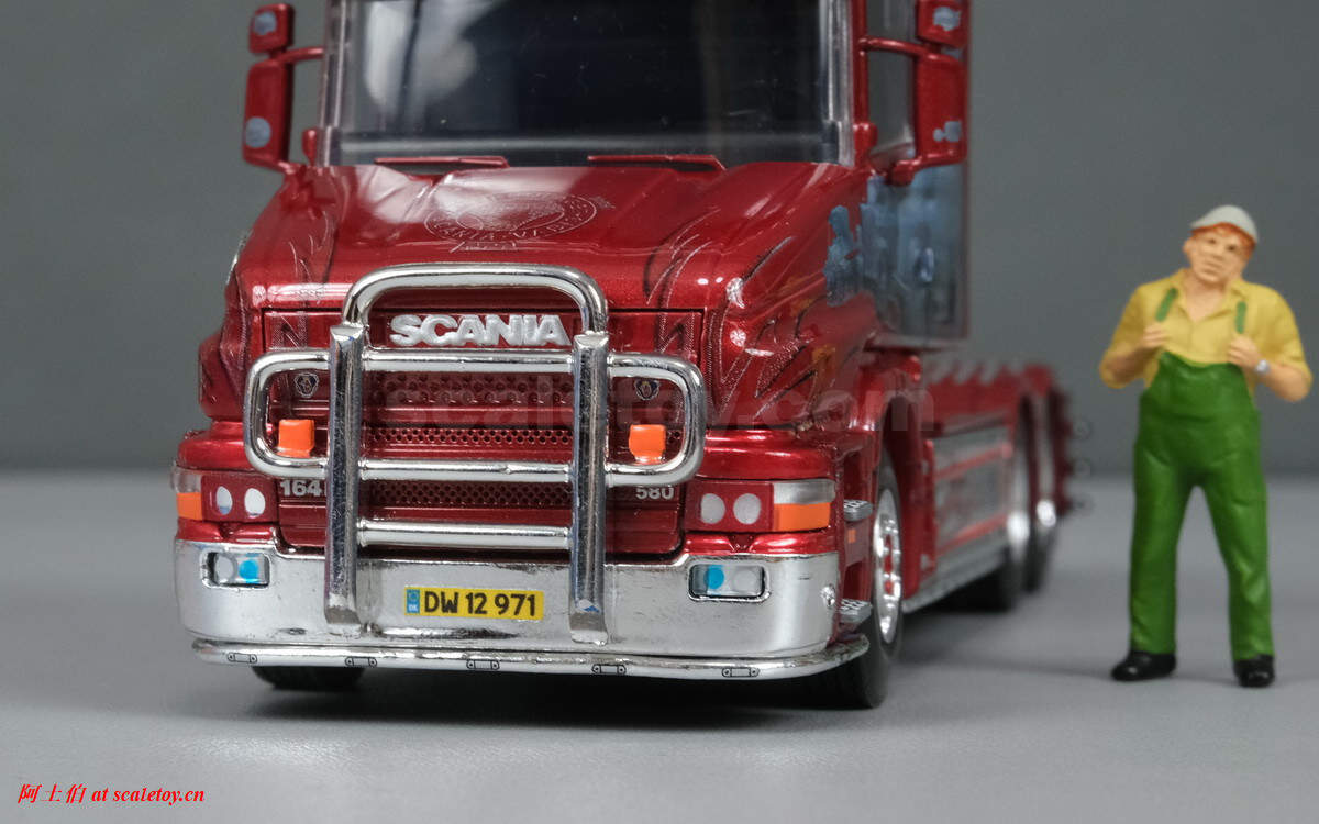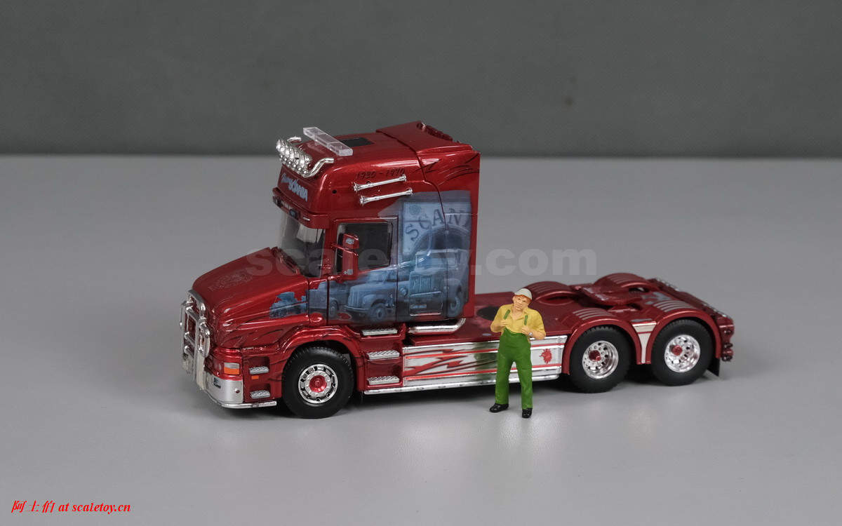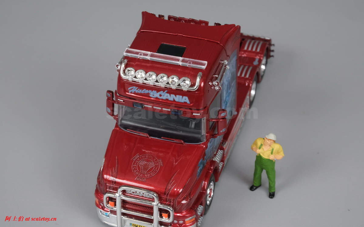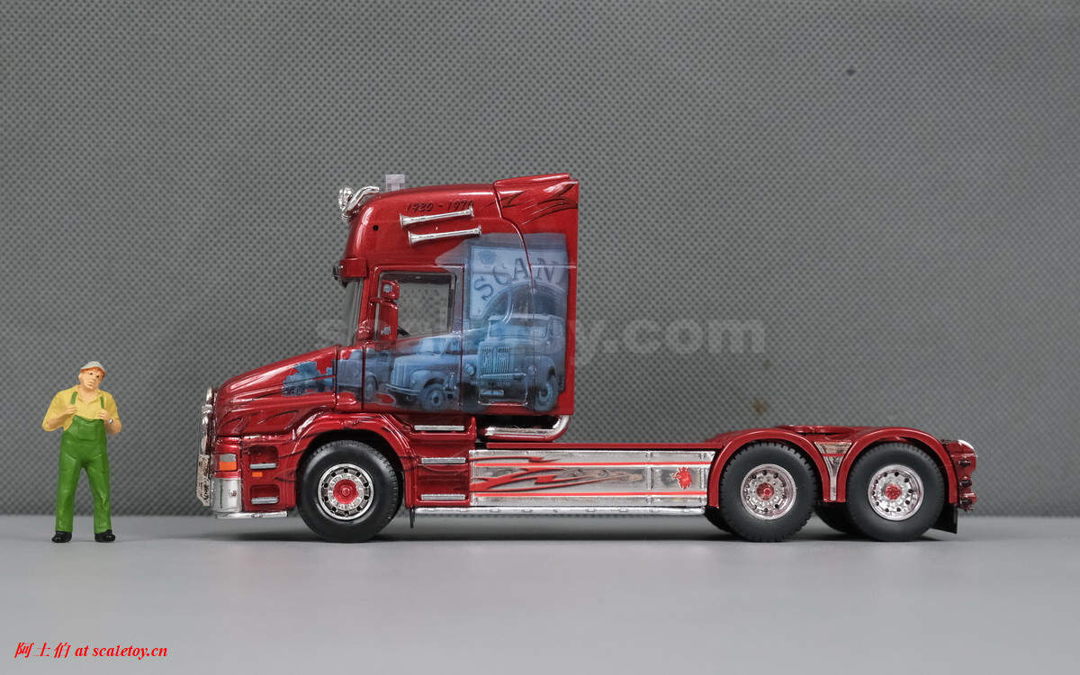 今天介绍的车模,原车就是一款斯堪尼亚的T系列,其主人Dane Poul Willy Andresen 是一位超级斯堪尼亚卡车迷,他拥有至少三辆斯堪尼亚的长头拖头,包括L111, T164, T143,都喷绘了妖艳的“糖果红”色,以及与斯堪尼亚历史有关的图片文字彩绘。这些特别装饰的车辆除了涂装特别,还使用了许多来自不同年代斯堪尼亚的不同车型的配件进行运用和装饰,可谓流动的斯堪尼亚历史展示馆。。。