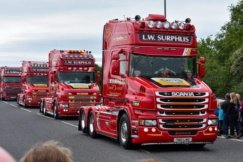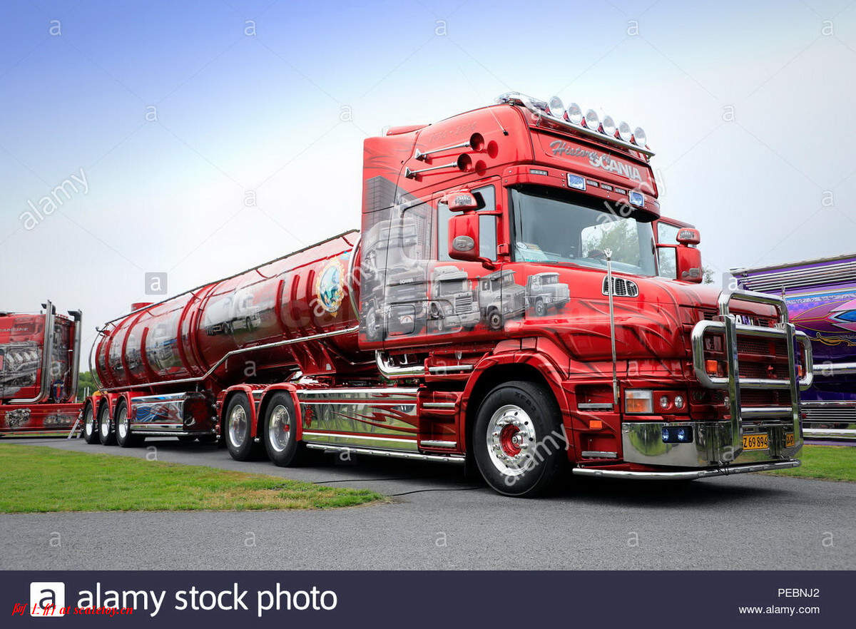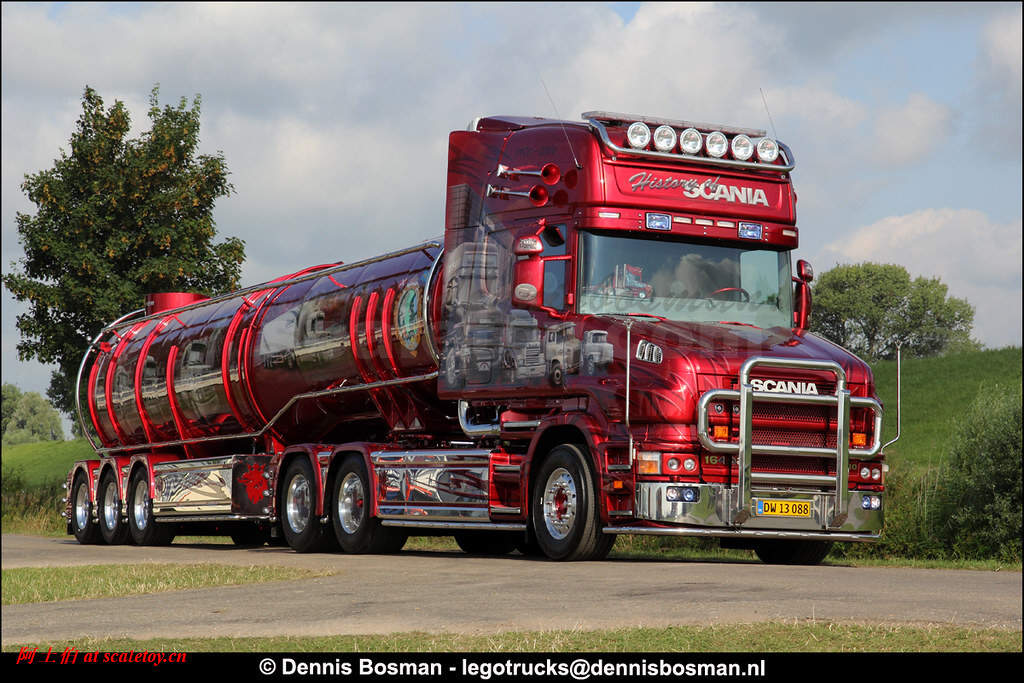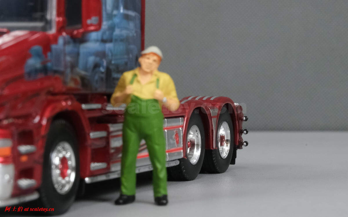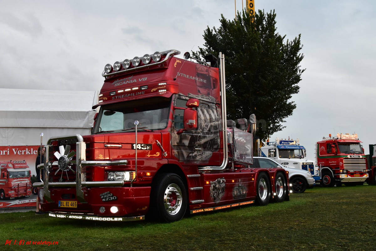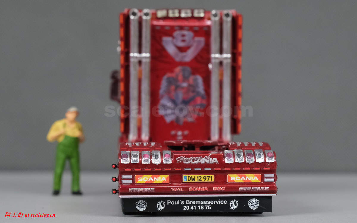 今天介绍的车模,原车就是一款斯堪尼亚的T系列,其主人Dane Poul Willy Andresen 是一位超级斯堪尼亚卡车迷,他拥有至少三辆斯堪尼亚的长头拖头,包括L111, T164, T143,都喷绘了妖艳的“糖果红”色,以及与斯堪尼亚历史有关的图片文字彩绘。这些特别装饰的车辆除了涂装特别,还使用了许多来自不同年代斯堪尼亚的不同车型的配件进行运用和装饰,可谓流动的斯堪尼亚历史展示馆。。。