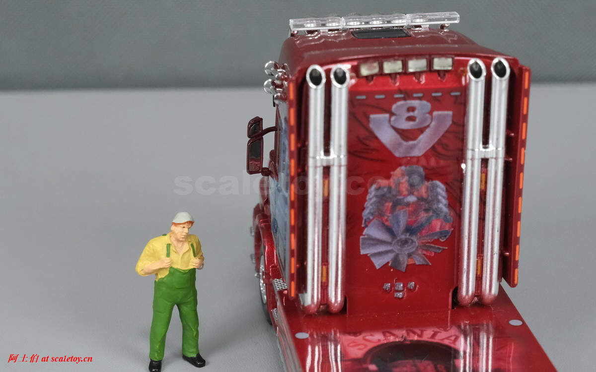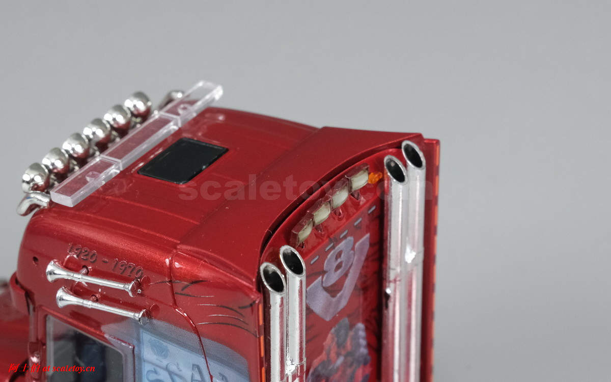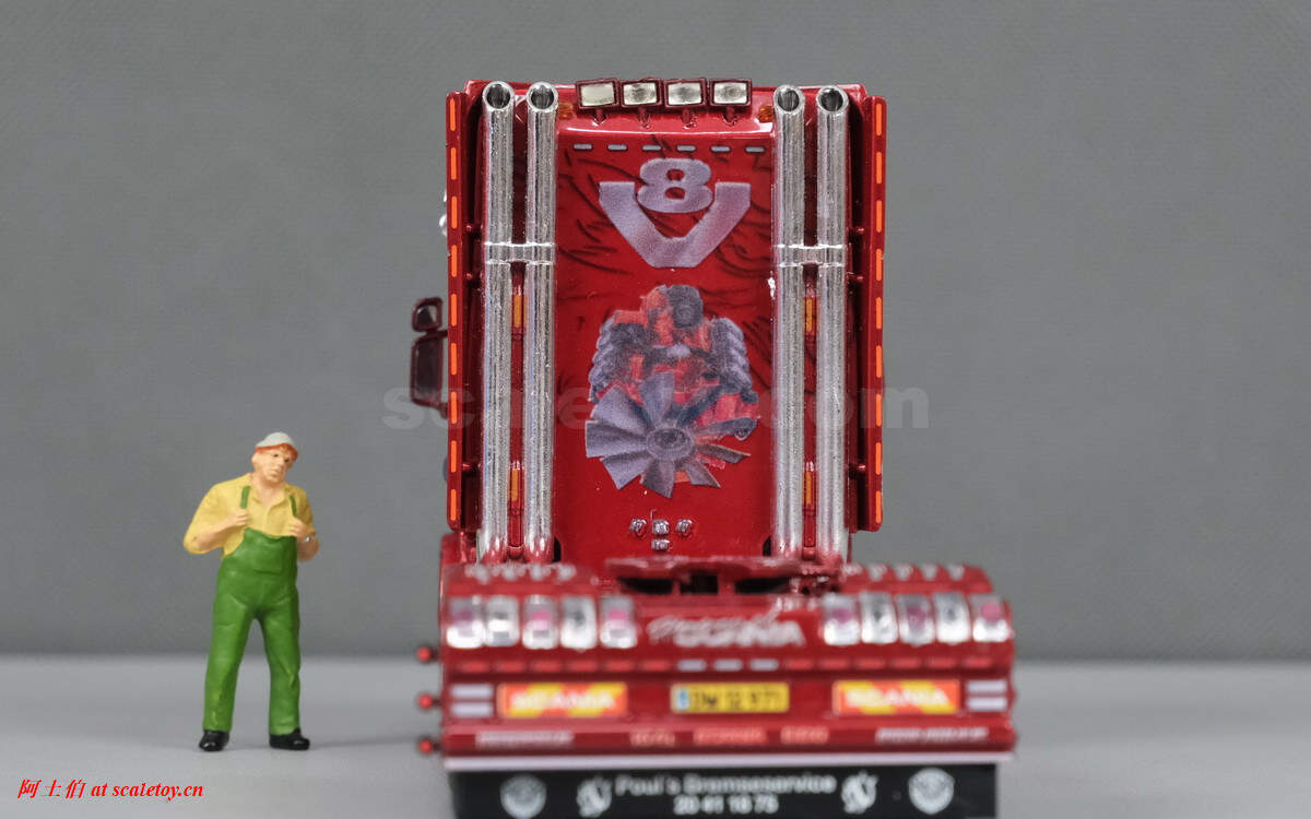 驾驶室后部是斯堪尼亚巨大的发动机图案和V8标记,上面装了四个照明灯,两侧各两个粗大的排气管,极其醒目震撼,