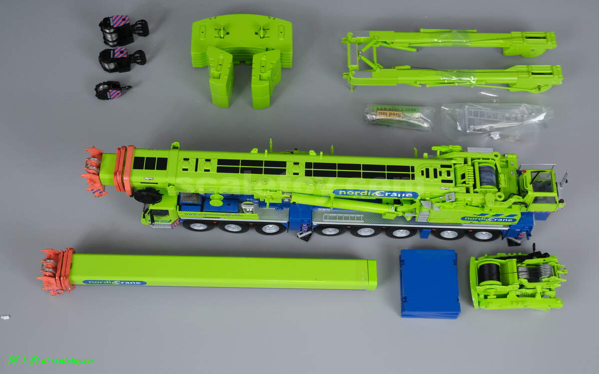 包装的内容和之前的基本一致,主车,多节吊臂更换,Y辅助结构,配重组,三个吊钩,支腿垫板