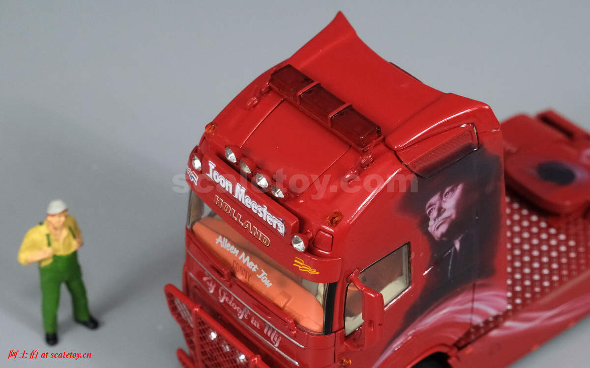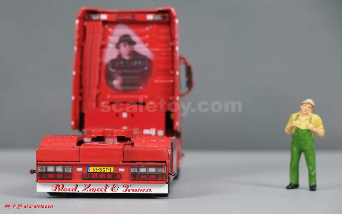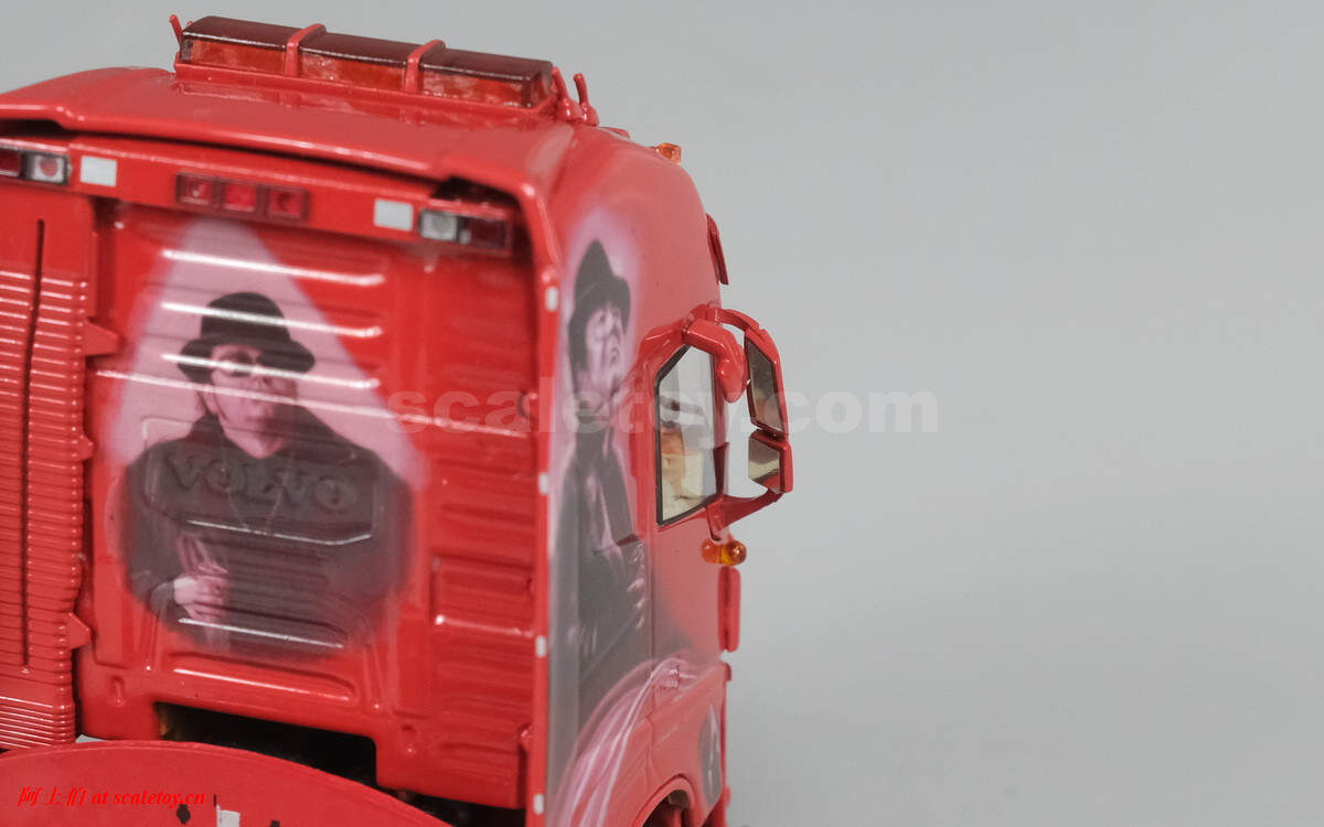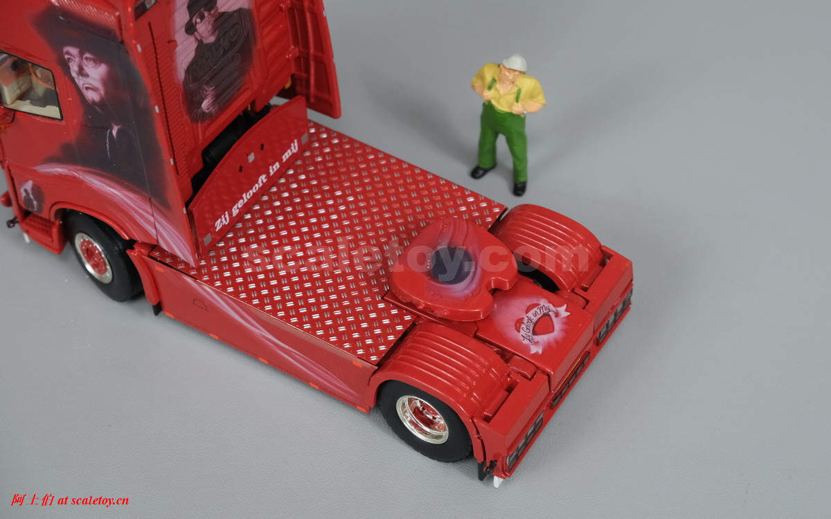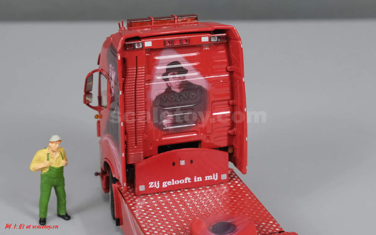 驾驶室背后的人物图案,上面有加装的灯饰,扁平的气道,后部没有连接线缆,隔板上的荷兰语就是“Zij gelooft in mij”电影名称。拖挂部位全部覆盖了金属板。