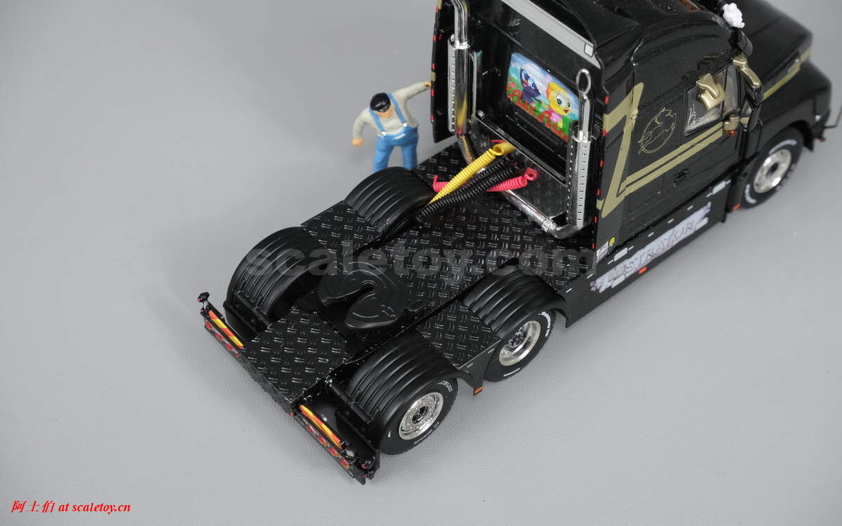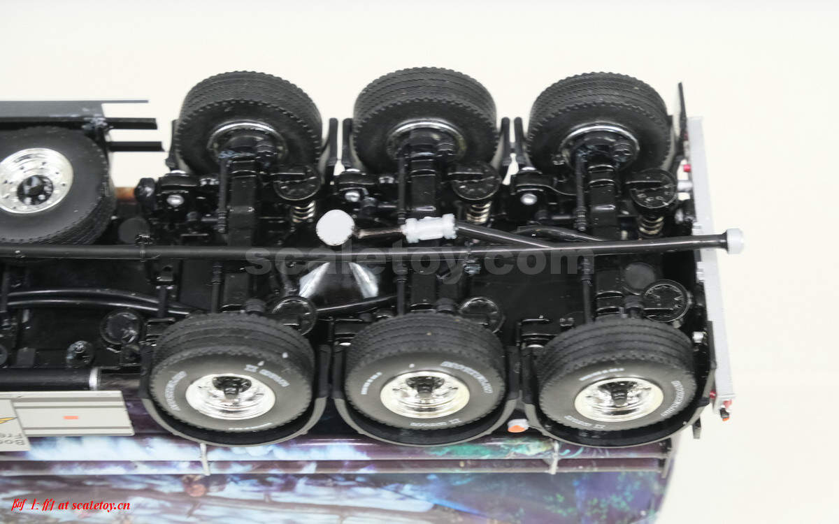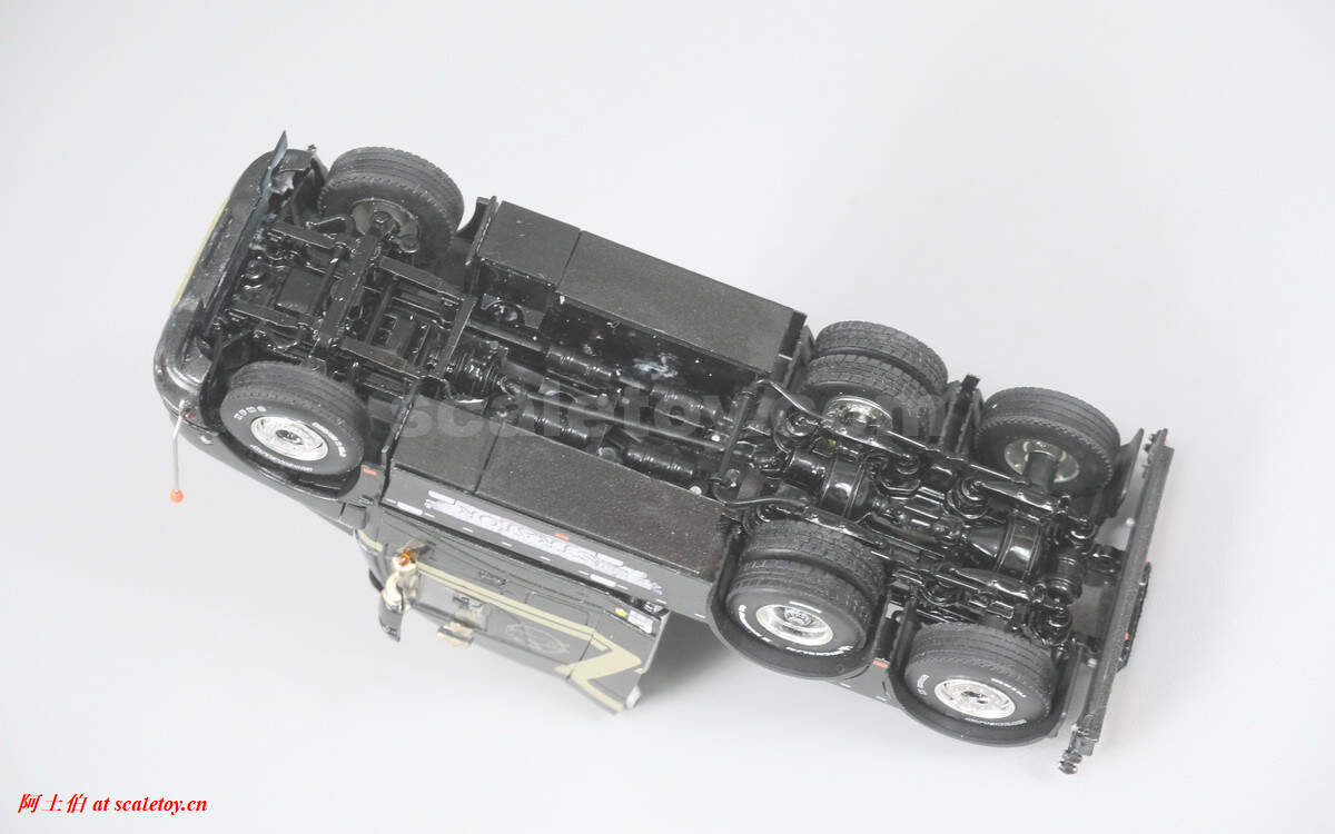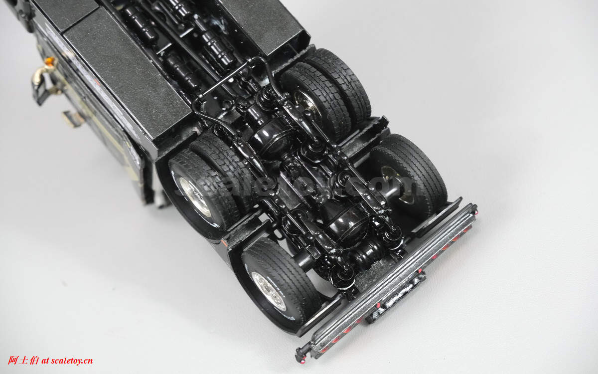 底盘,和之前见过的那些不太一样,线条结构都很复杂的样子。前轴转向联动,后两轴有驱动结构;但模型名称来看是tag axle,不知第三轴是否参与驱动。