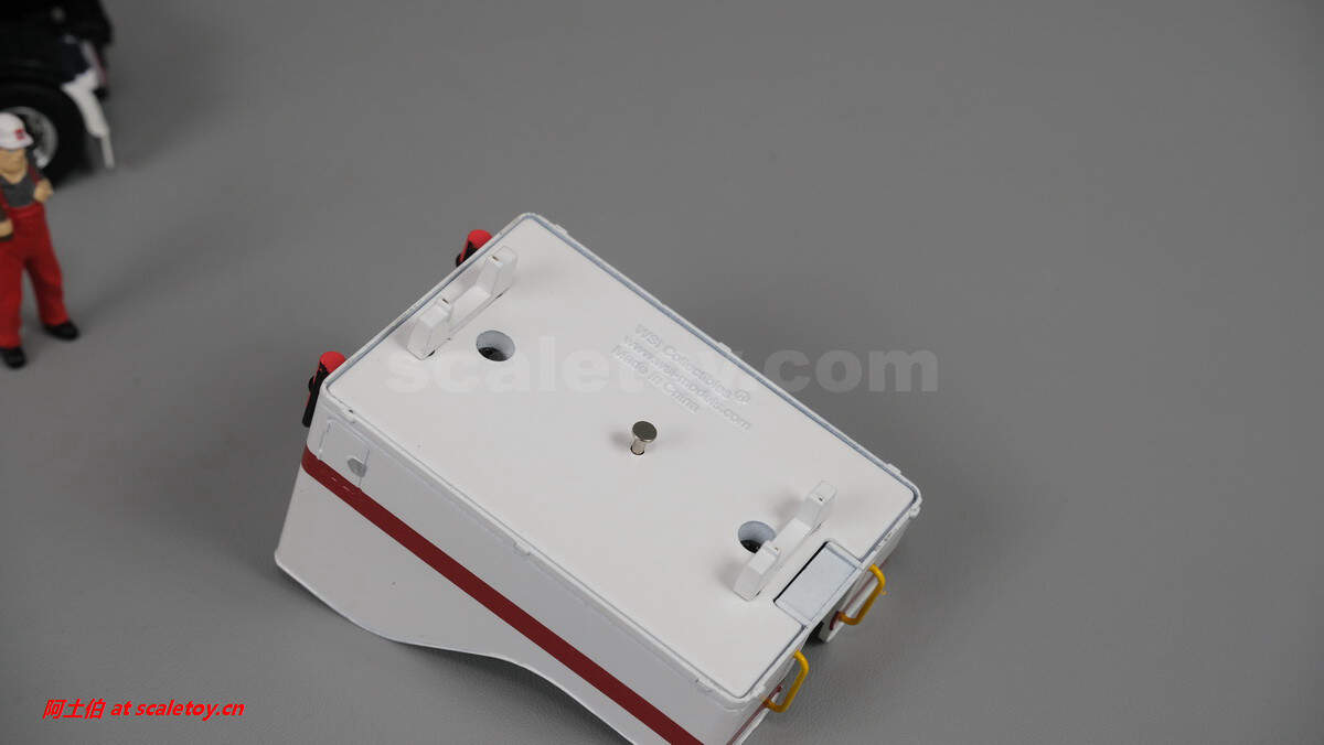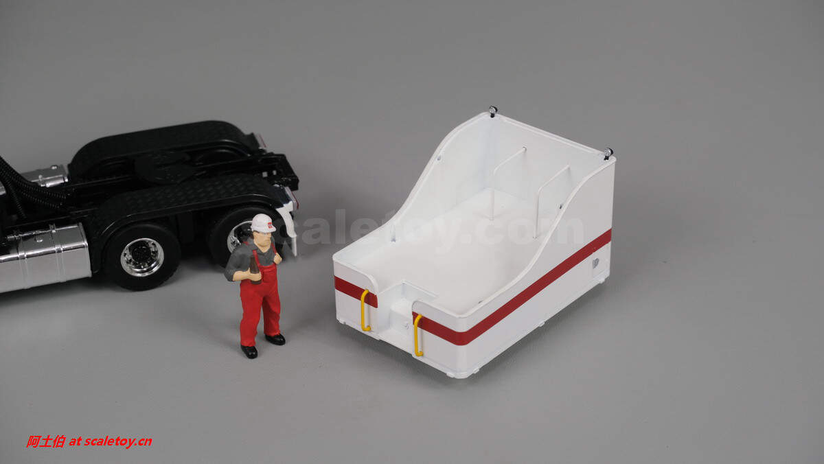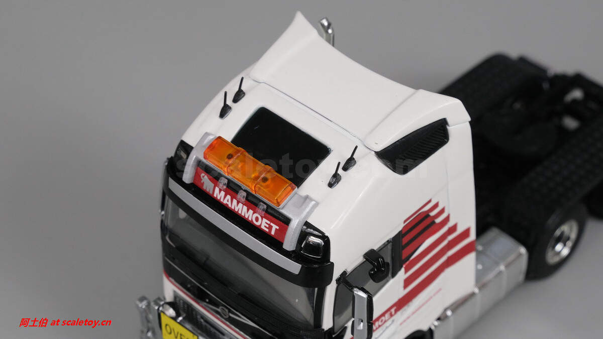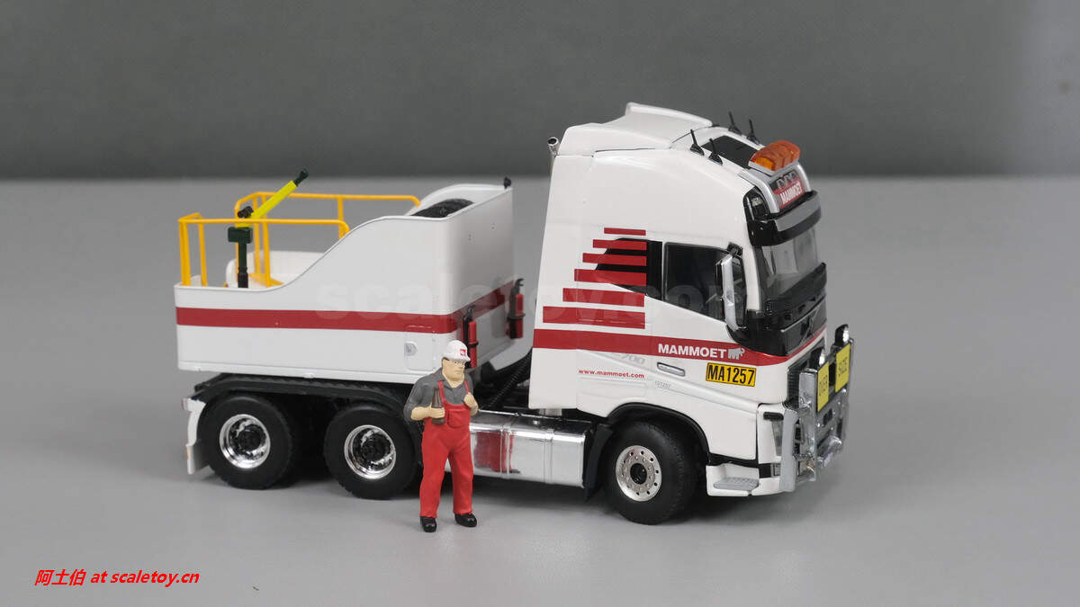 从未组装附件的拖头开始吧。拖头顶部加了警示灯条,两侧各两个短天线,中央天窗。额头MAMMOET的红底白字logo,两侧大灯。