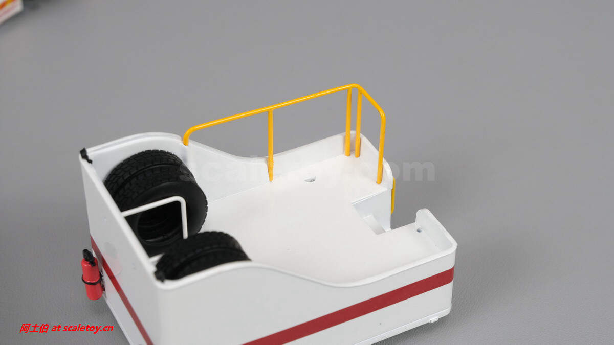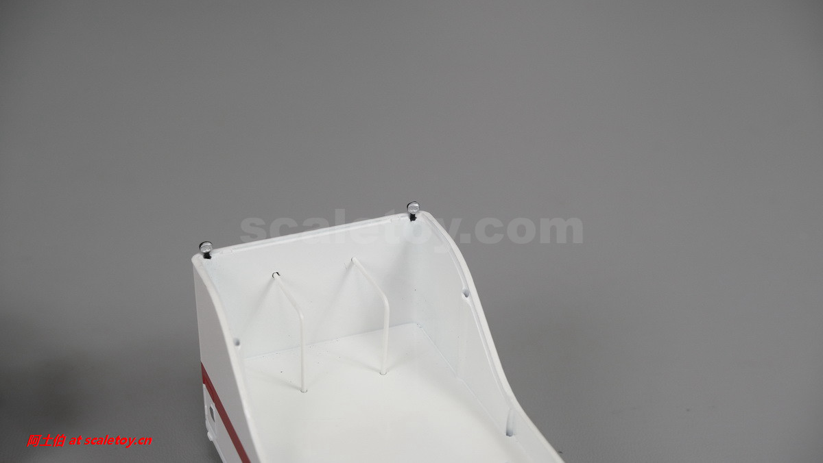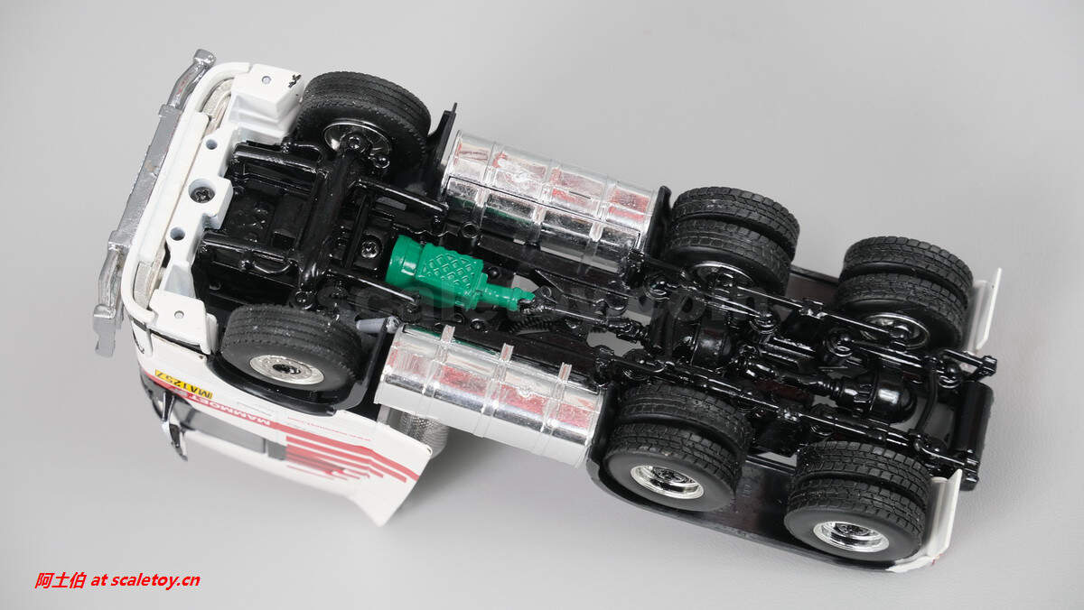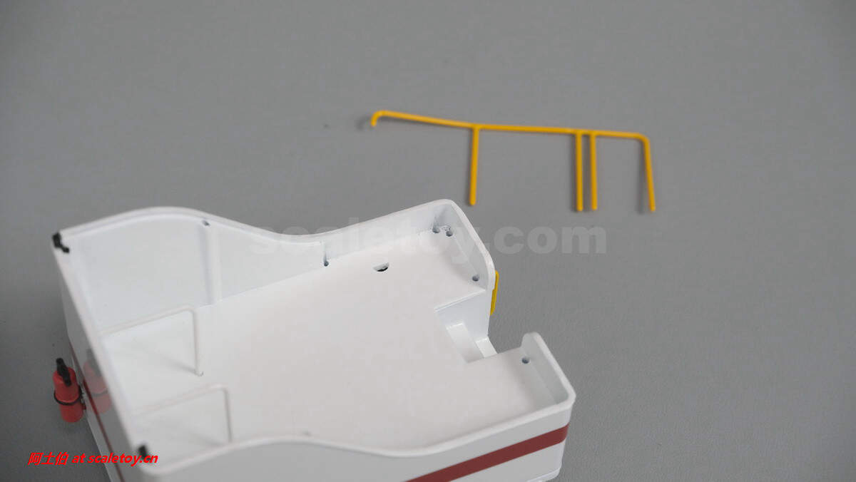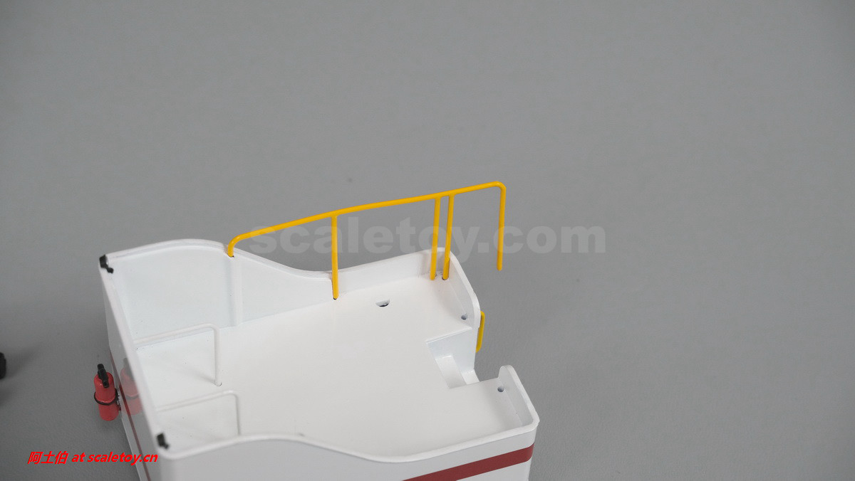 从未组装附件的拖头开始吧。拖头顶部加了警示灯条,两侧各两个短天线,中央天窗。额头MAMMOET的红底白字logo,两侧大灯。