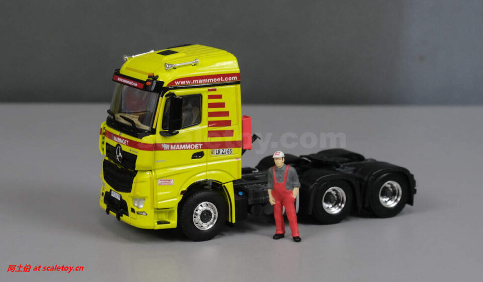 接着介绍一款MAMMOET的拖头模型。这款奔驰ACTROS STREAMSPACE 6X4 拖头采用了AROCS的驾驶室,然而是ACTROS的底盘。在南美洲的智利,MAMMOET采用了这样的黄色底色涂装。