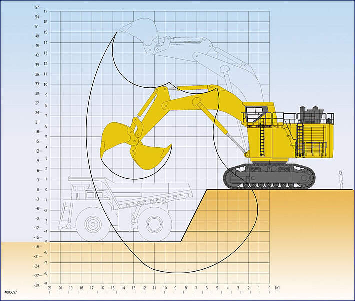反铲Backhoe最大挖掘高度15米,深度8米;最大卸料高度9.7米。正铲Front shovel最大挖掘高度17.69米,深度2.97米,最大卸料高度11.71米。