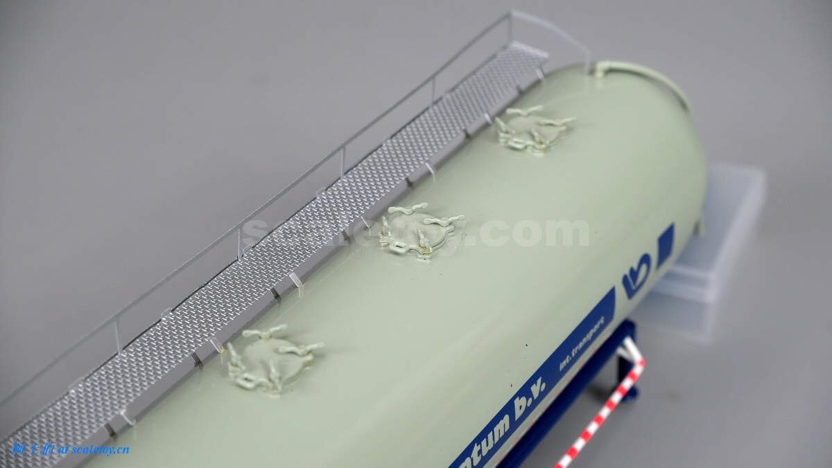 车顶的开口有麻花一样的紧固装置。步道和栏杆都非常的纤细,比一般罐车模型要纤细的多。