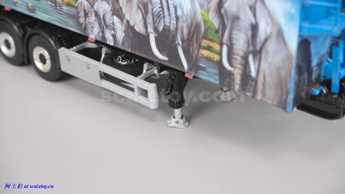 支腿可以调节高度,备胎挂在车下保险杠内