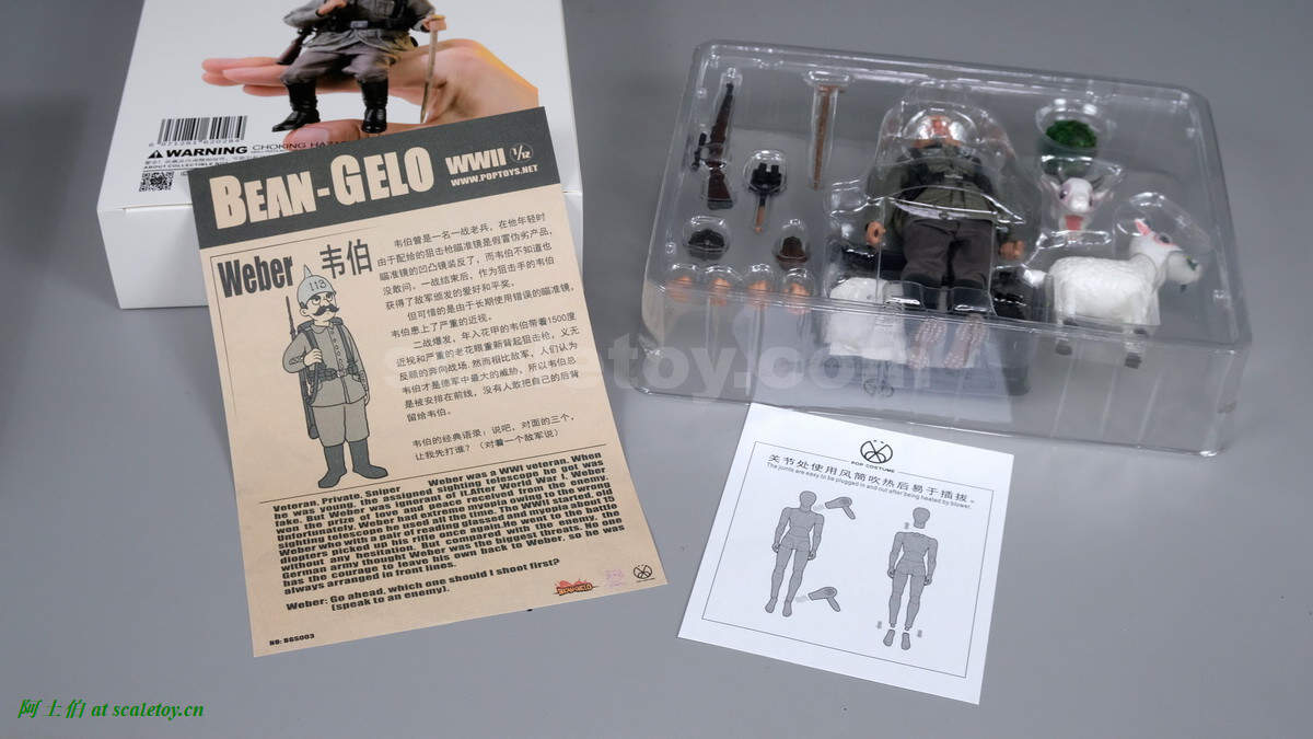 2020年,POPTOYS团队推出1/12比例全新可动人偶产品【BEAN-GELO大头兵】系列,旨在用一种诙谐,幽默的角度演绎二战。第一批推出的大头兵是三个德国兵,瘦子弗兰茨/胖子乔治/狙击手老头韦伯1:12可动人偶。