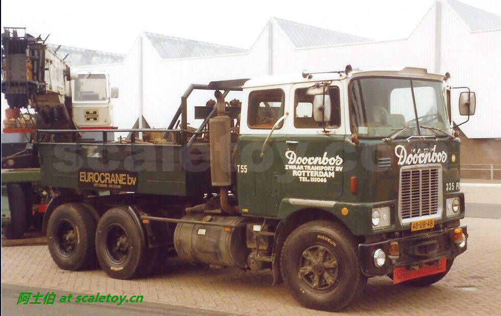 介绍一款历史经典车型,MACK F700三轴拖头。涂装是荷兰公司DOORNBOS。MACK是美国的一家重型卡车制造商,2001年被VOLVO收购。F系列是MACK的平头拖头的第三代产品,于1962年开始生产,1981年结束。F系列采用的发动机包括MACK自己的Maxidyne 和Thermodyne,康明斯,底特律柴油,以及卡特彼勒。