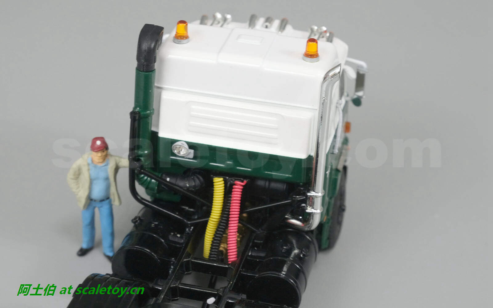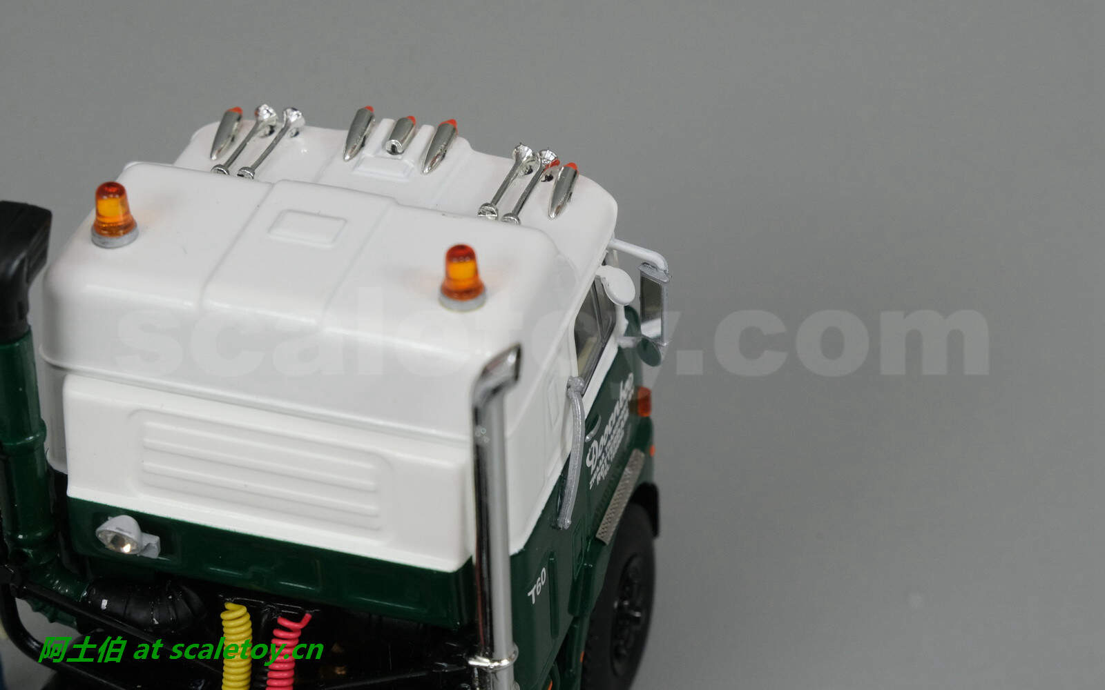 车顶是分高低有坡度的,斜面还有窗户,警示灯装饰灯外,四喇叭大音响~~~此外可以看到内部构件还是不错的,例如方向盘和下面的拨杆排挡等都是分色表示的。前脸上的文字图案也很丰富。前部也有前顶接口和插销。