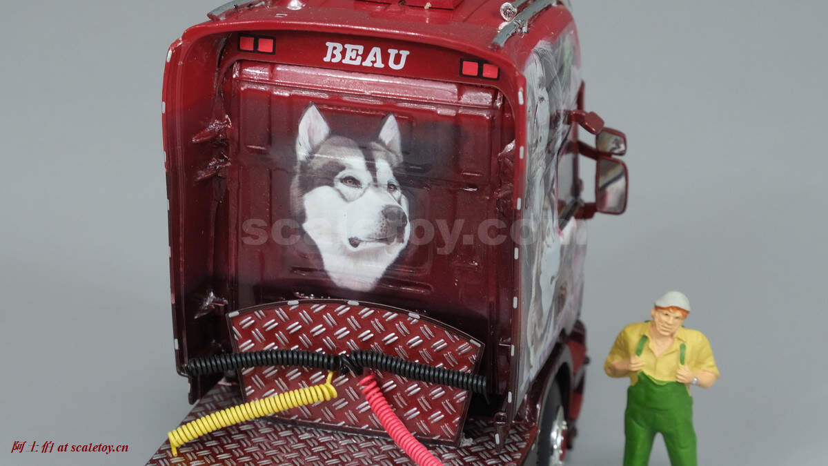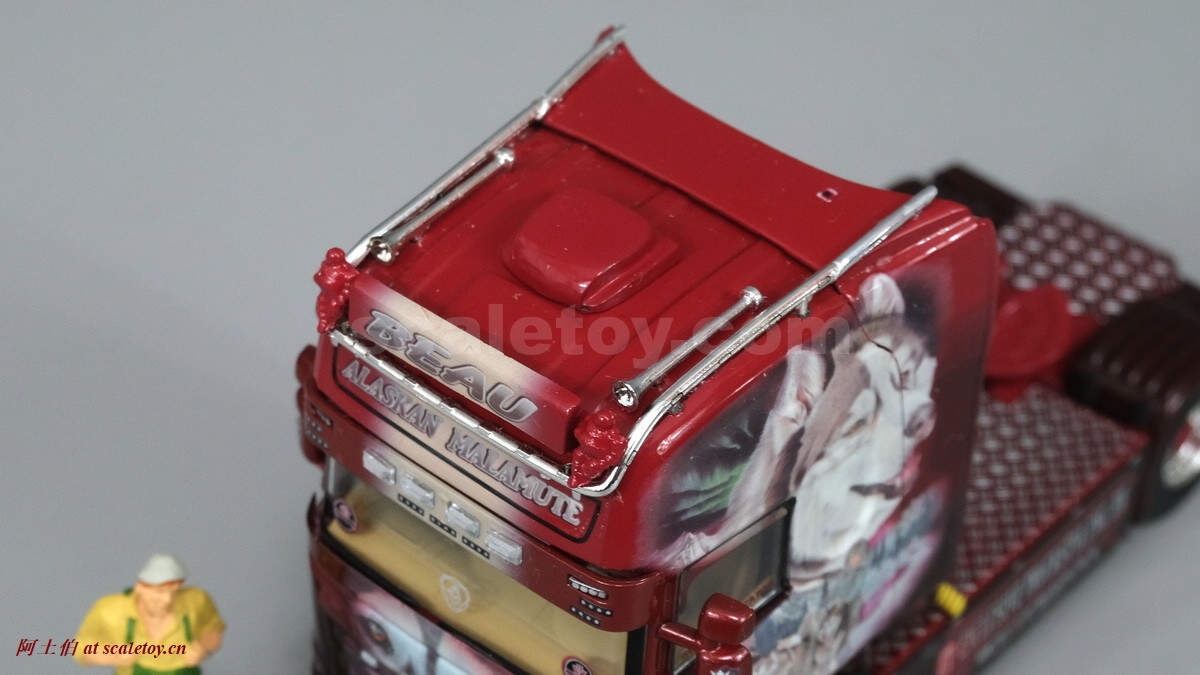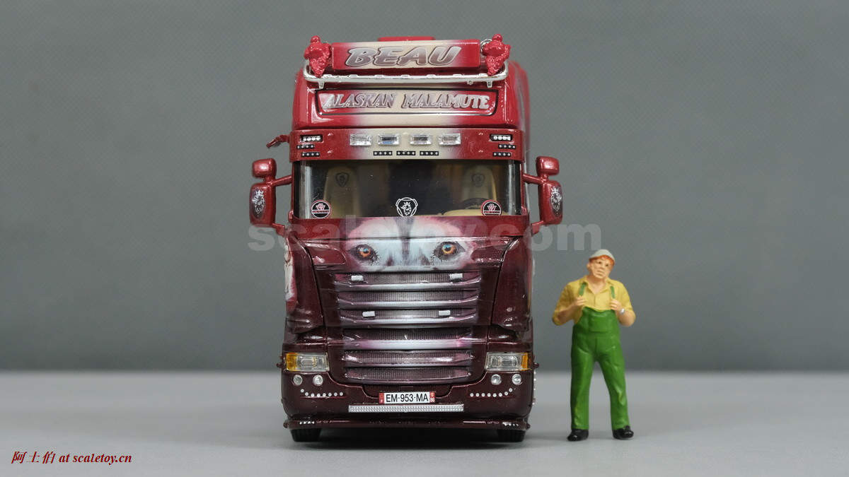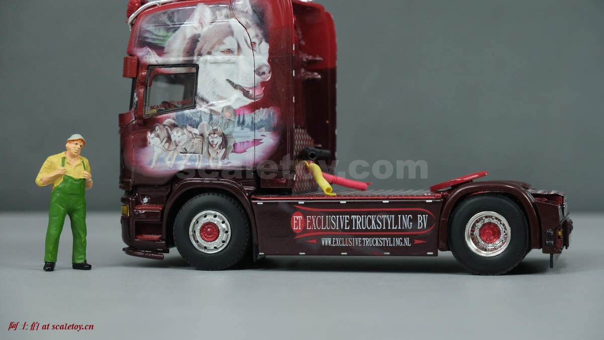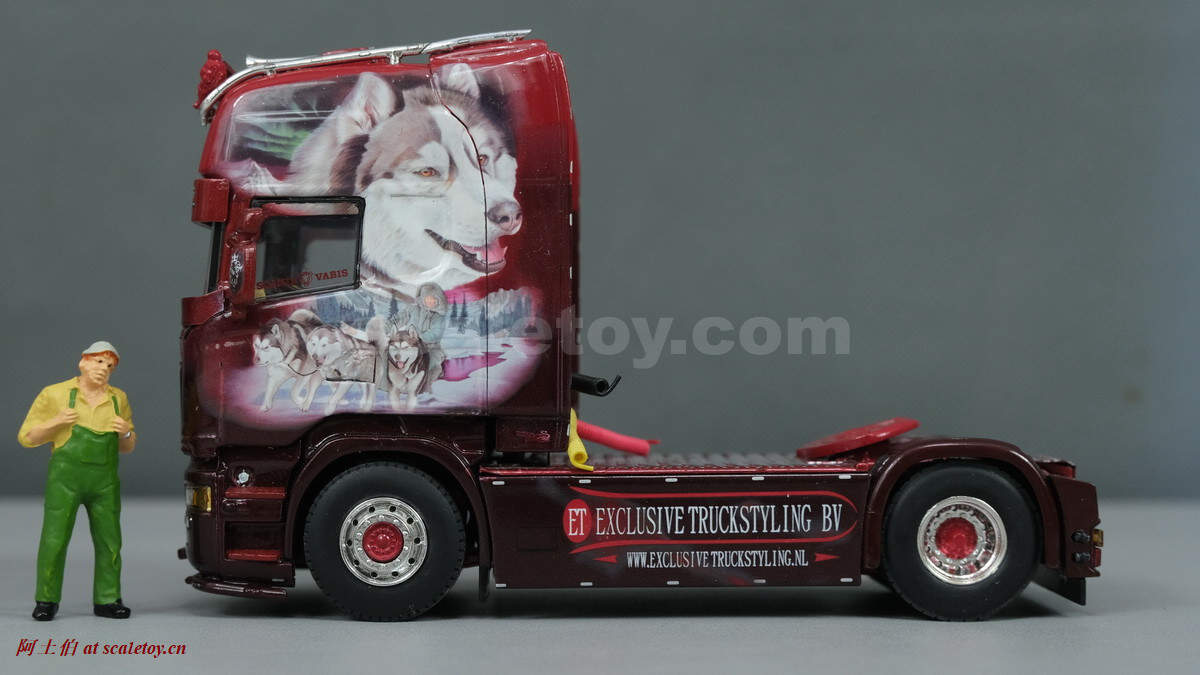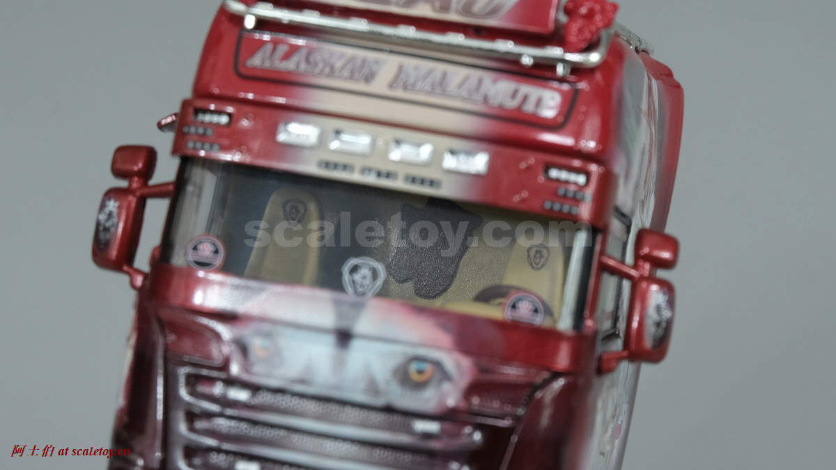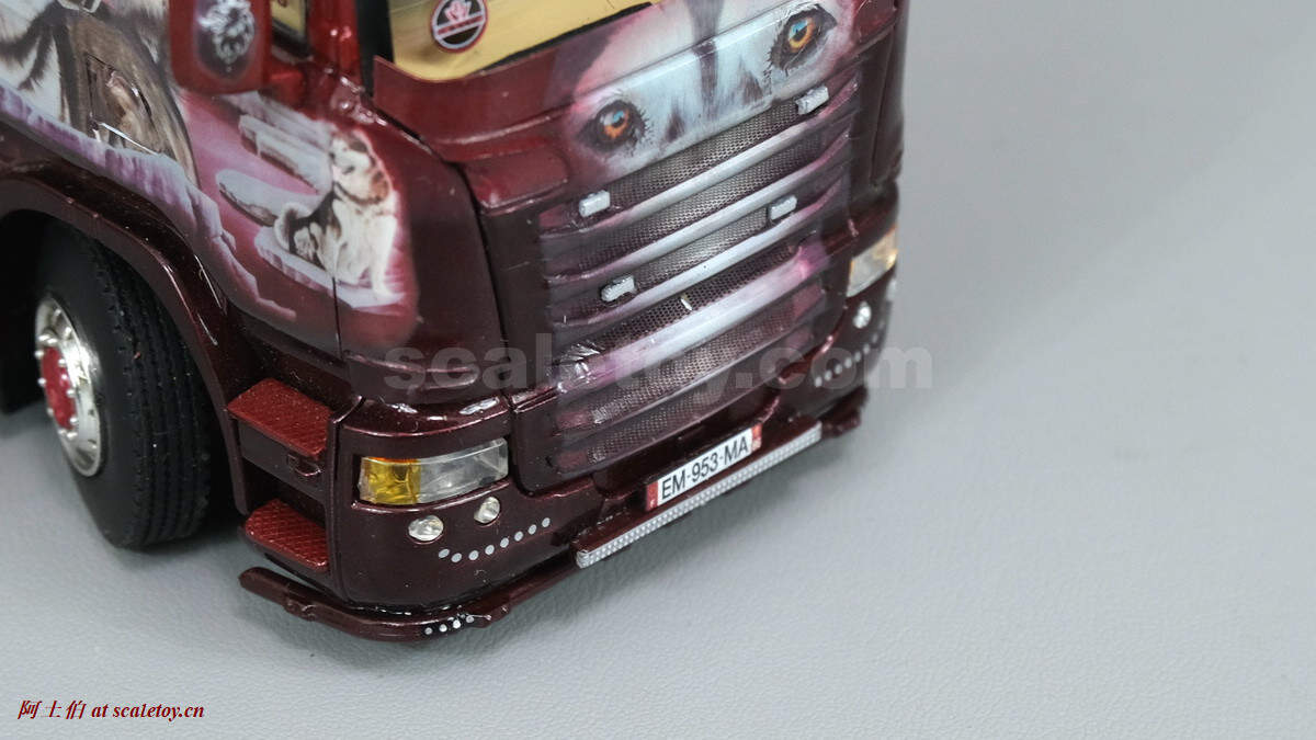 今天介绍的彩绘车辆涂装主题就是Alaskan Malamute,我想也是和冷藏运输的主题有点点关联吧。拖头是一台斯堪尼亚的STREAMLINE TOPLINE 4X2,挂车是3轴的冷藏厢式,主题彩绘主要集中在拖头,挂车是公司彩涂没有其他主题展现。
