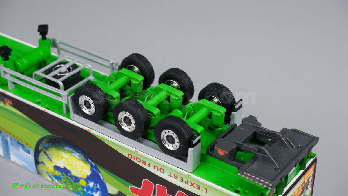 底盘,有个备胎在中间的架子上。三轴都不能转向,都带弹簧避震