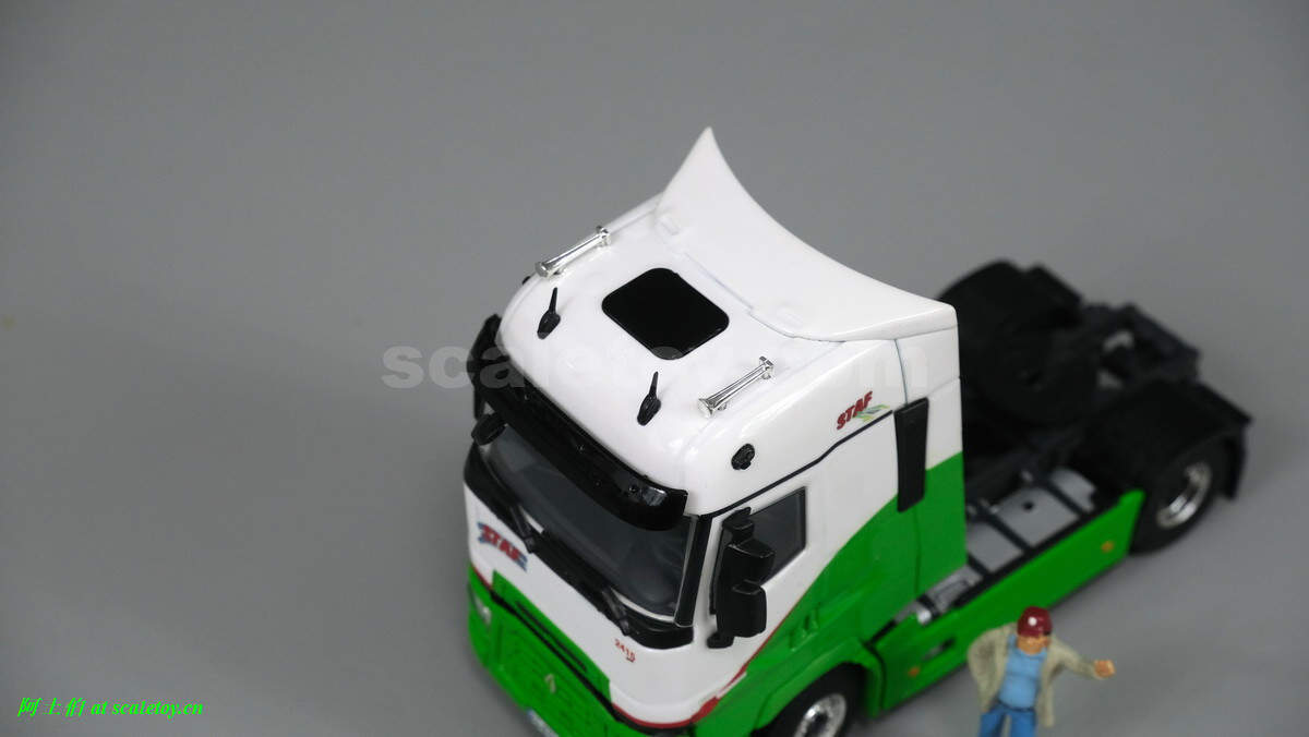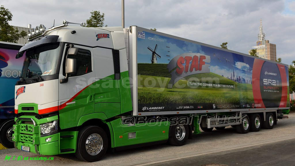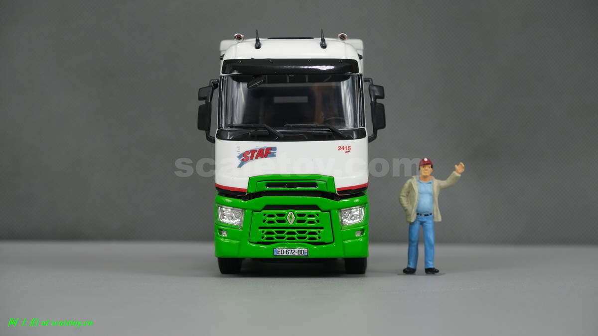 车头是近期出镜率较高的雷诺T系列高驾驶室,STAF的绿白主色调配色
