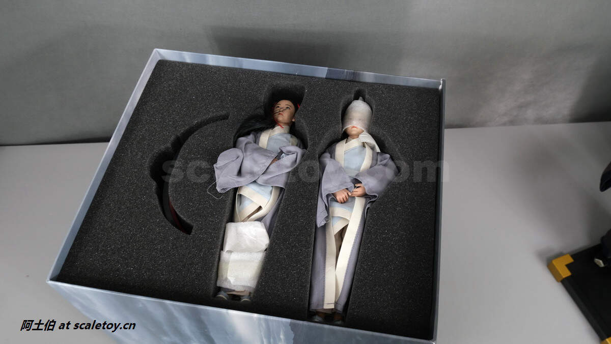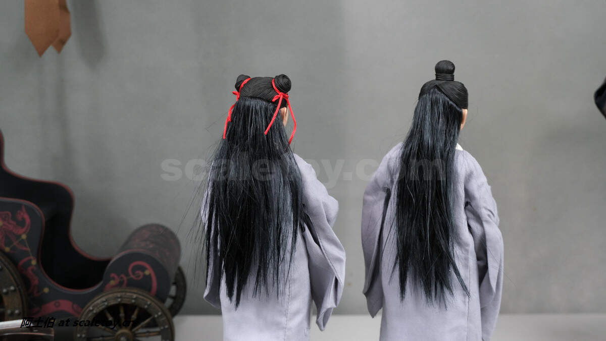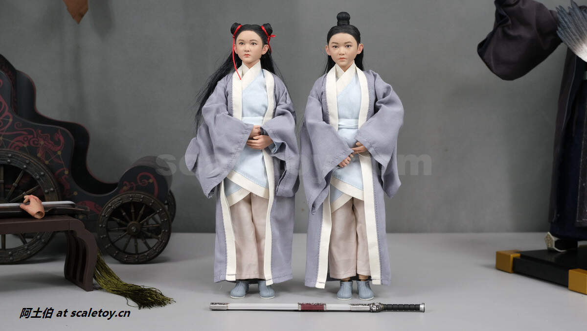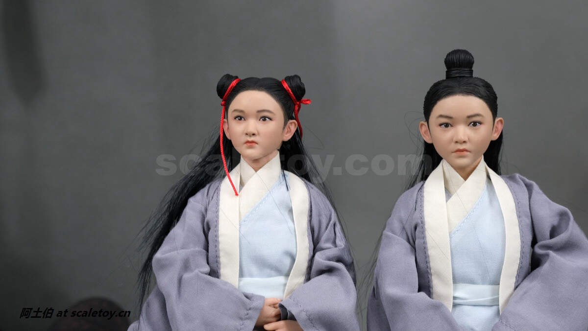 两位童子,也努力做了不同的发型。可分别抱琴、抱剑侍立。关节不可动