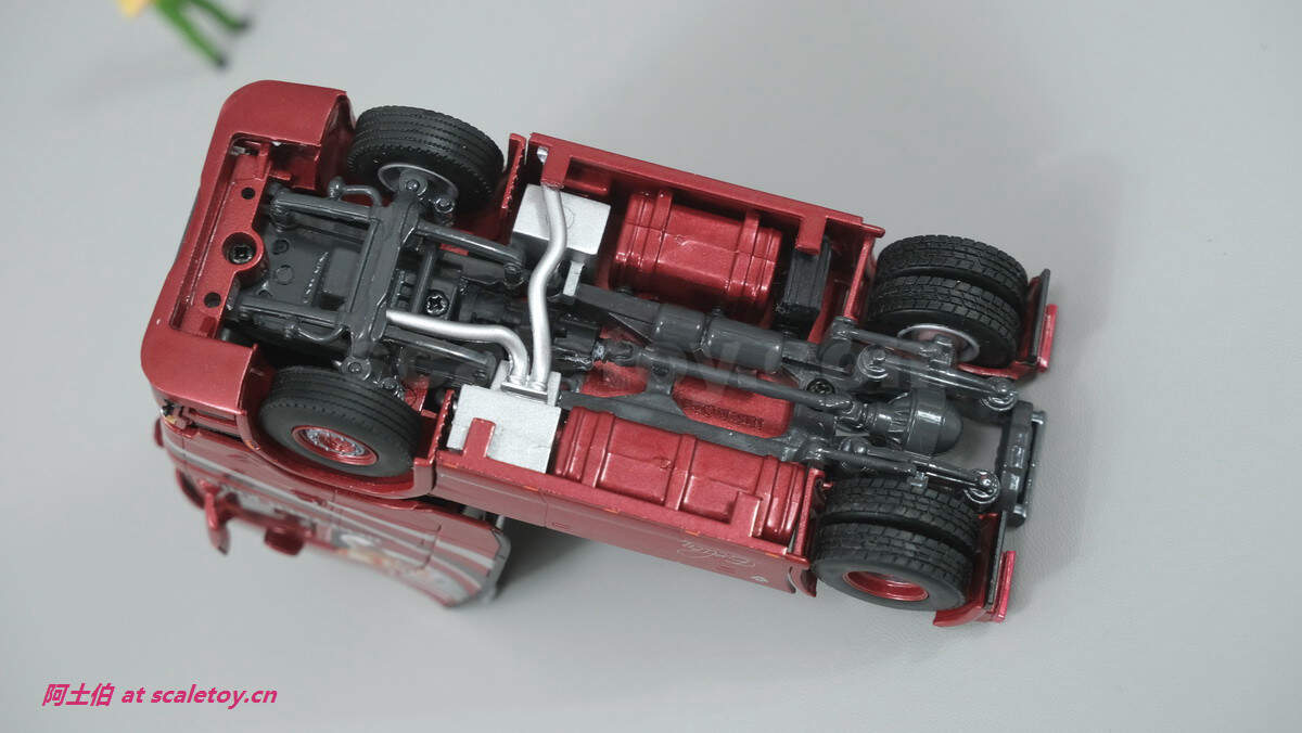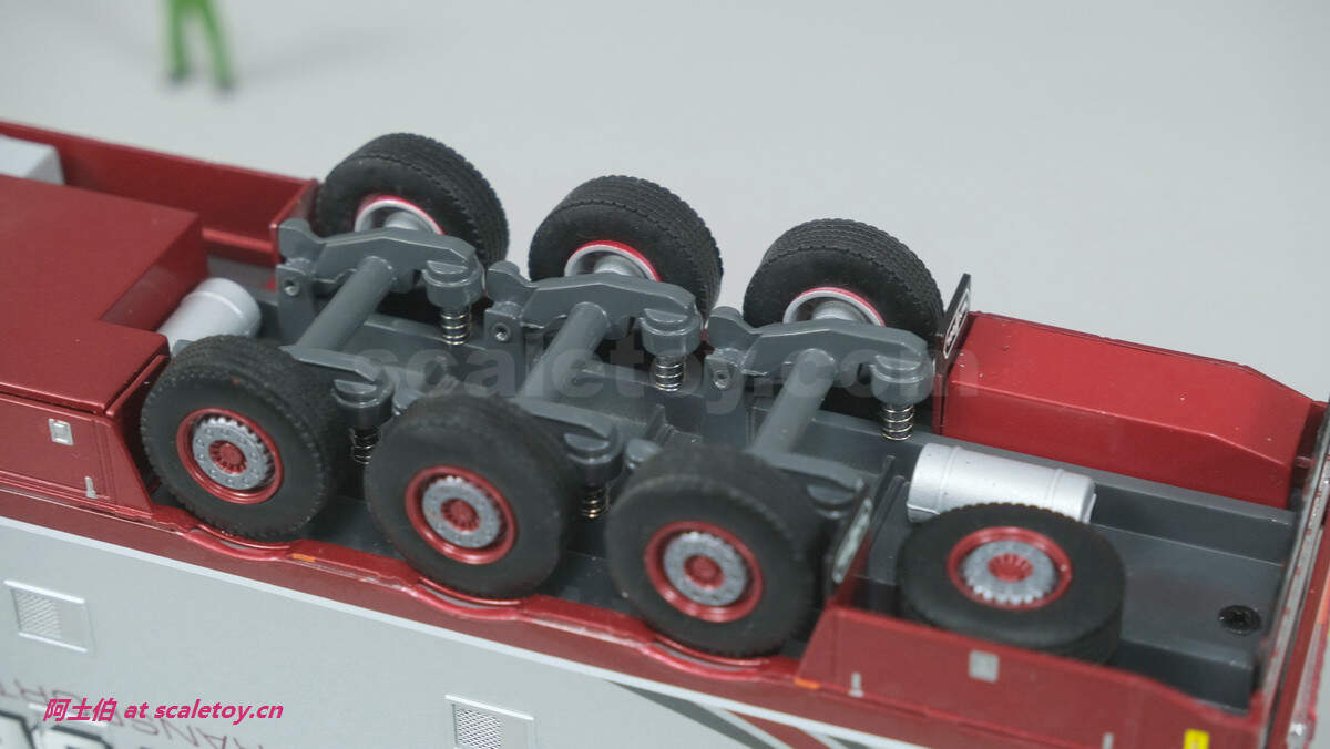 底盘,能看到止轮块、备胎等,三轴不可转向,都带弹簧避震